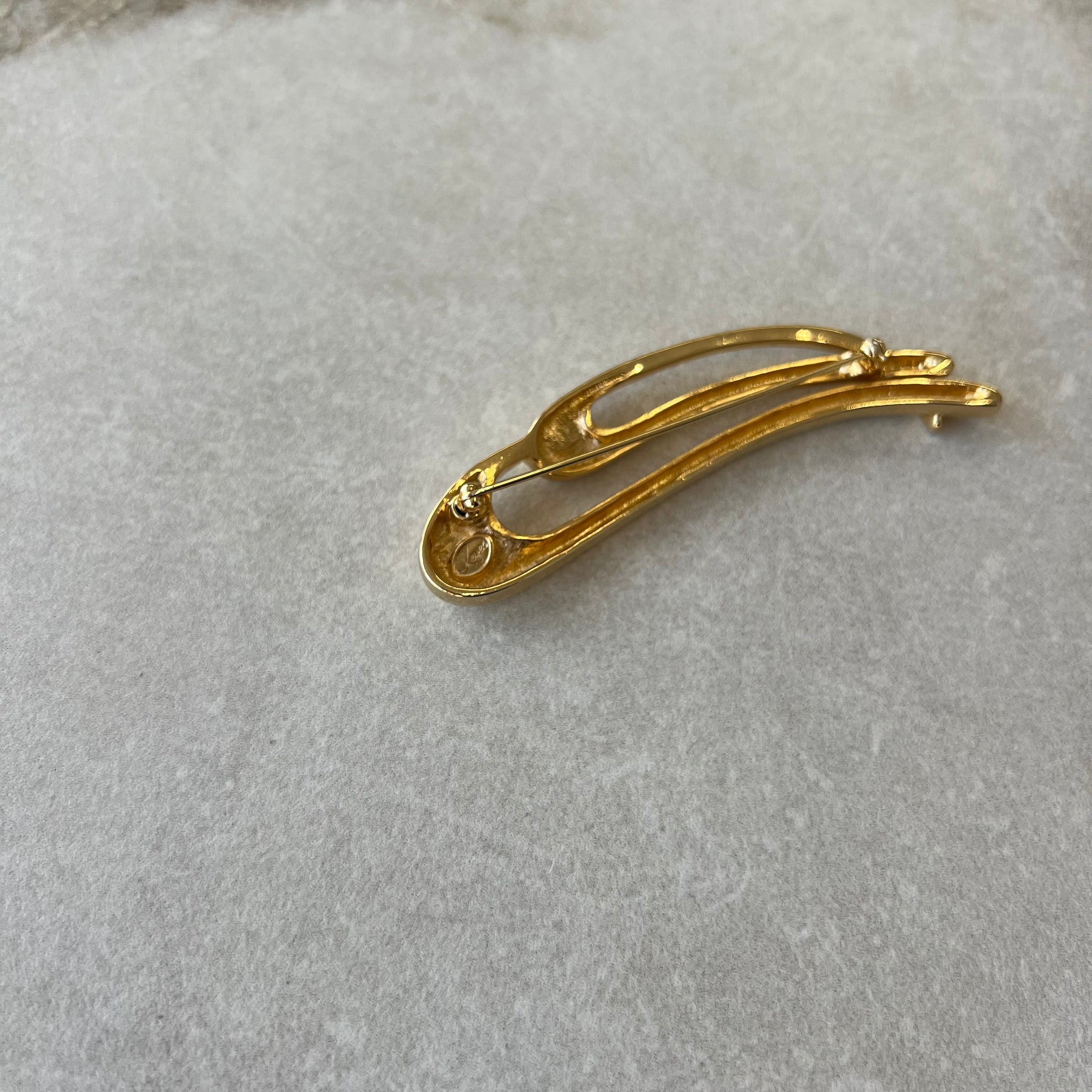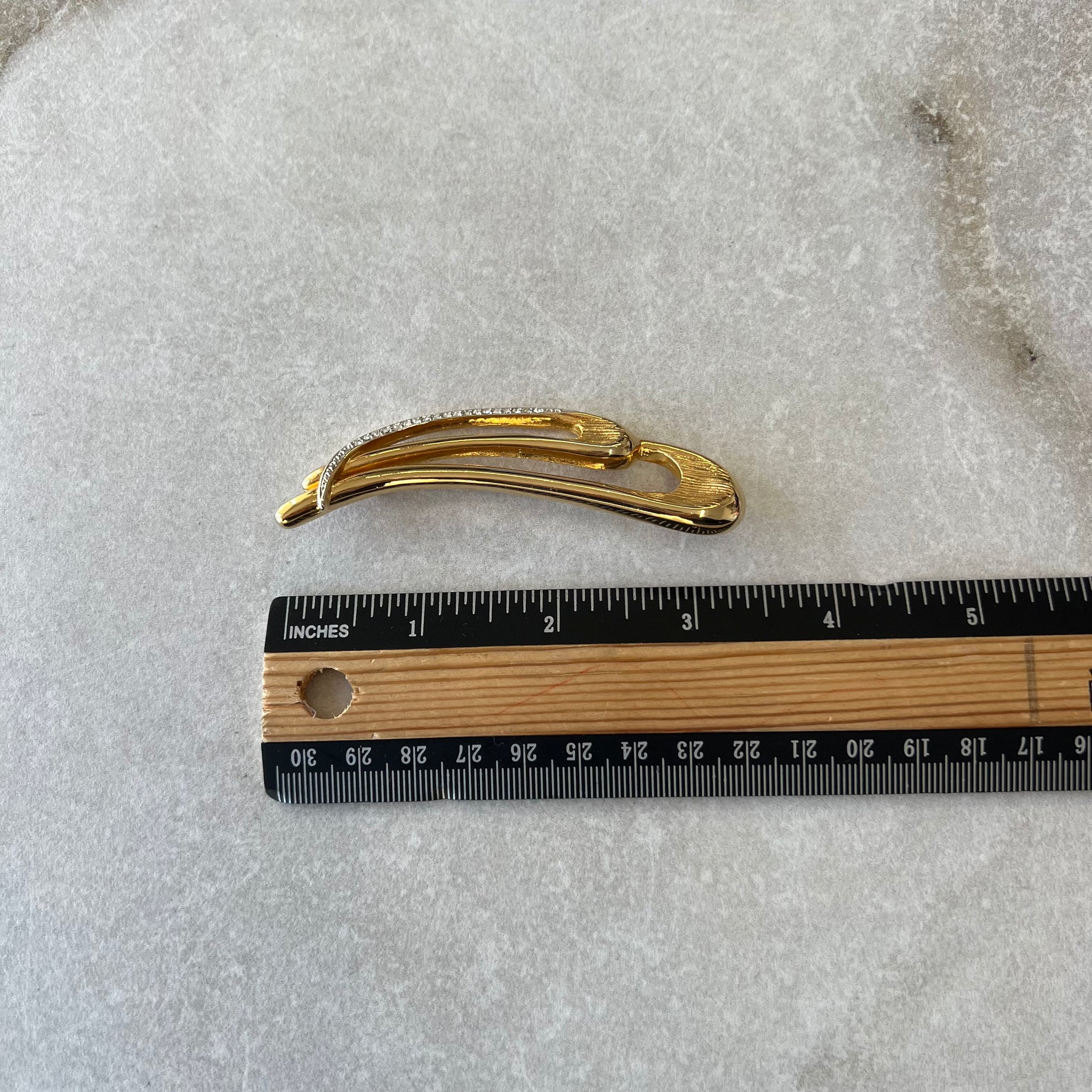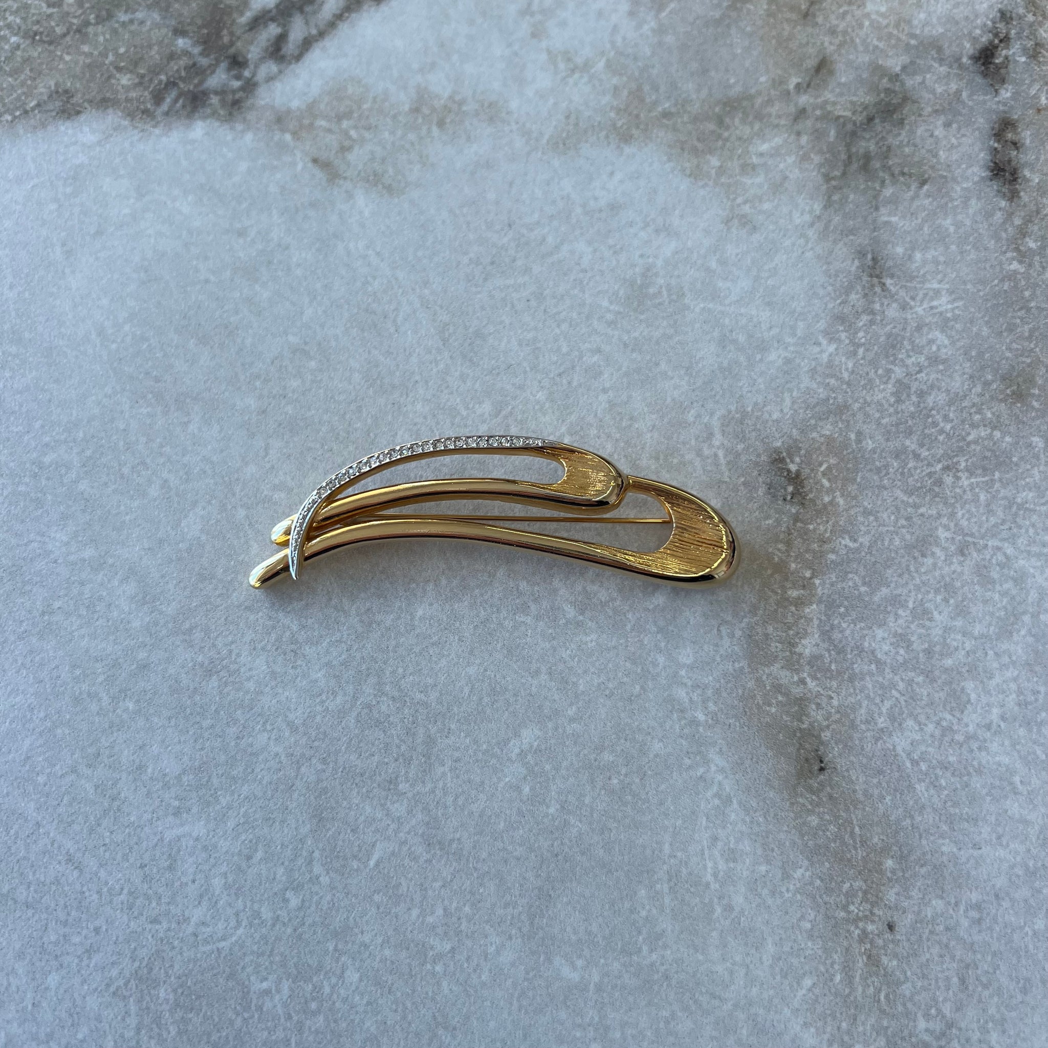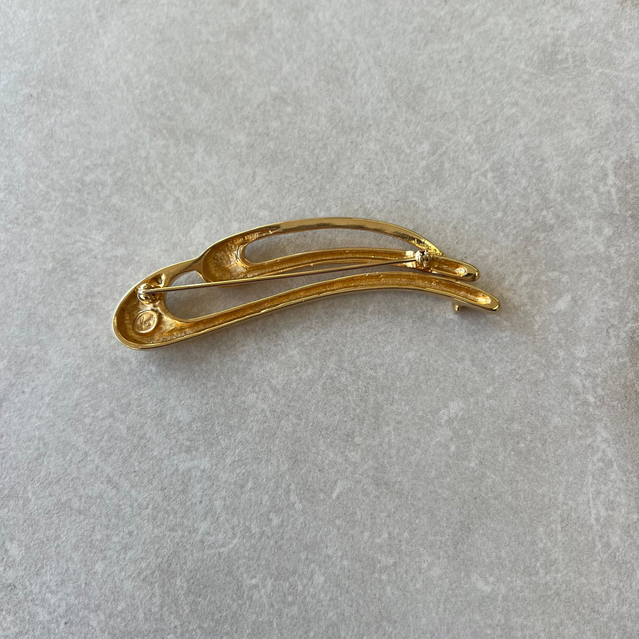 Broche dorée longue courbée avec décorations scintillantes de la marque Keyes.