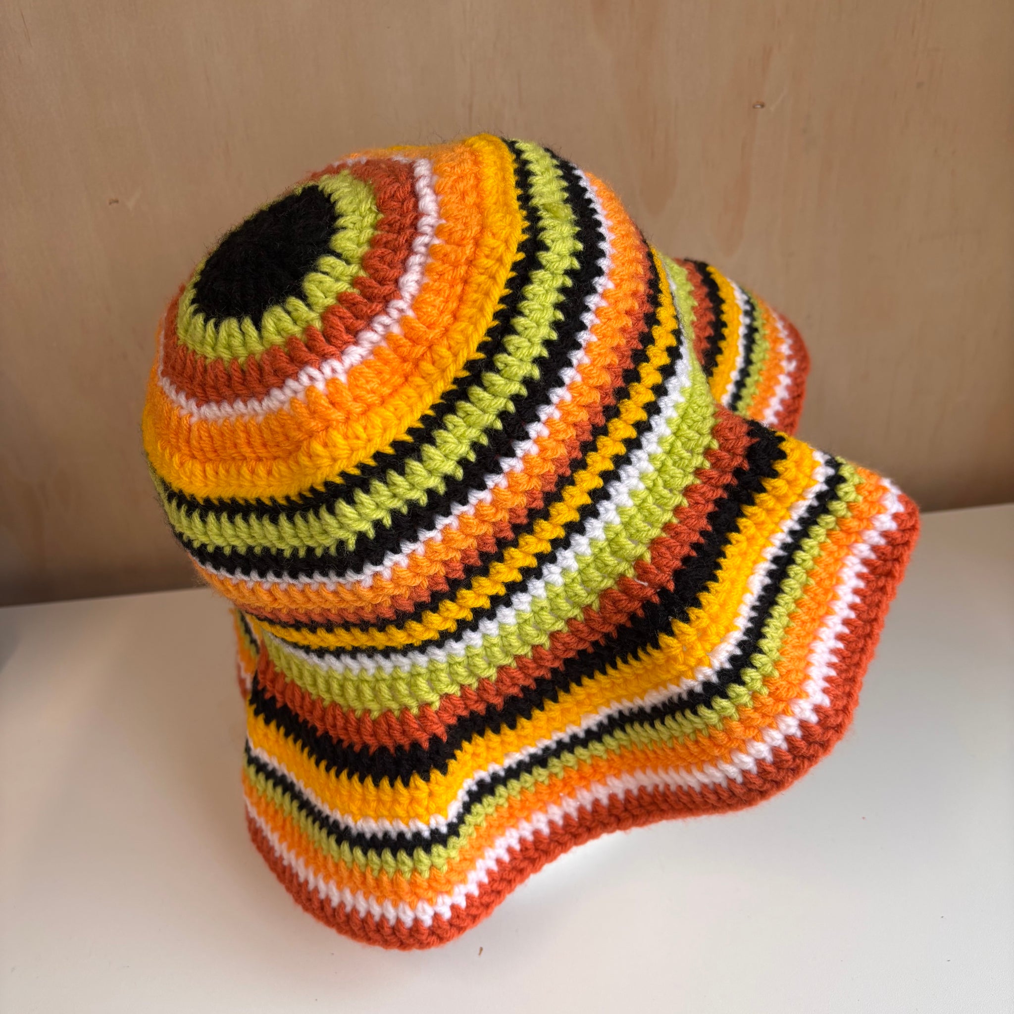 Magnifique chapeau tricoté avec différentes couleurs.