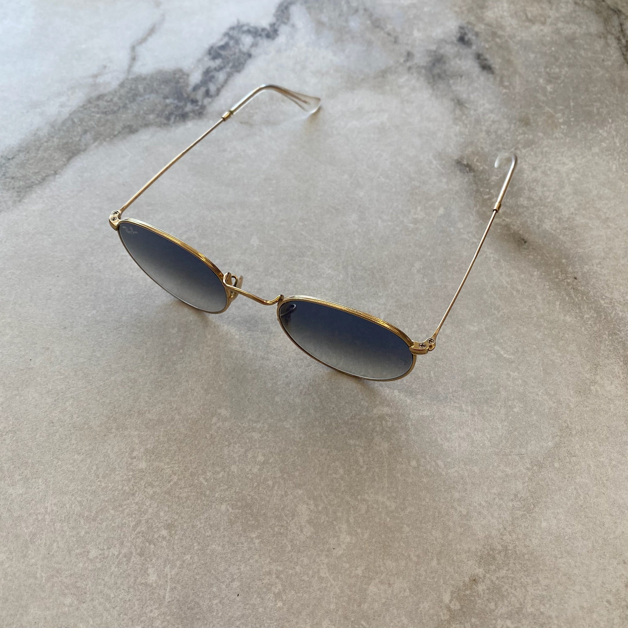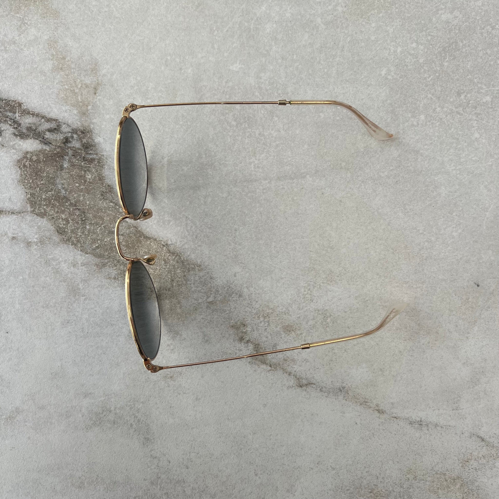 Lunettes de soleil signées Ray-Ban modèle classique Round Metal. Monture en métal doré avec verre teintés bleus. D'une valeur de plus de 230$. Aucune prescription