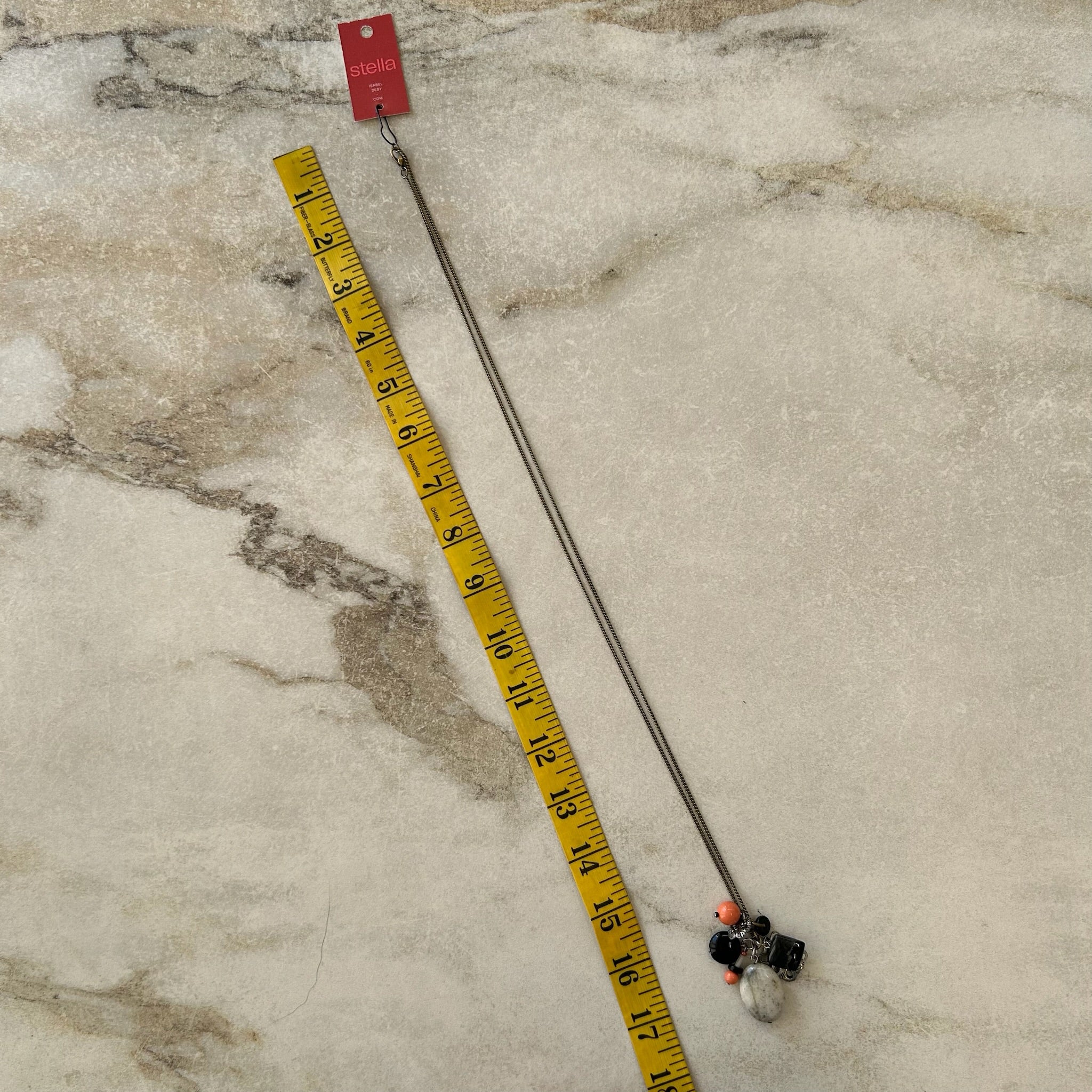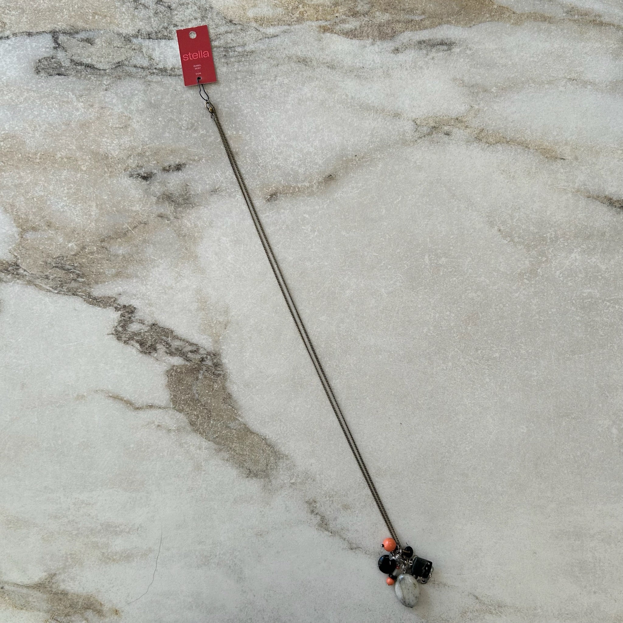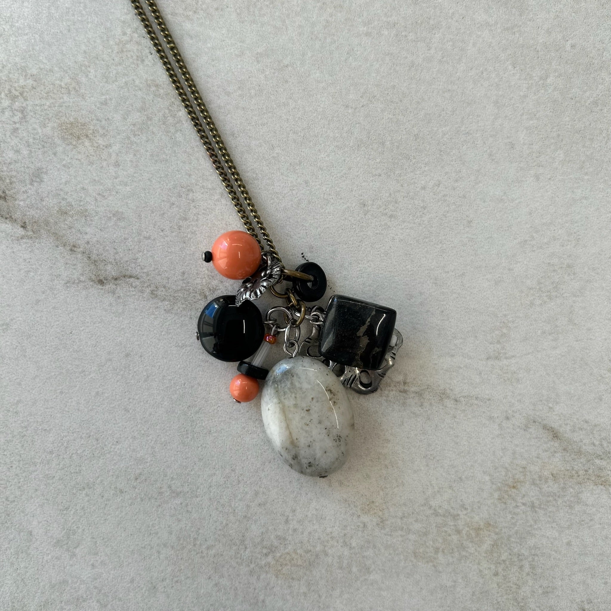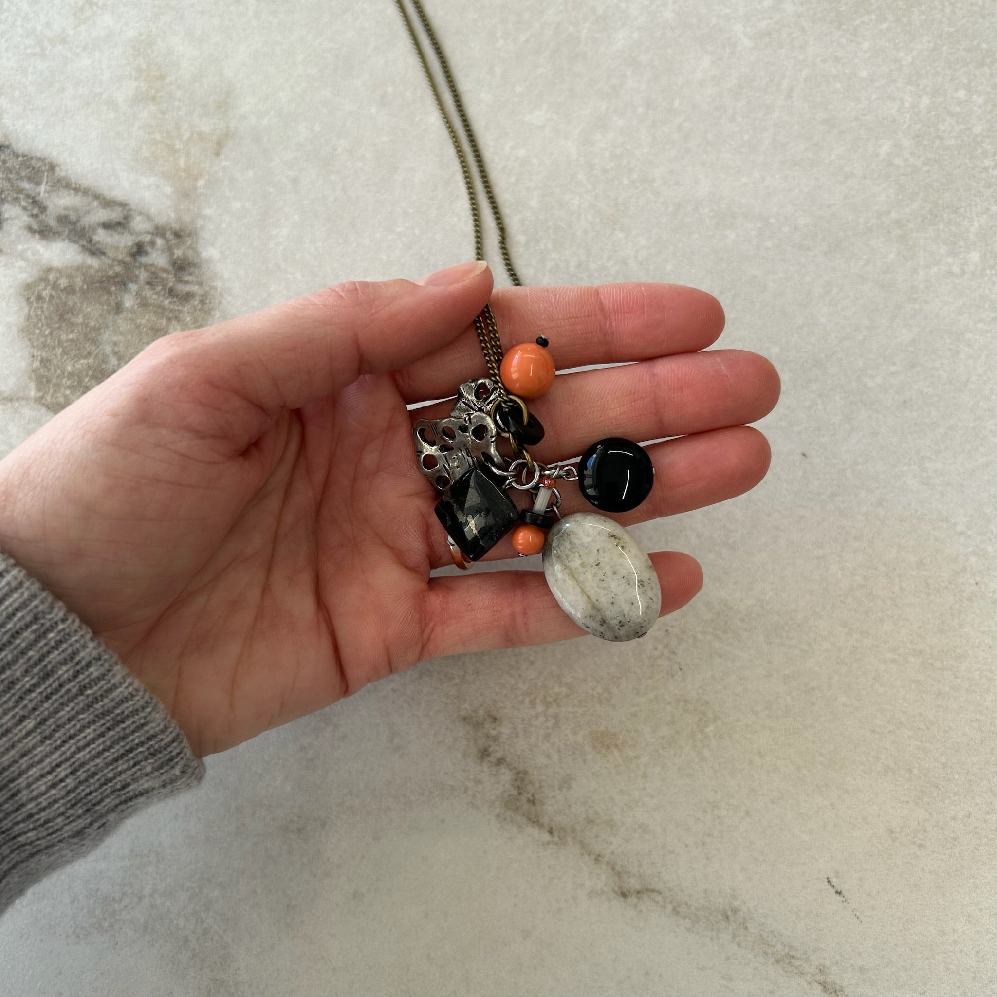 Collier artisanal #3502 fait au Québec de la marque Stella par Isabel Désy. Pendentif grappe de pierres semi-précieuses et verre et breloques métal, chaîne inox longue.