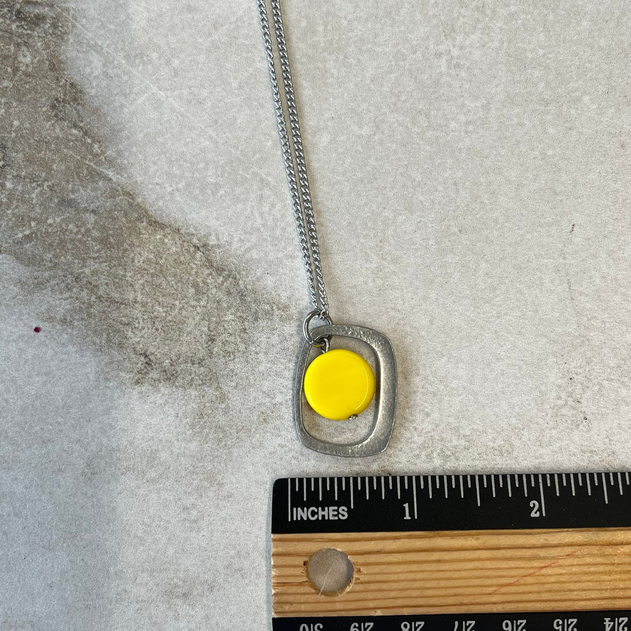 Chaîne en inox de couleur argent avec 2 breloques dont une en étain et une breloque jaune.