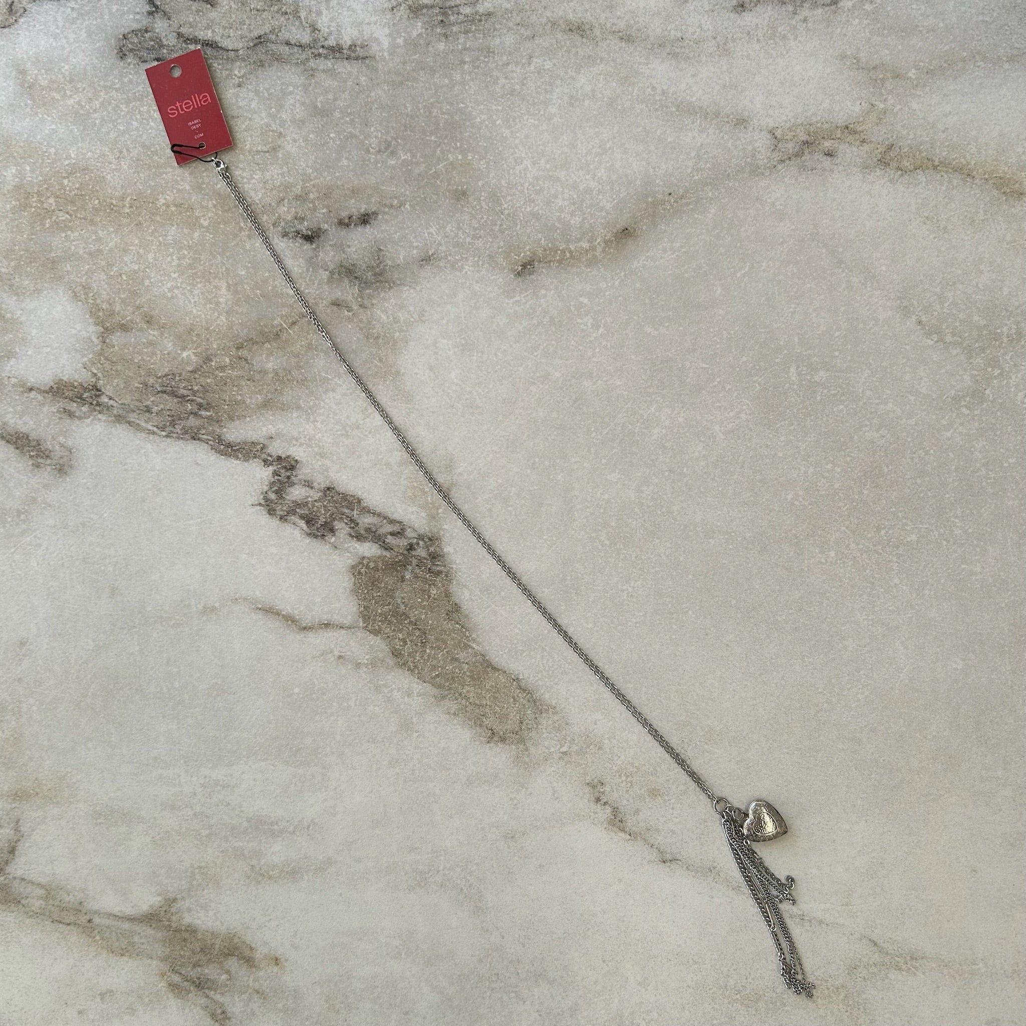 Collier artisanal #3570 fait au Québec de la marque Stella par Isabel Désy. Pendentif long avec frange de chaînes et pendentif de cœur qui s'ouvre, chaine longue.