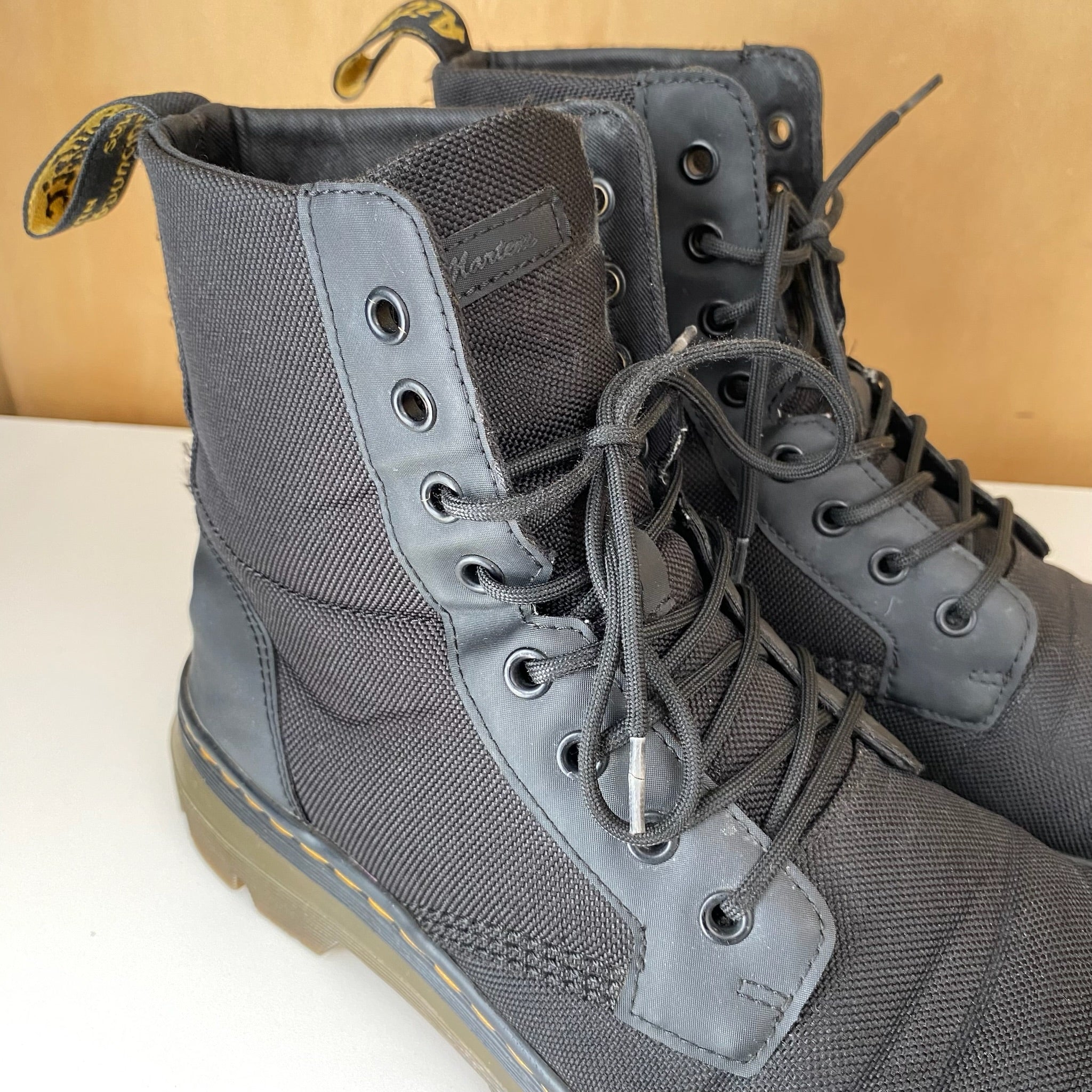 Bottes unisexe de la marque Dr Martens modèle COMBS. Avec 8 œillets, allie des matériaux poids plume comme le cuir synthétique et le nylon robuste à un cousu Goodyear à toute épreuve. Dotée de la semelle à coussin d’air AirWair emblématique, résistante à l’huile et aux graisses, anti-usure et antidérapante. Avec surpiqûre jaune classique. D'une valeur de 150$.