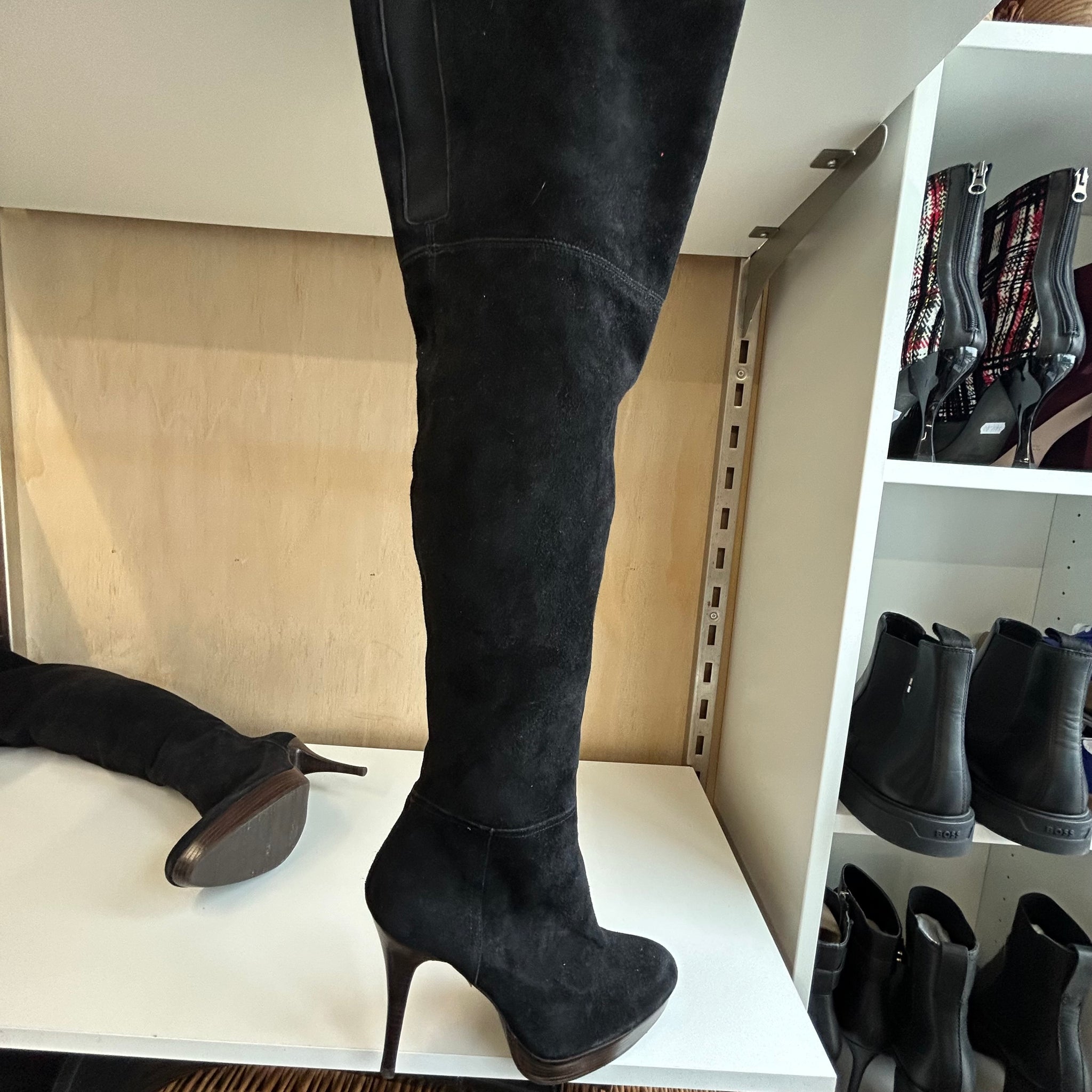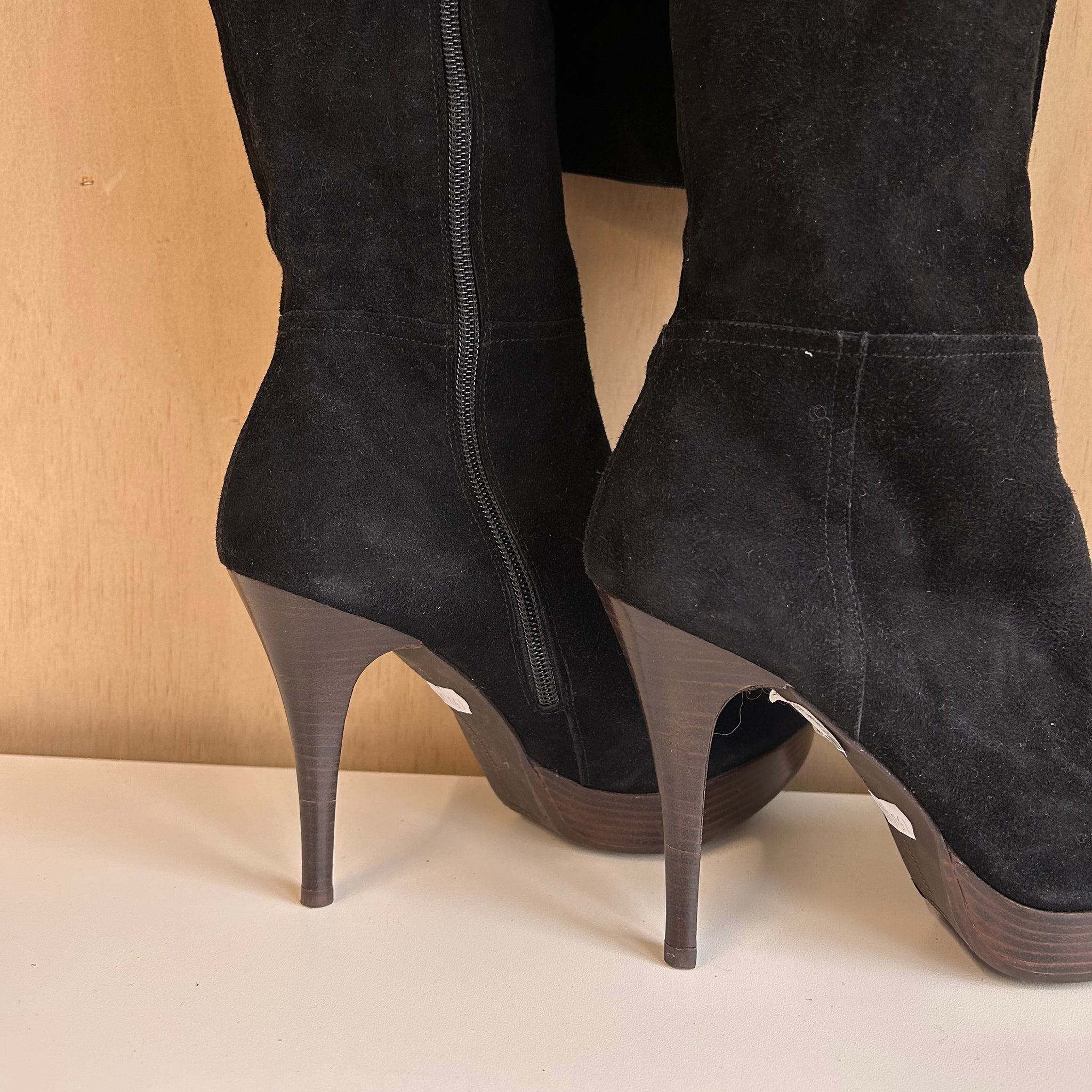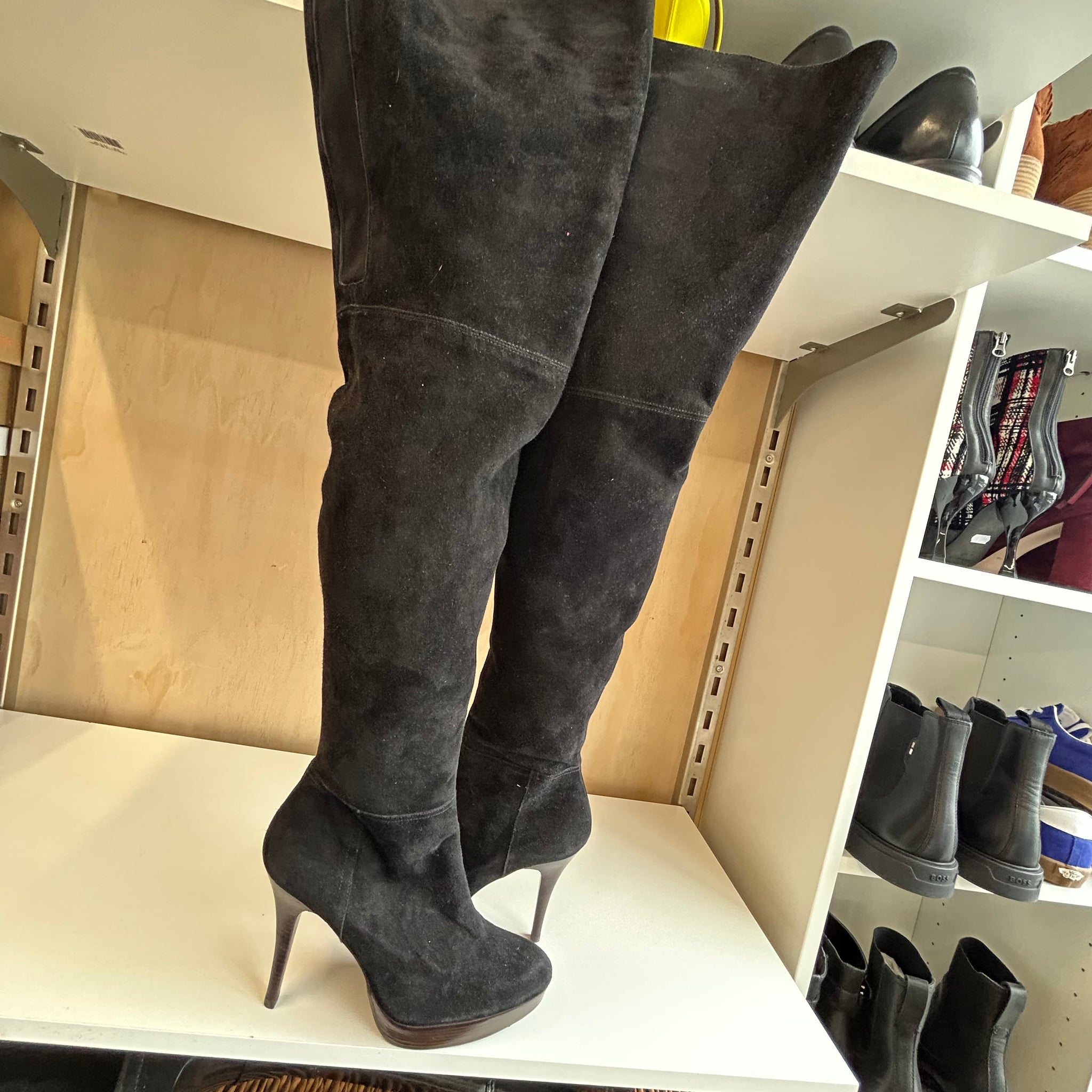 Bottes à talon aiguille Stuart Weitzman, avec fermeture éclaire, monte jusqu'aux genoux. D'une valeur de 865,00$.