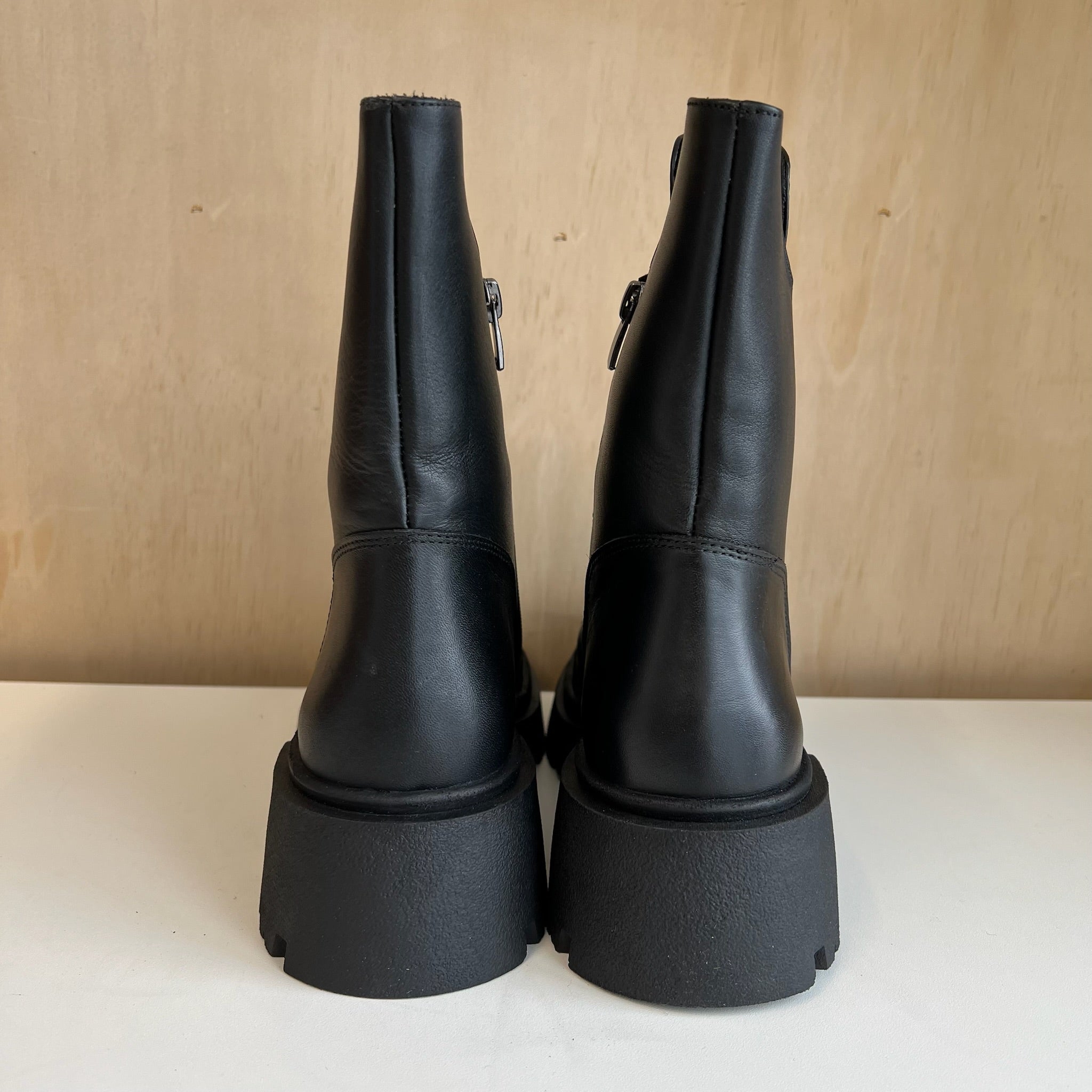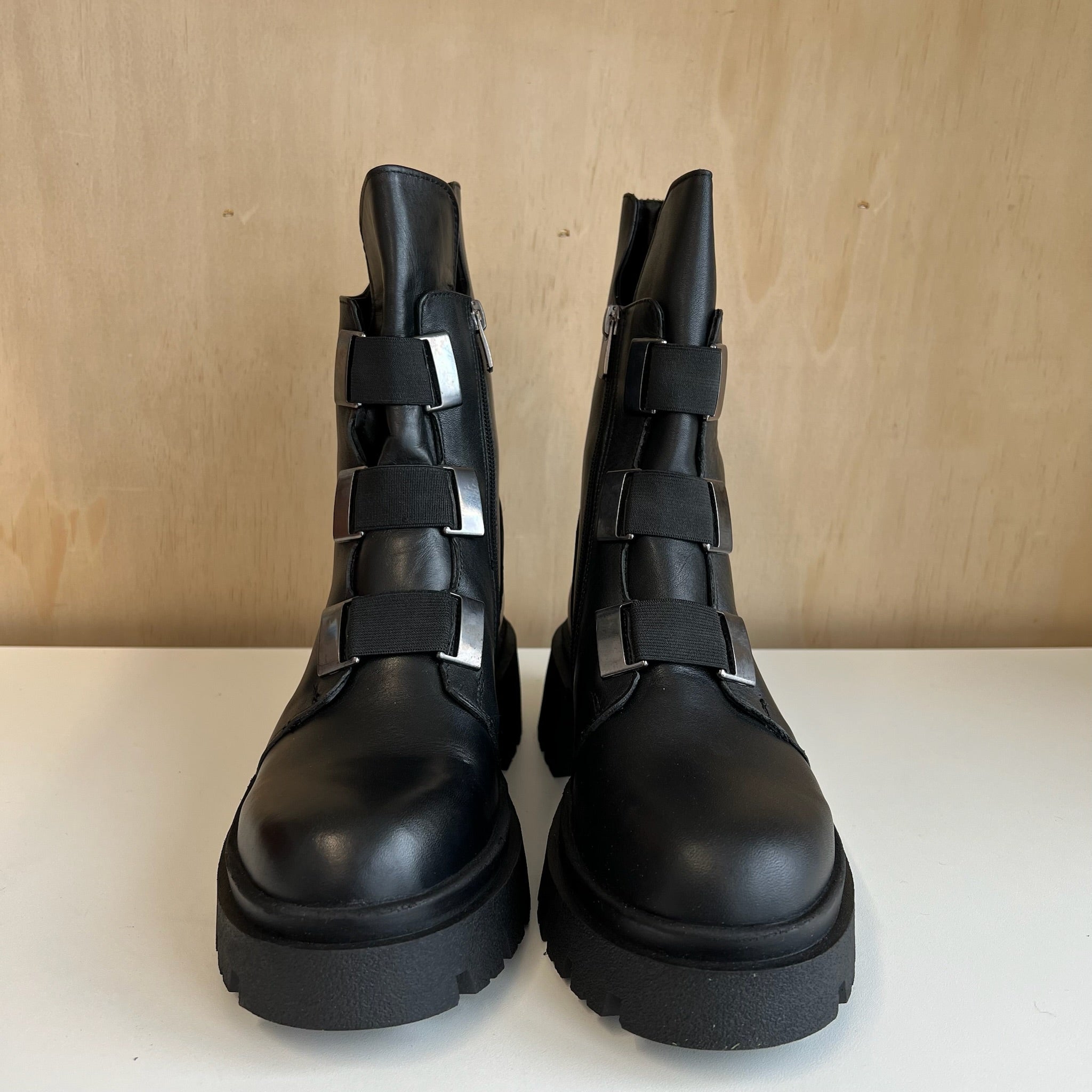 Bottes femme de la marque Tyche modèle Radar Black Smooth. De style combat boot. Avec trois bandes décoratives, fermeture éclair sur les cotés et talon. Avec doublure. D'une valeur de plus de 200$.