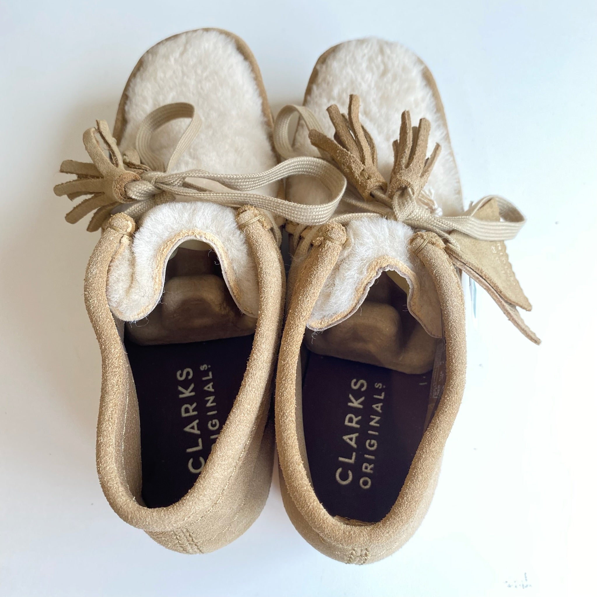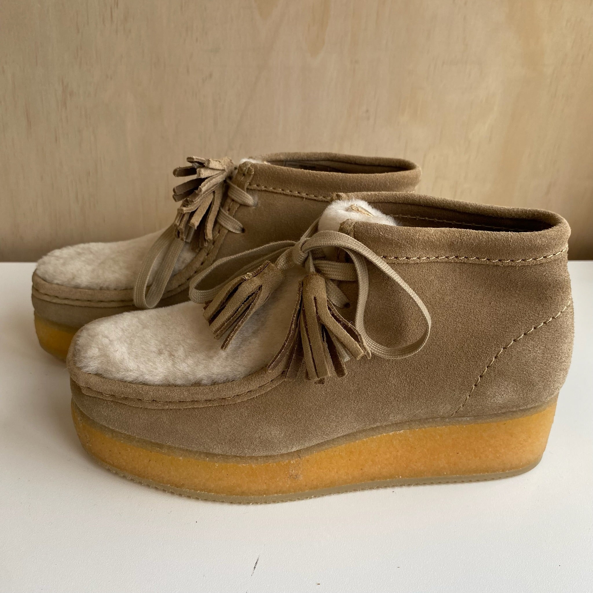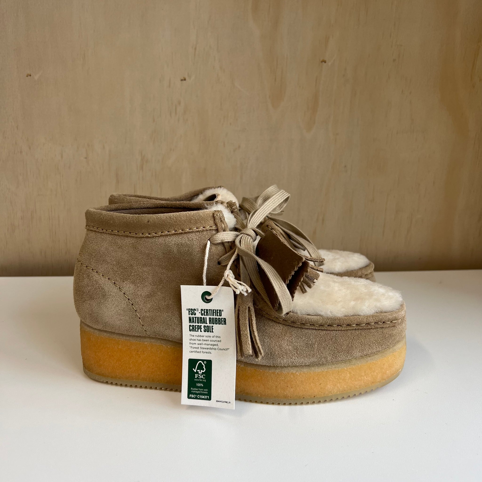 Bottines de la marque Clarks modèle talon compensé Wallabee en suède et en sherpa. Version revisitée d'un classique authentique de Clarks Originals, la Wallabee Wedge ajoute de la fourrure à son empeigne en daim beige clair de qualité supérieure pour parfaire l'esthétique automne-hiver. Ce modèle comporte une semelle compensée en EVA enveloppée d'un crêpe de caoutchouc certifié par le Forest Stewardship Council® et une semelle d'usure en caoutchouc pour la flexibilité et la traction; ici, avec un talon compensé de 3,6 cm pour rehausser la silhouette. D'une valeur de 270$.