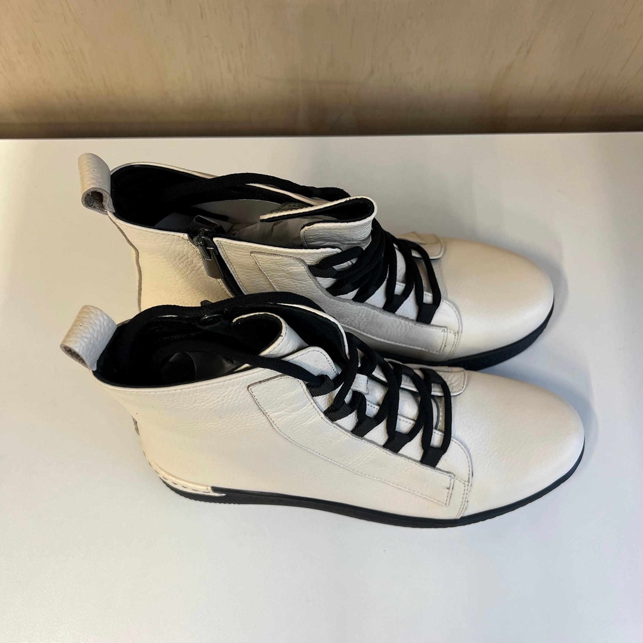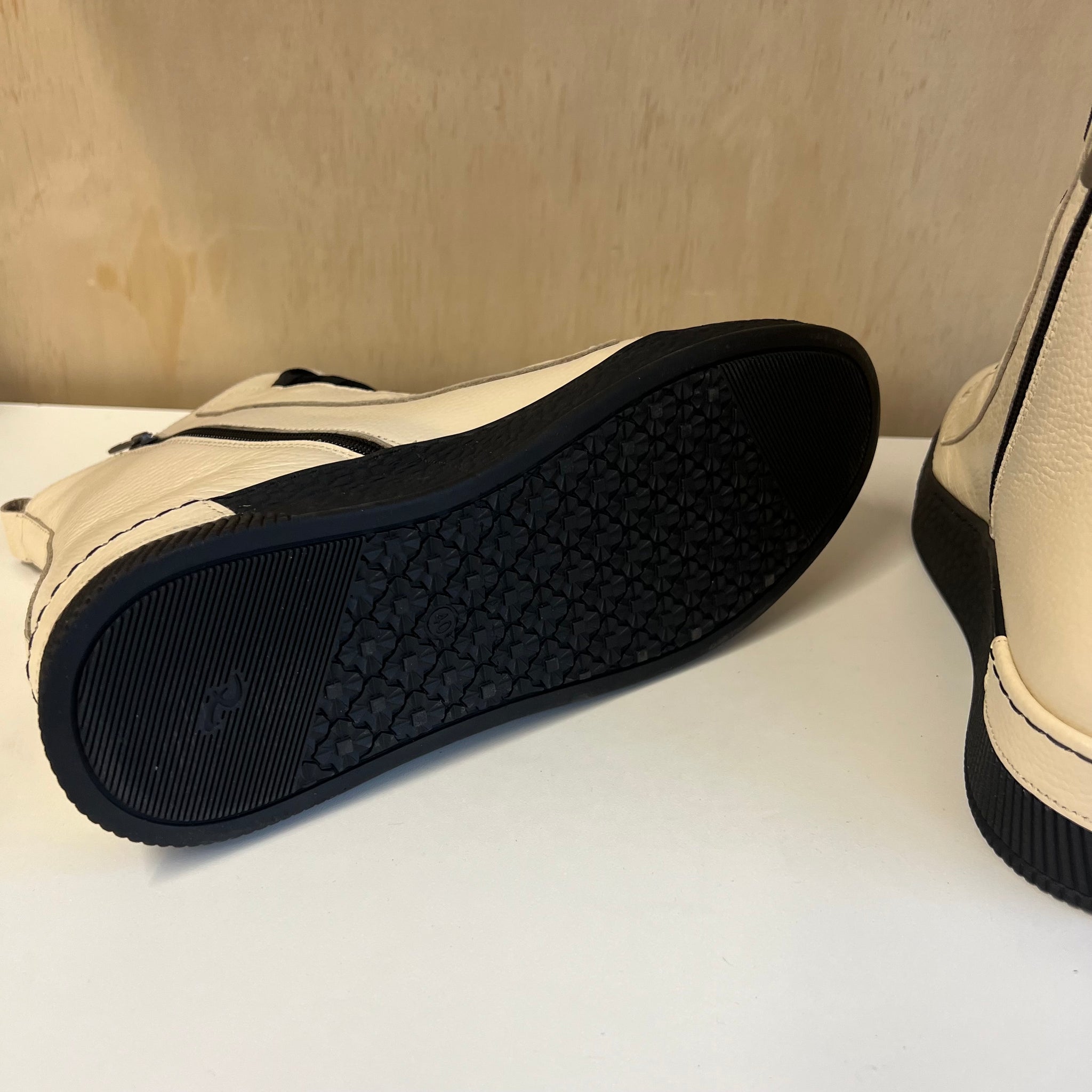 Bottes en cuir pour femme de la marque Tyche modèle Harbor Off White. Avec doublure intérieure, fermeture éclair sur le coté et lacets. Avec semelle compensée (environ 2 pouces). D'une valeur de 185$.