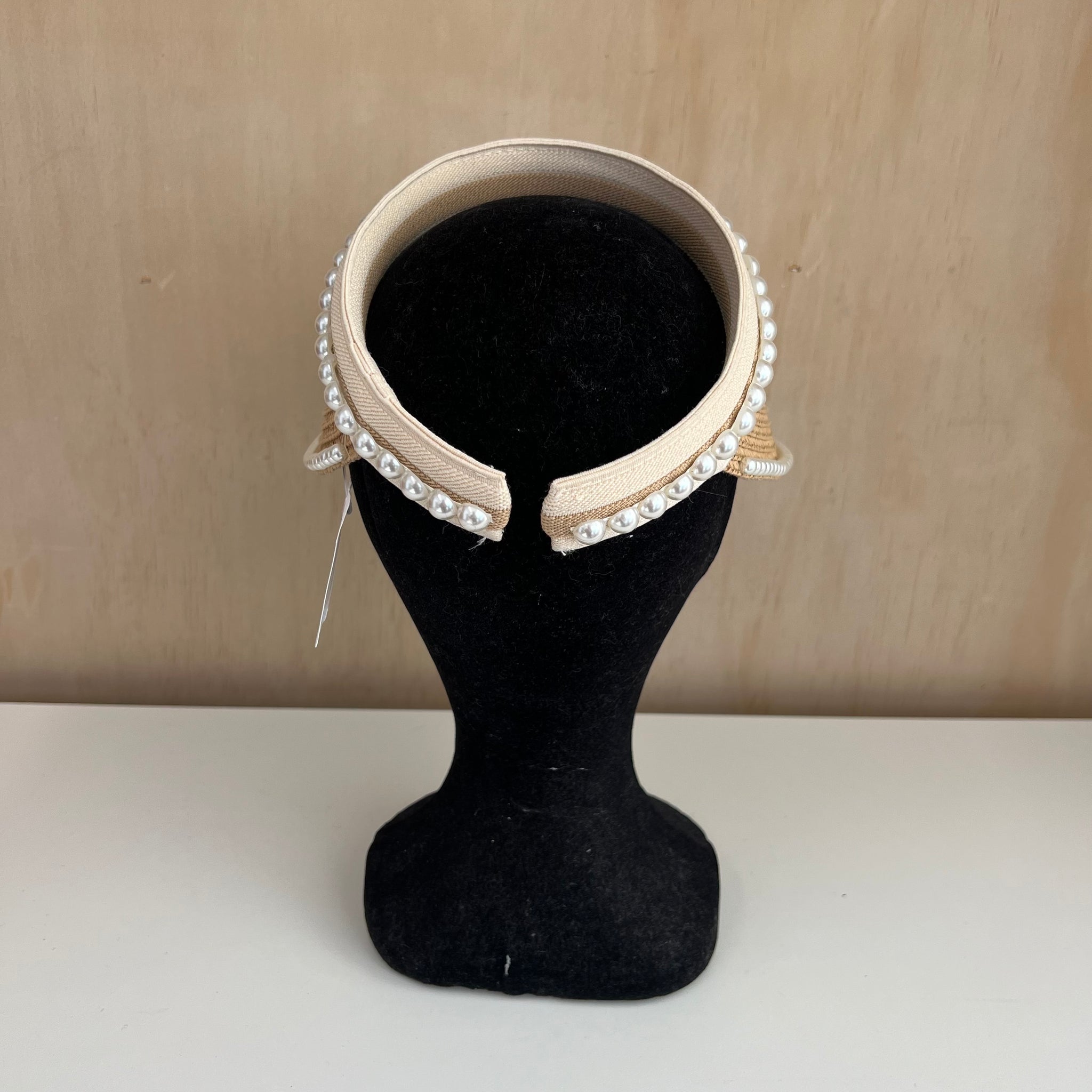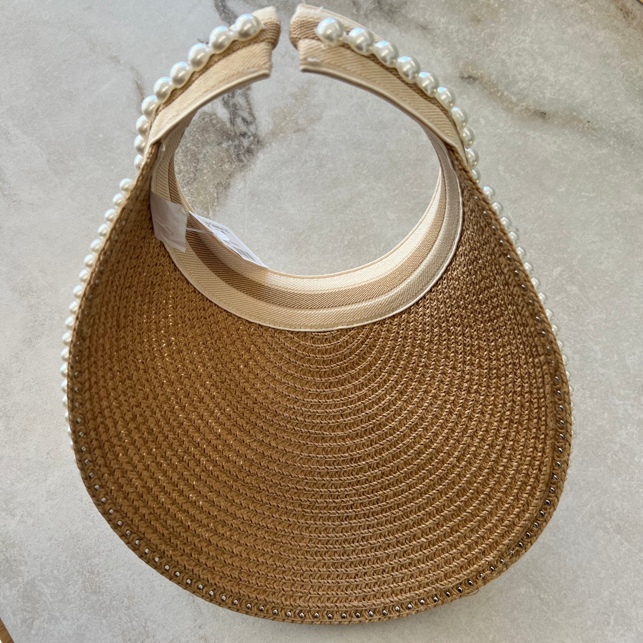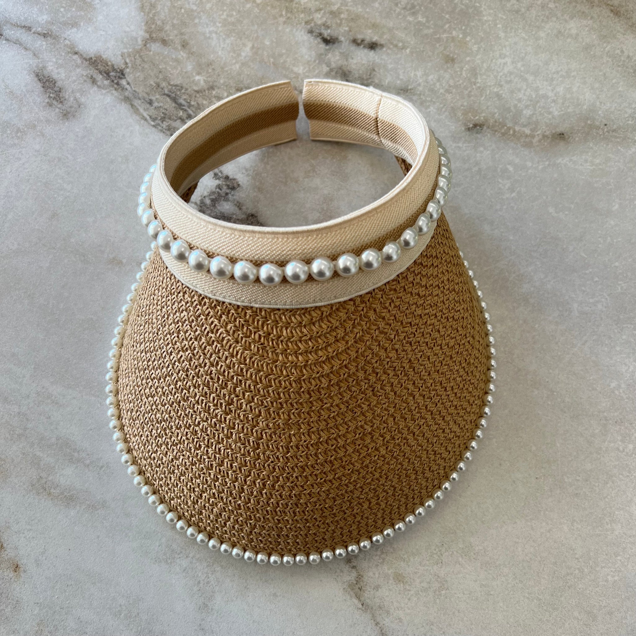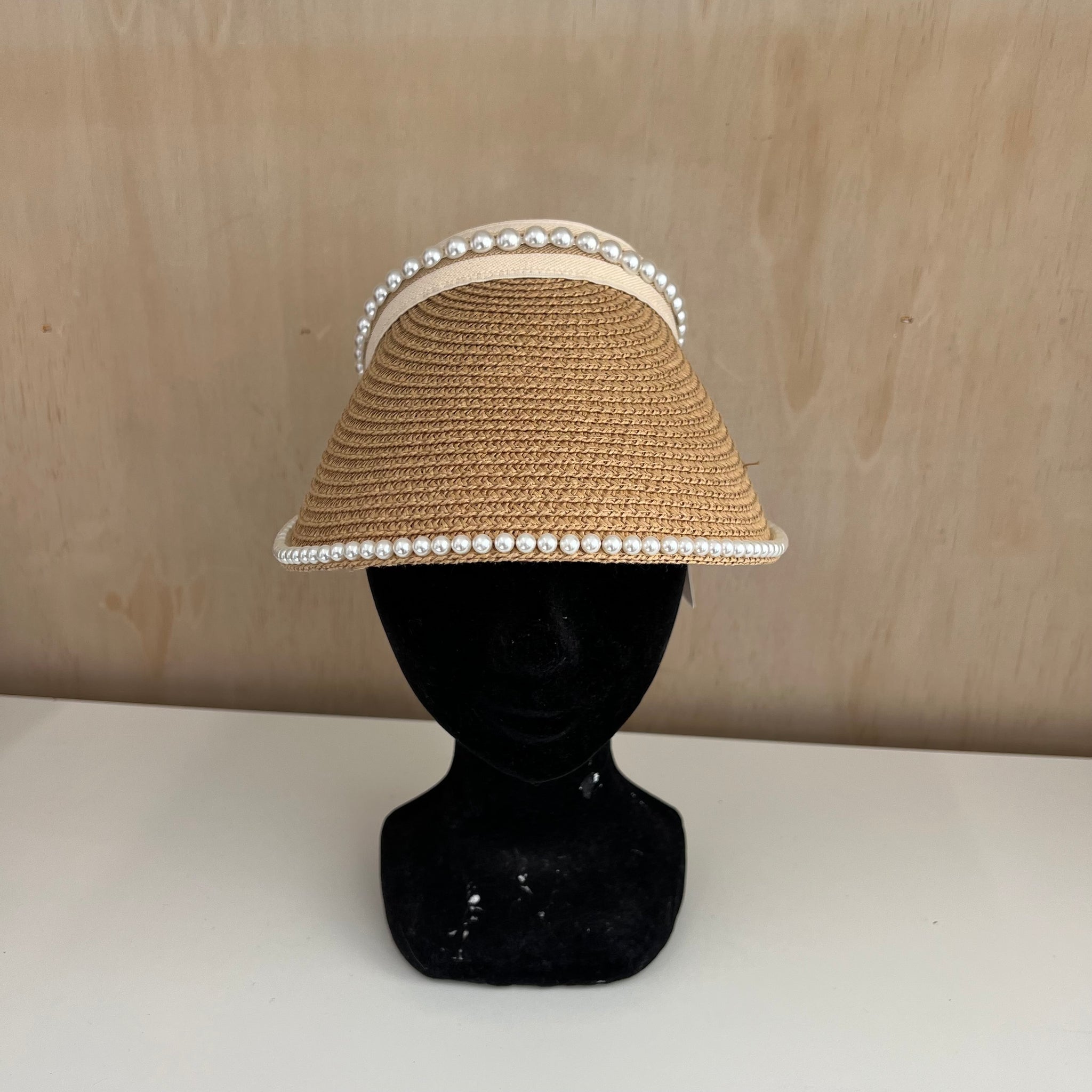 Chapeau de paille de style casquette, avec décorations de fausses perles aux contour.