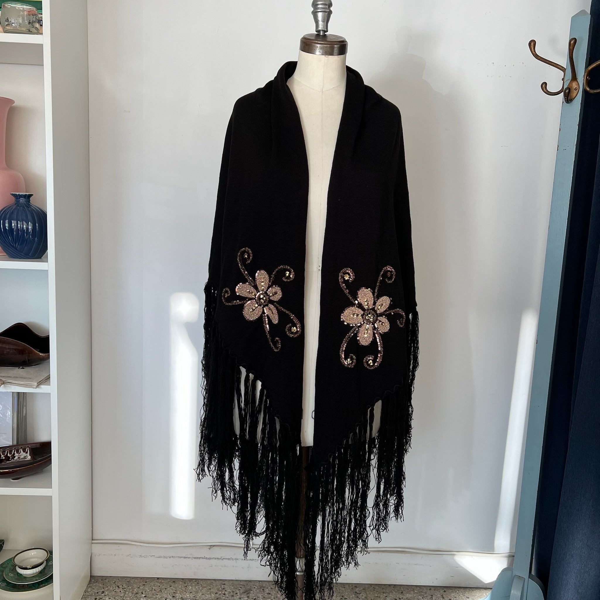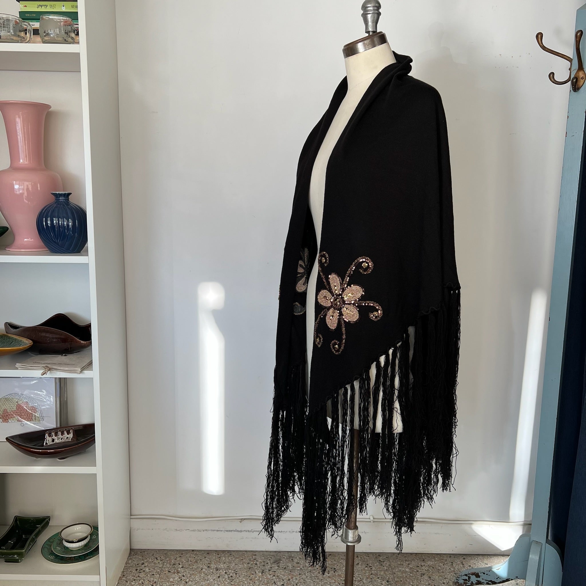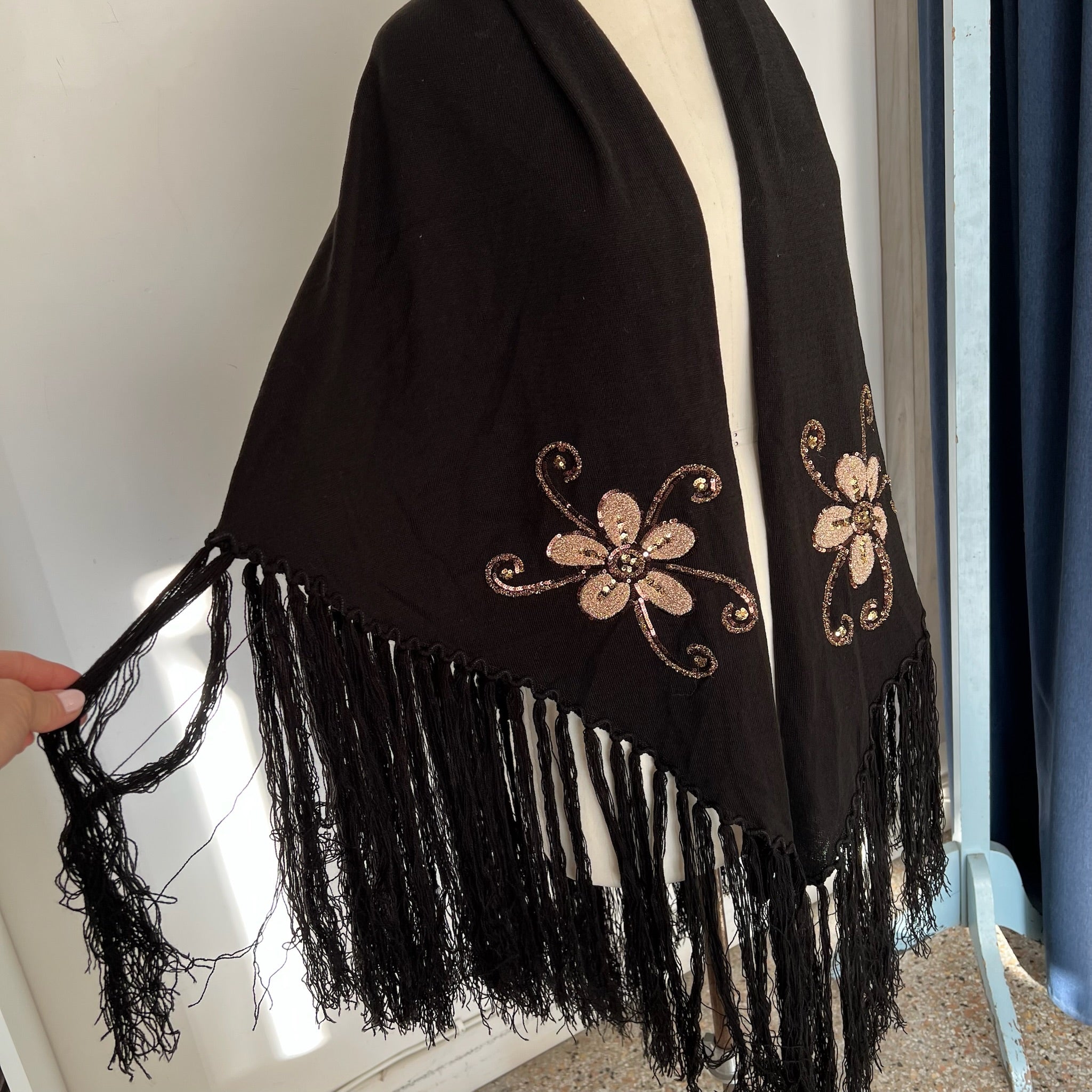 Magnifique châle de la marque Güler Triko. Doux, avec franges et décorations à paillettes. Forme triangulaire pourrait se porter d'autres façons également.