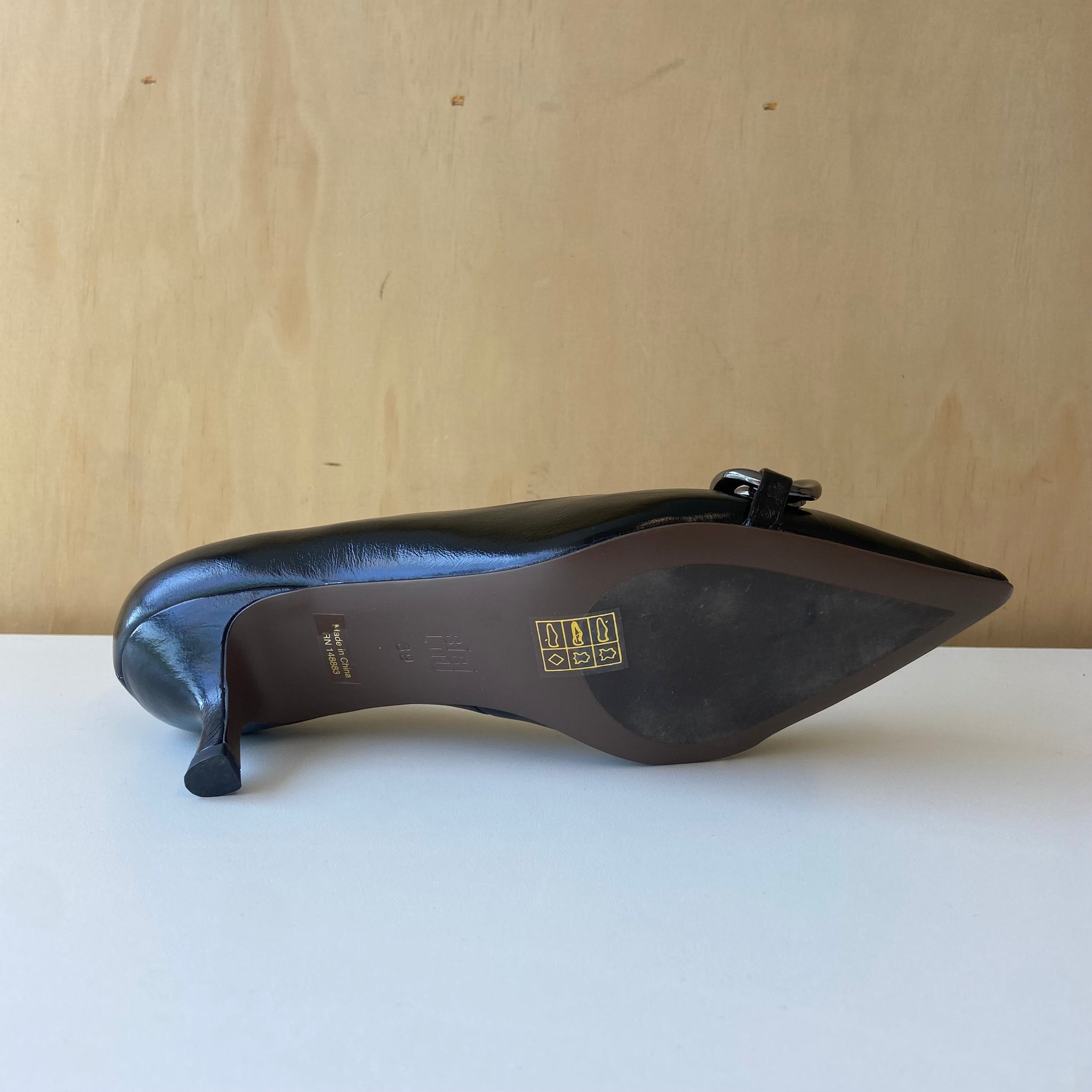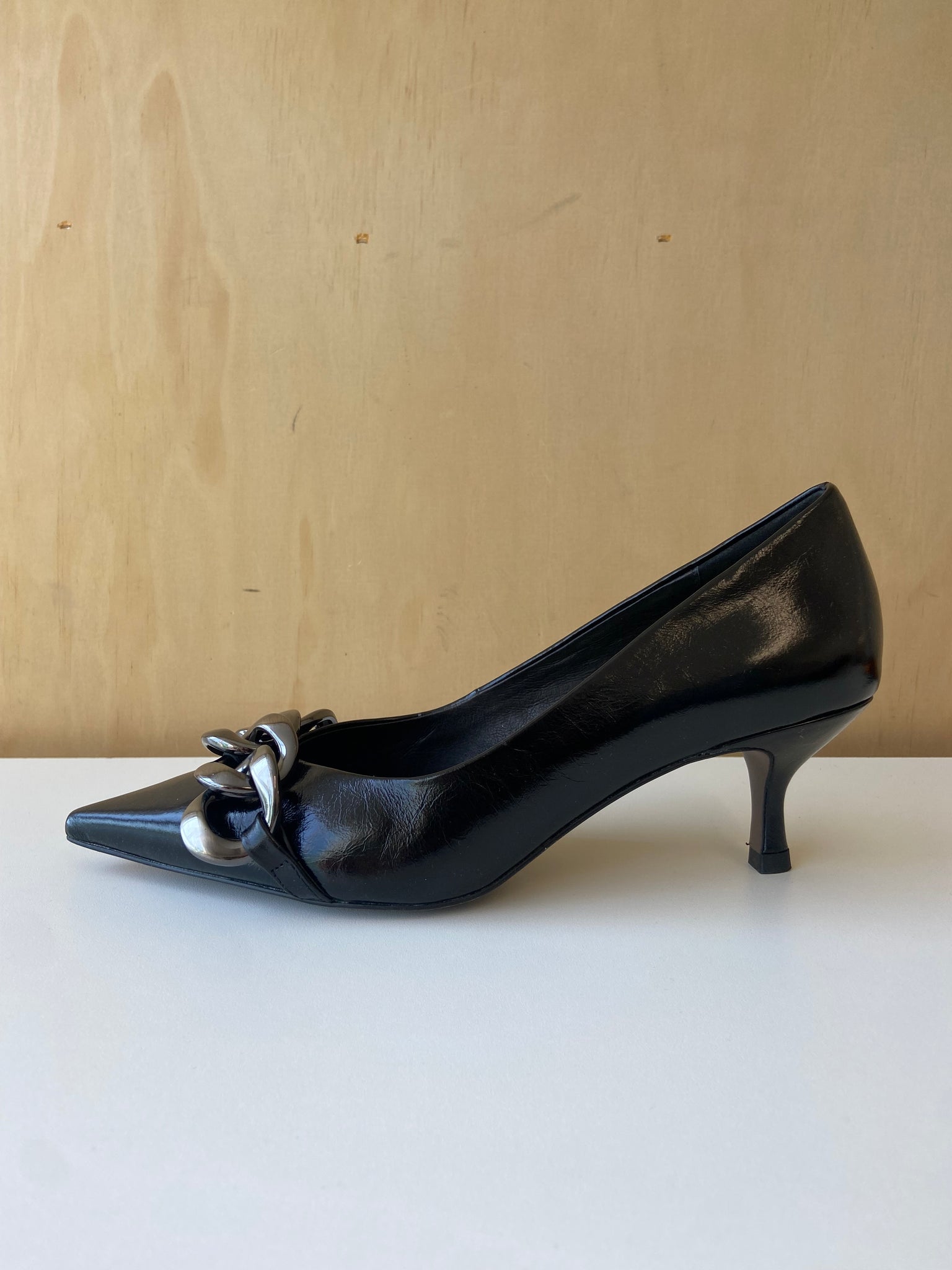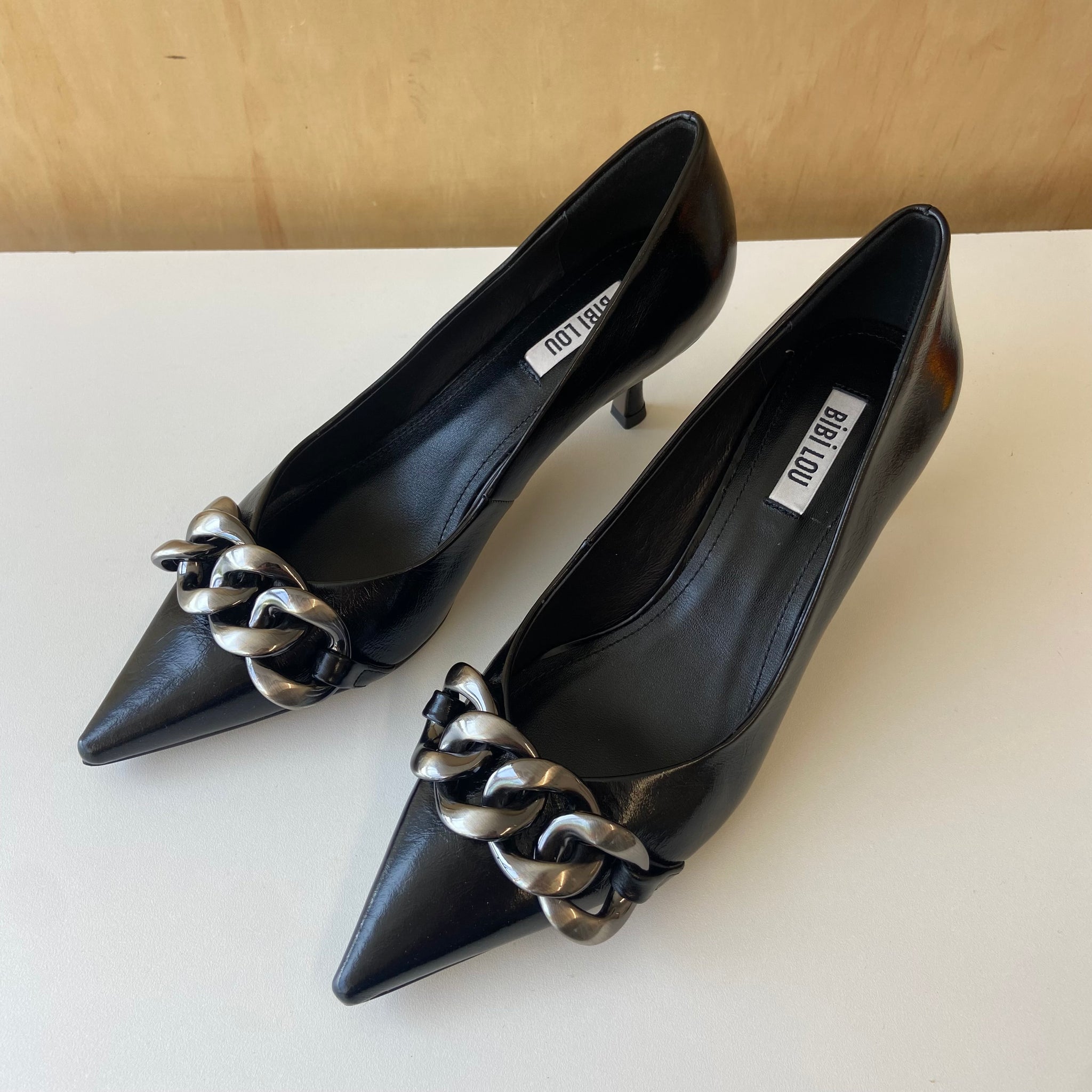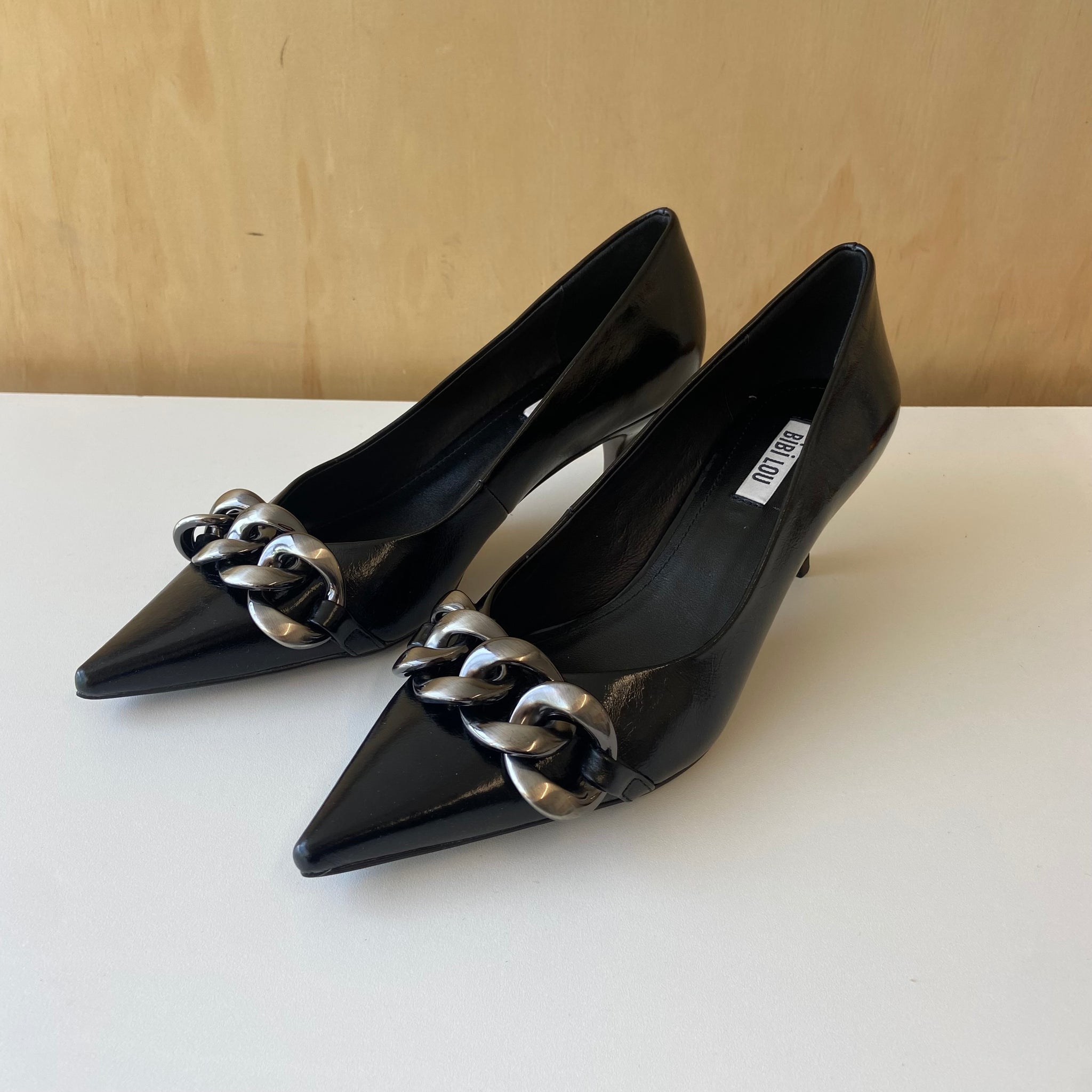 Chaussures à talon haut de Bibi Lou noires lustrées avec chaîne massive au bout. Chaussures à bouts pointus. D'une valeur de 295$.
