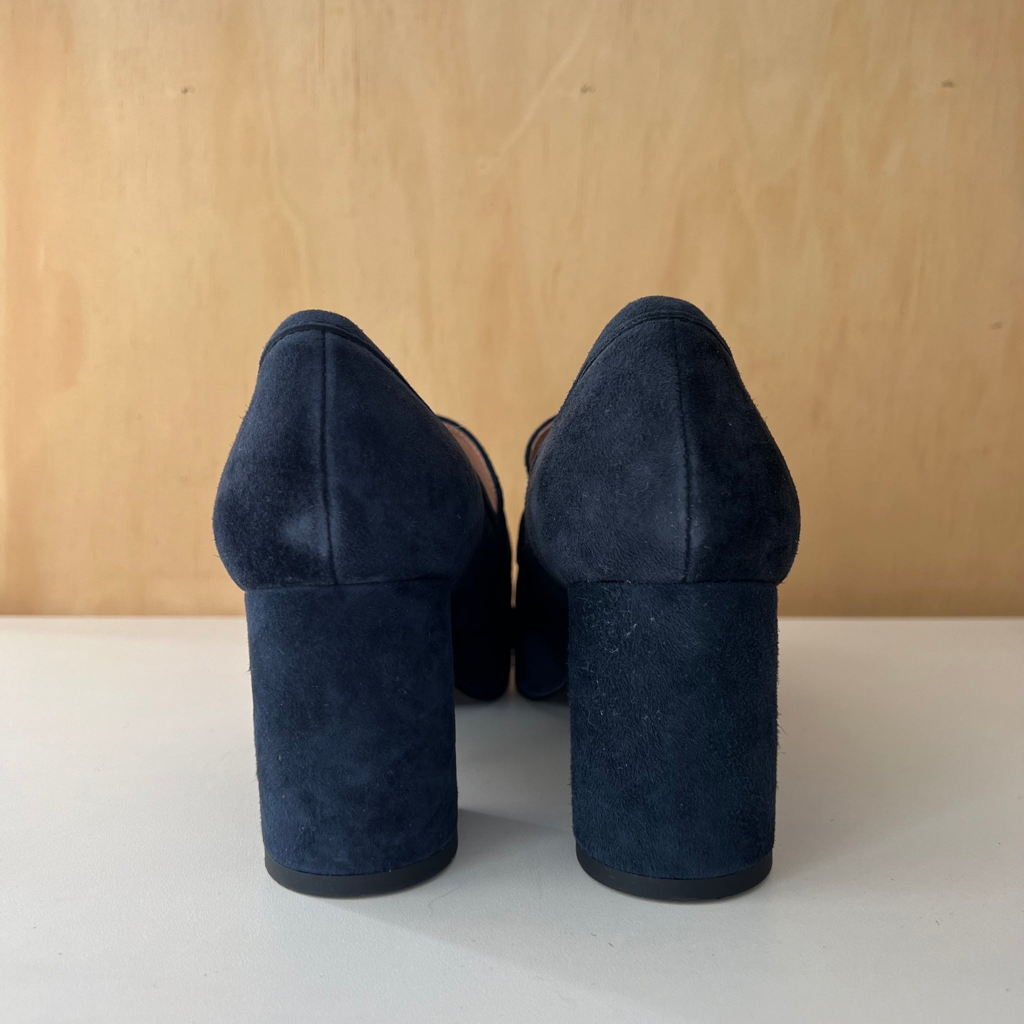 Souliers à talons hauts massif, de style loafers de la marque Bibi Lou modèle Helmut. Bout carré, en suède. D'une valeur de 300,00$.