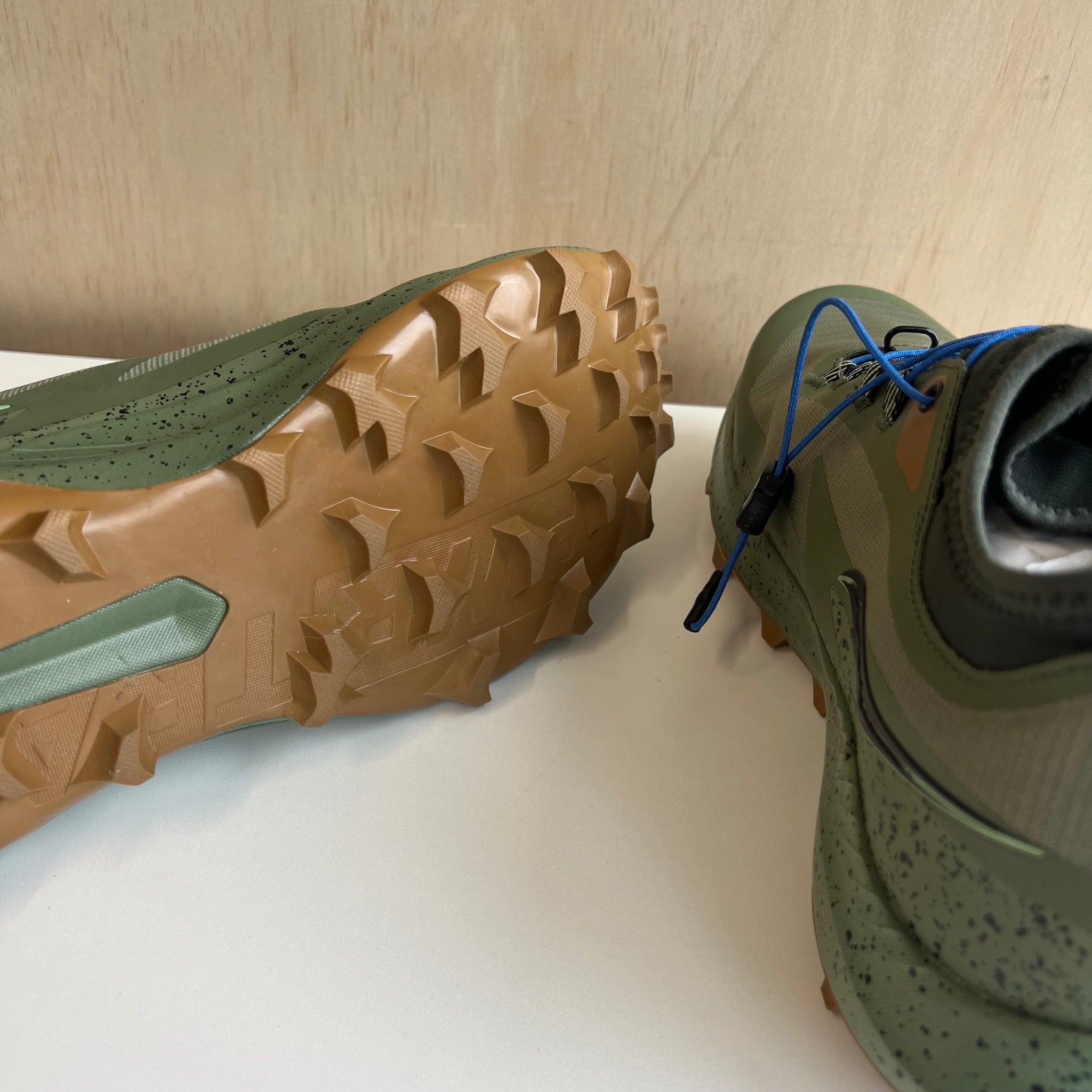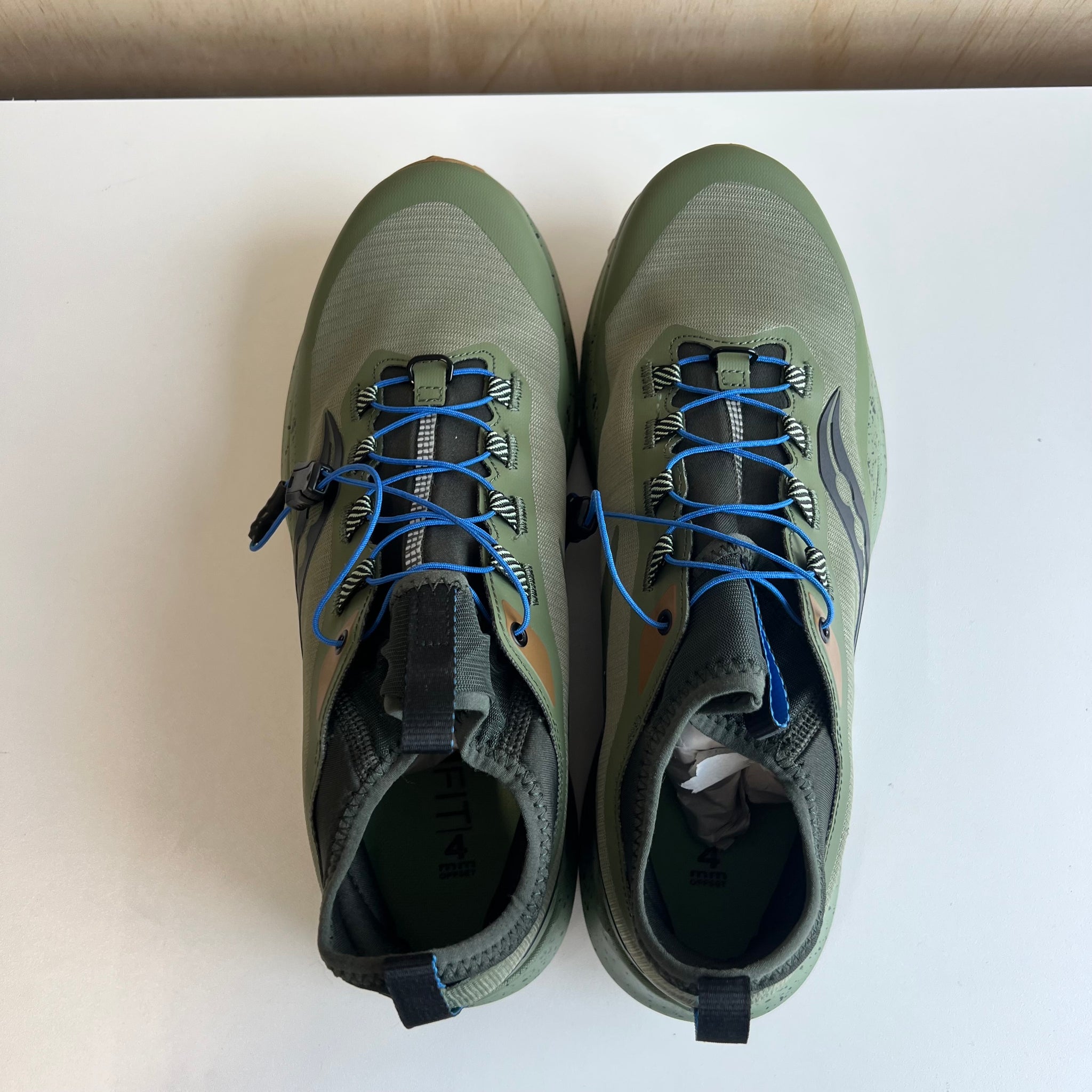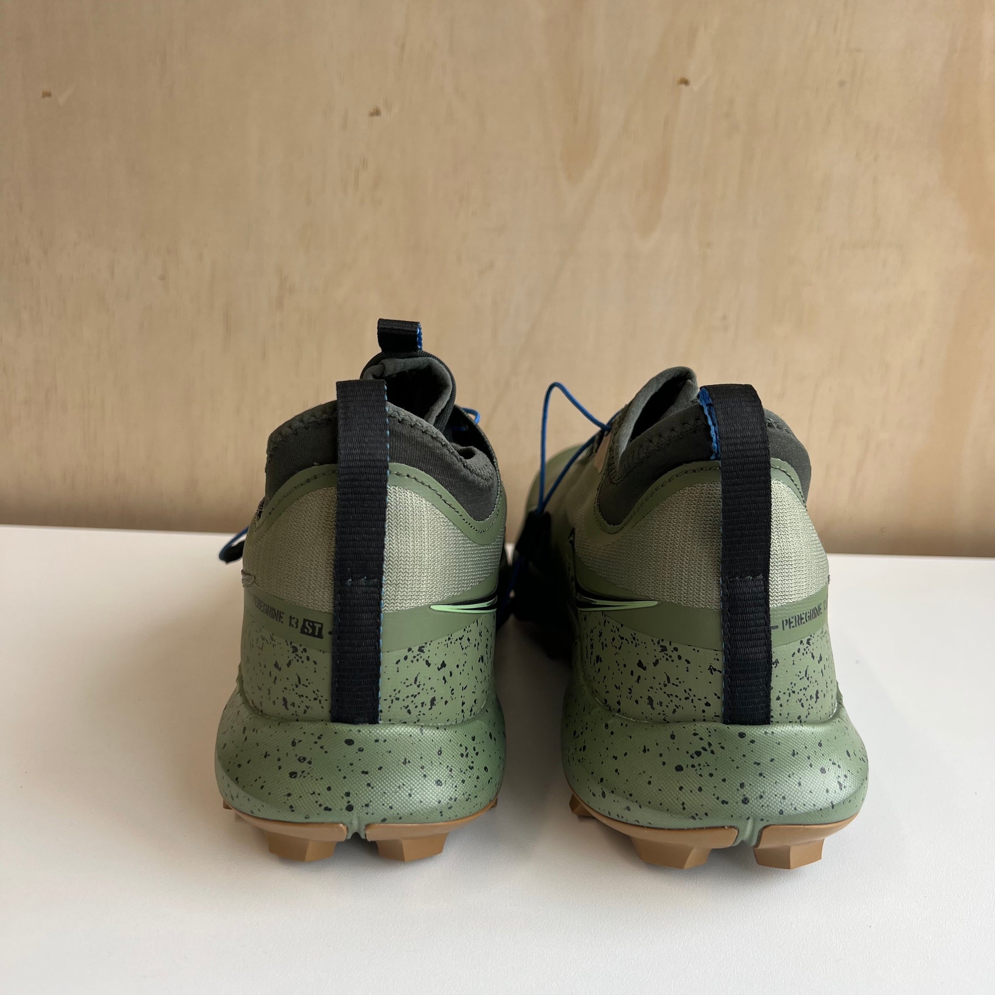 Chaussures de course de la marque Saucony modèle Peregrine 13 ST. Les terrains meubles et la boue ne sont pas à la hauteur de la Peregrine 13 ST. Boue, neige, eau: La nouvelle version des crampons, profonds et performants, coupe à travers l'humidité sans difficultés. Cette chaussure mi-haute est dotée d'une guêtre pour empêcher tous les éléments extérieurs sur votre chemin de pénétrer à l’intérieur. La saleté ne fait pas le poids. D'une valeur de 180$.