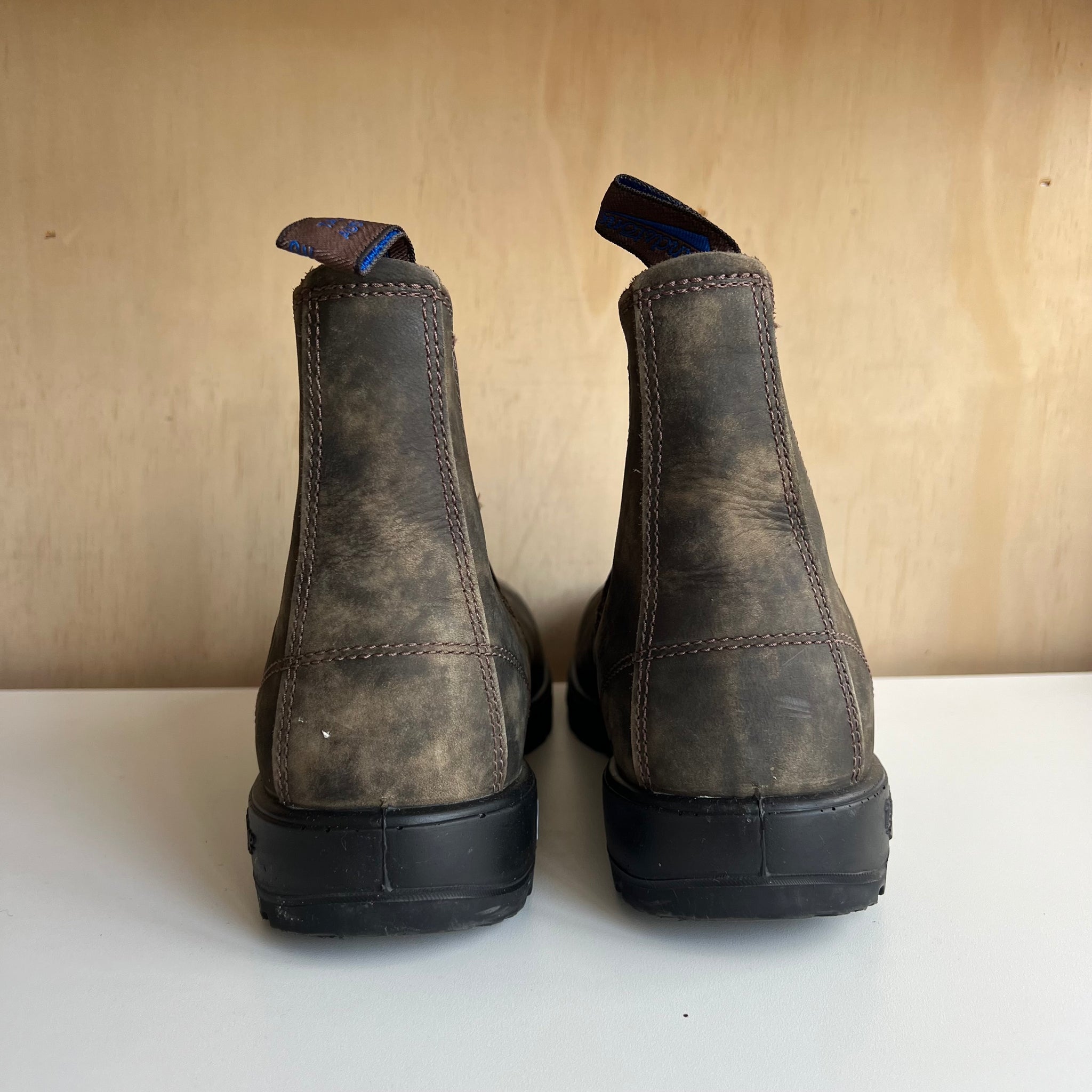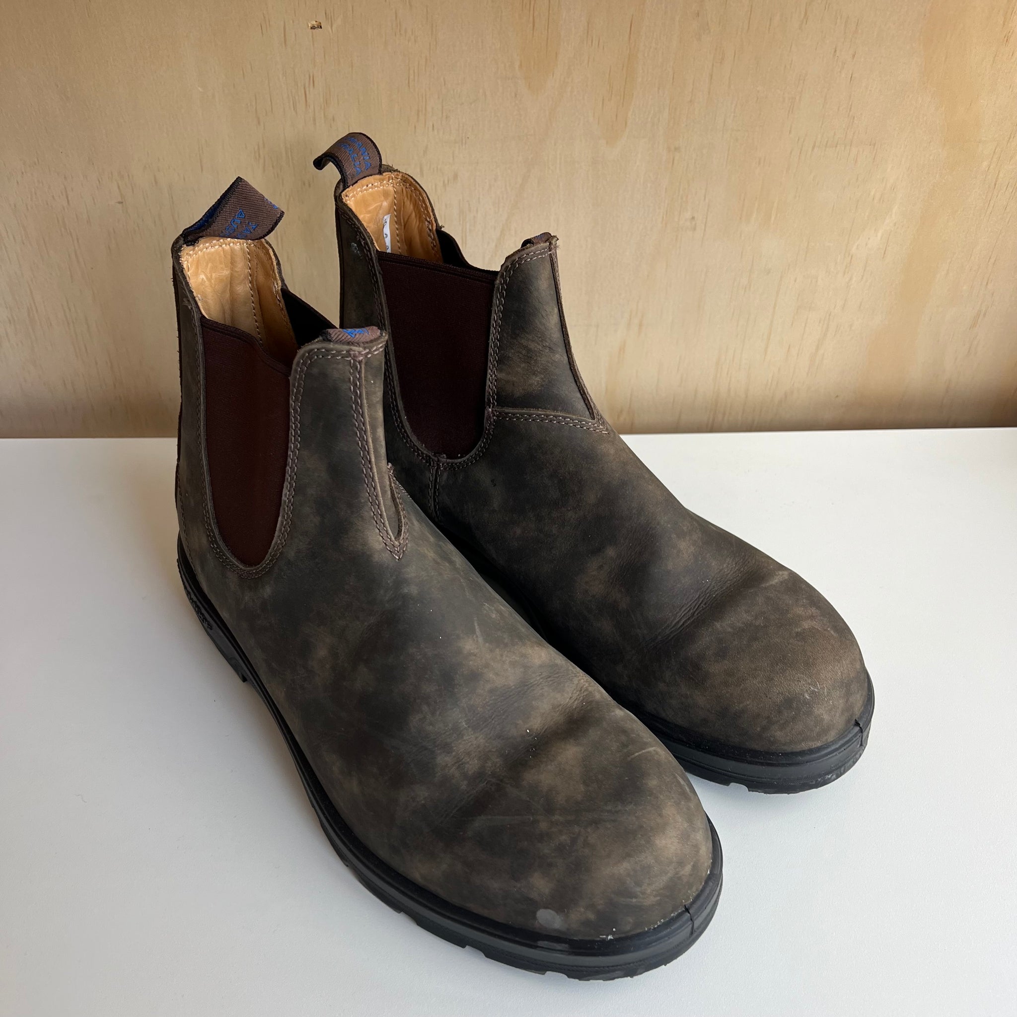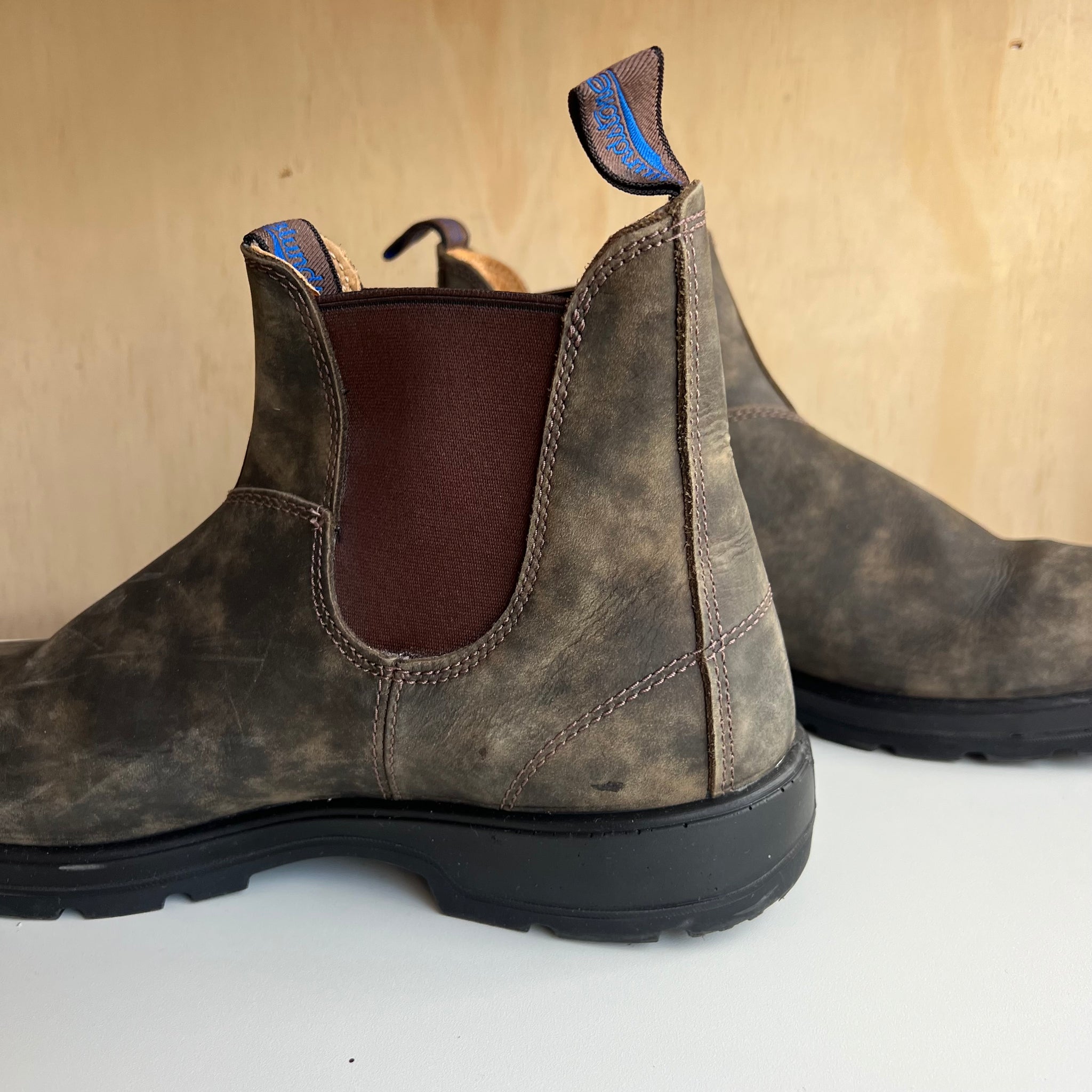 Bottes de la marque Blundstone modèle Chelsea 585 classique brun rustique. En cuir, semelle thermo-uréthane / intercalaire en polyuréthane, cambrure en acier, élastiques latéraux, doublure en cuir isolant ThinsulateMC 200g. Assise plantaire amovible en peau de mouton ; une paire de semelles régulières supplémentaire incluse. Cuir pré-traité pour un look vieilli. D'une valeur de 290$.