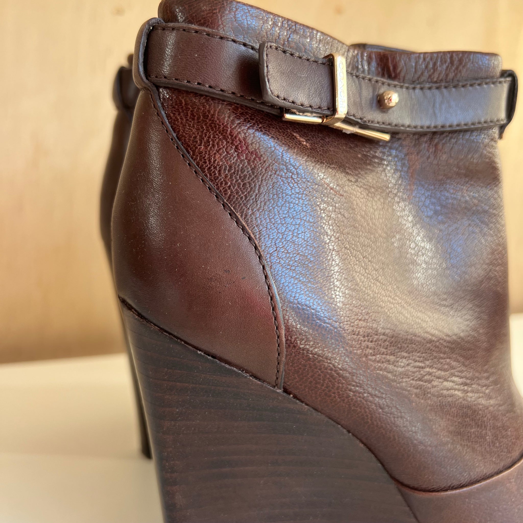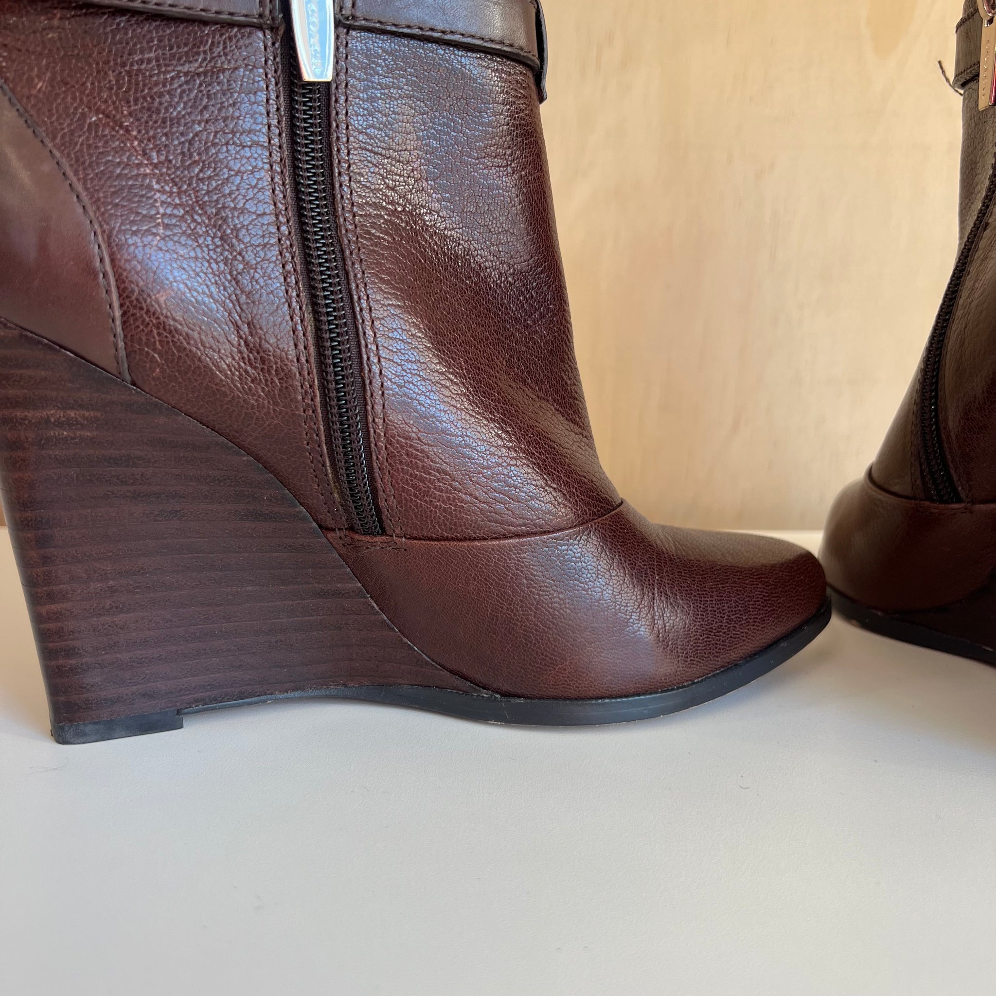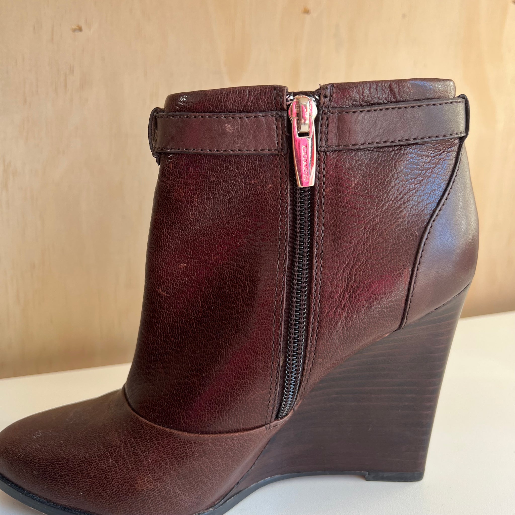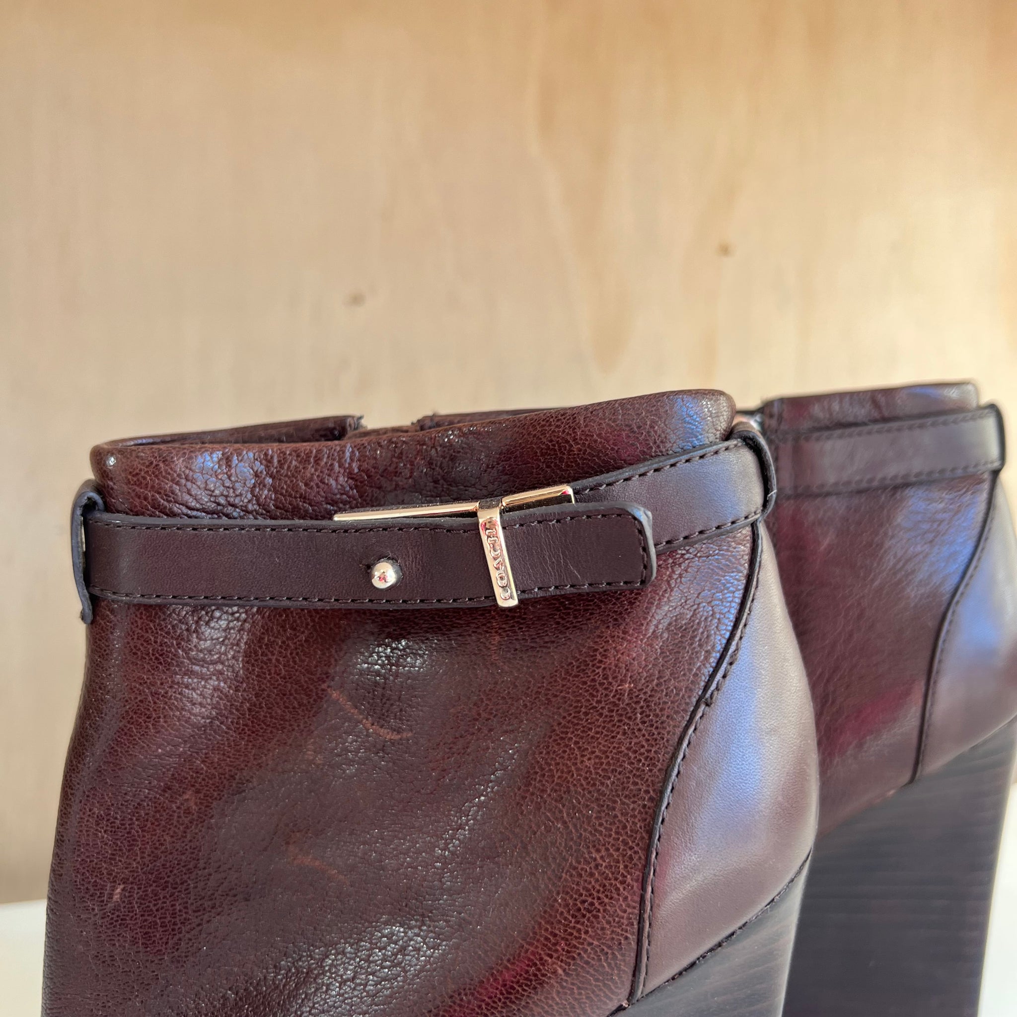 Chaussures en cuir de style bottillons à talons hauts de la marque Coach. Modèle Melody. Bout pointu, ganse décorative avec boucle et fermeture éclair sur le coté.
