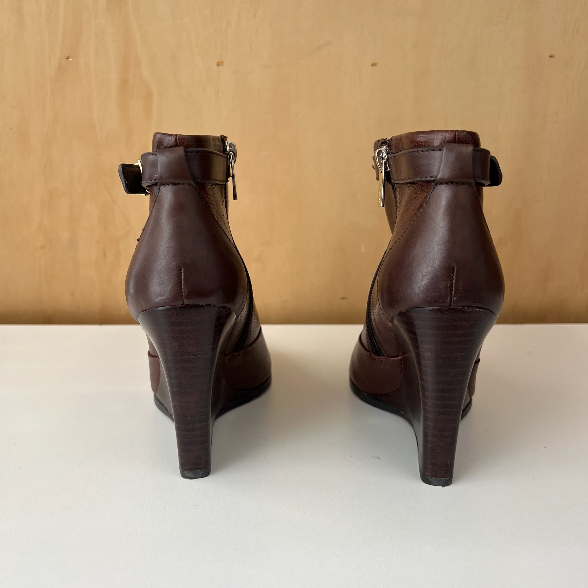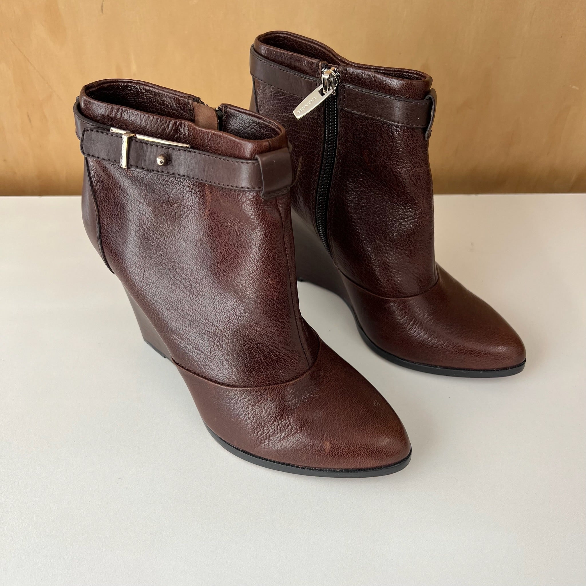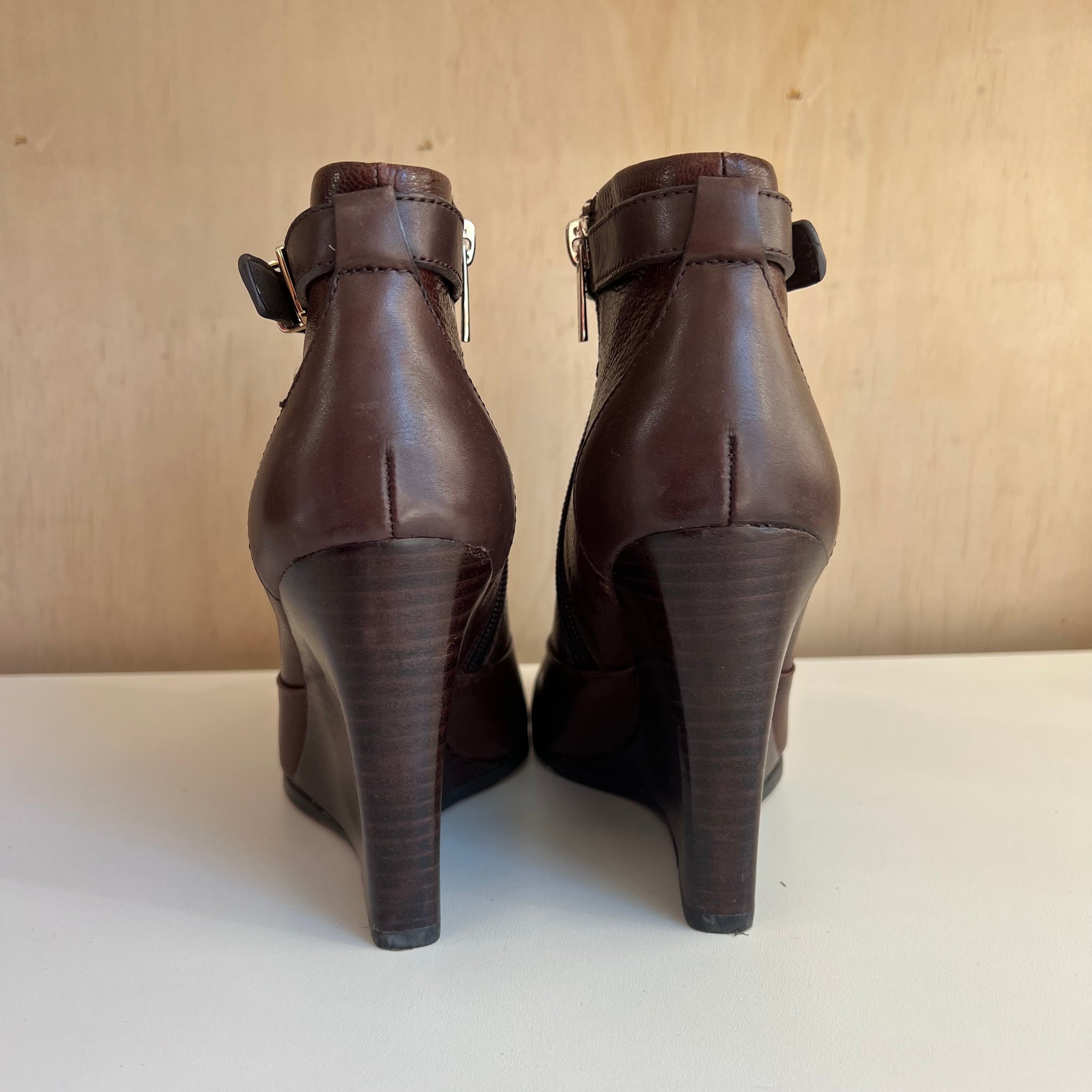 Chaussures en cuir de style bottillons à talons hauts de la marque Coach. Modèle Melody. Bout pointu, ganse décorative avec boucle et fermeture éclair sur le coté.