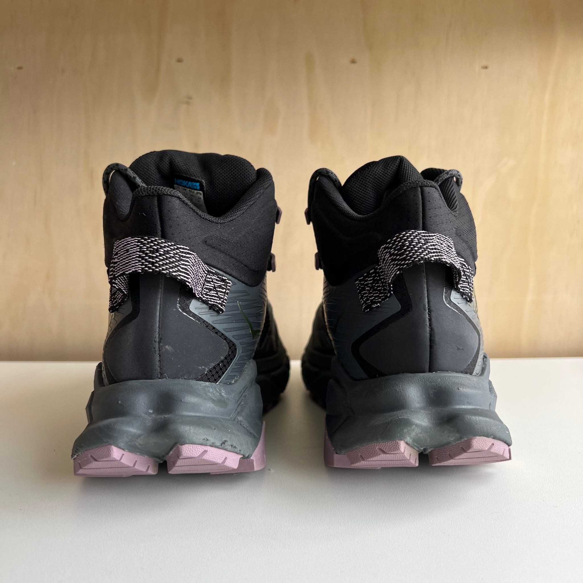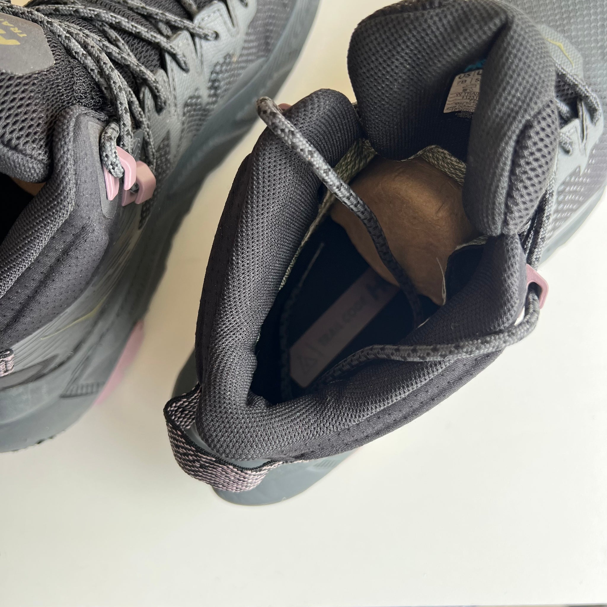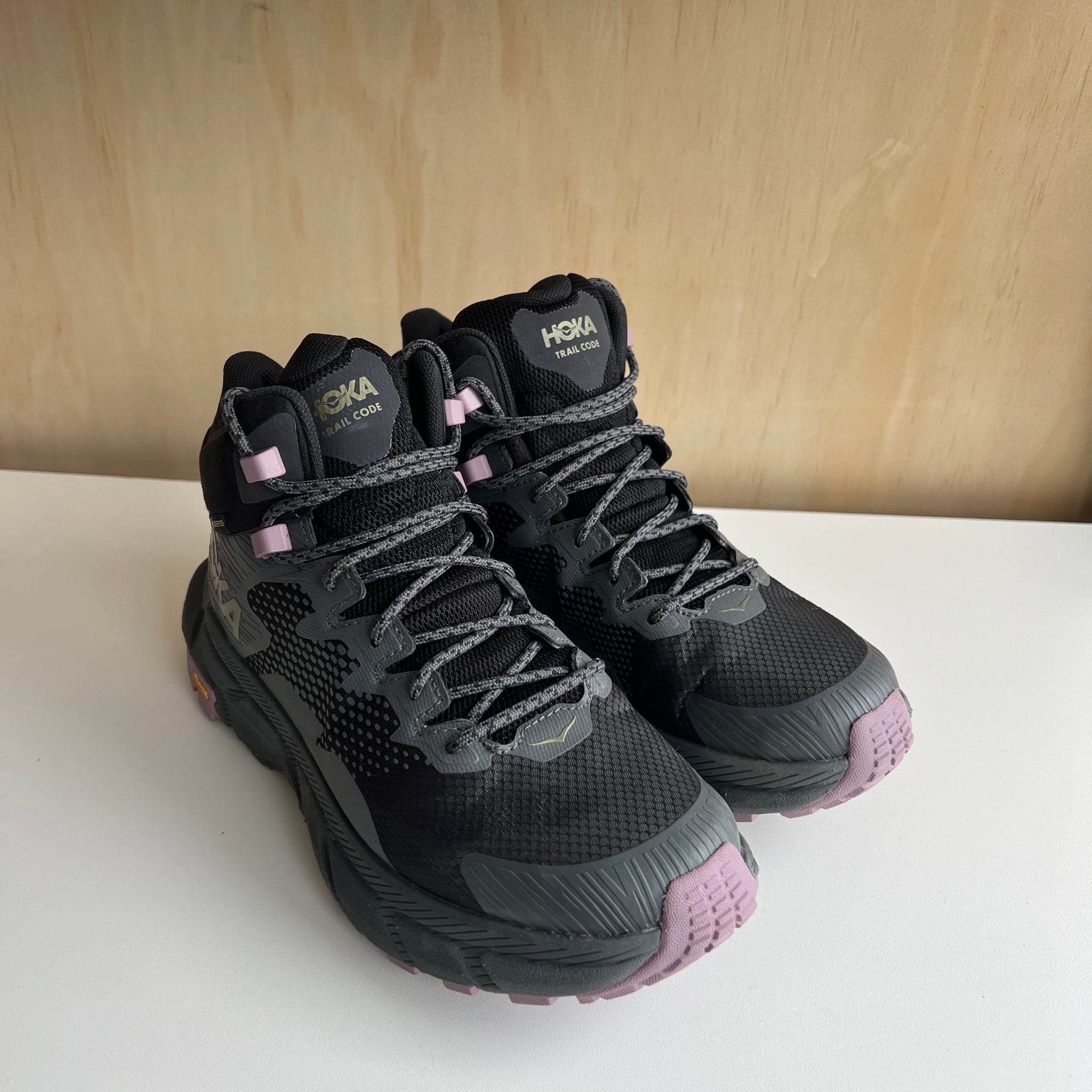 Chaussures de randonnée Hoka W Trail Code GTX. Ornée d’un imprimé sérigraphié texturé afin de réduire les rebuts et d’augmenter la durabilité, cette chaussure de course sur sentier est conçue pour l’exploration. Dune valeur de 225$.