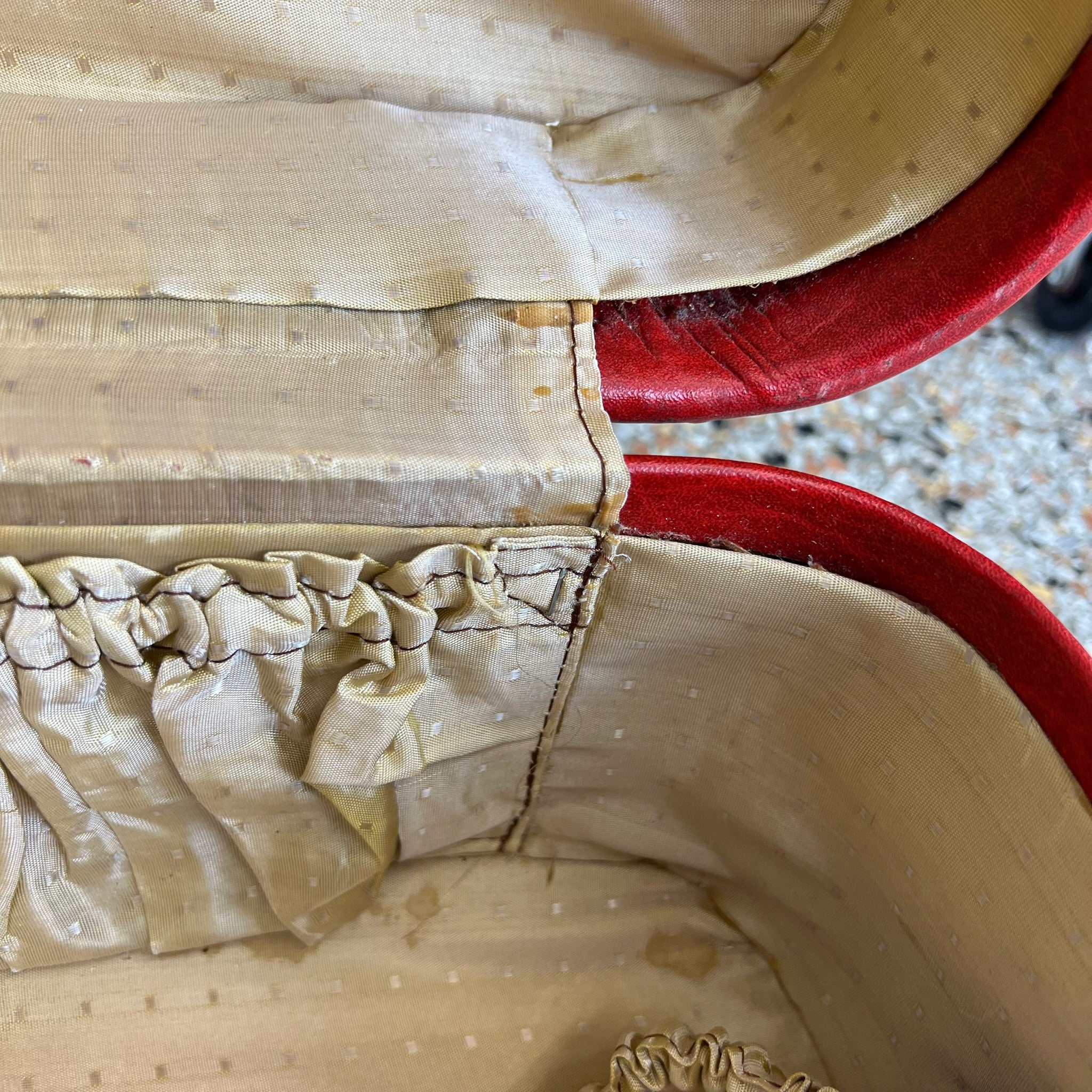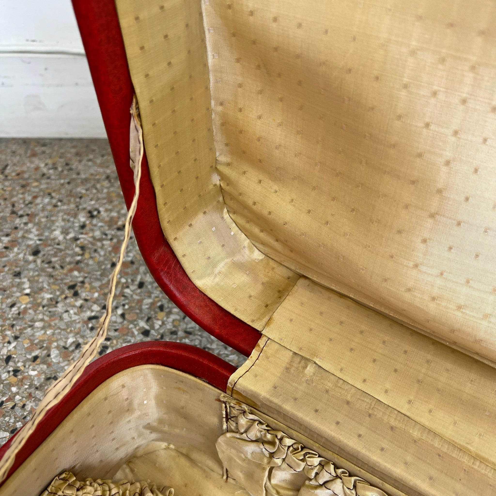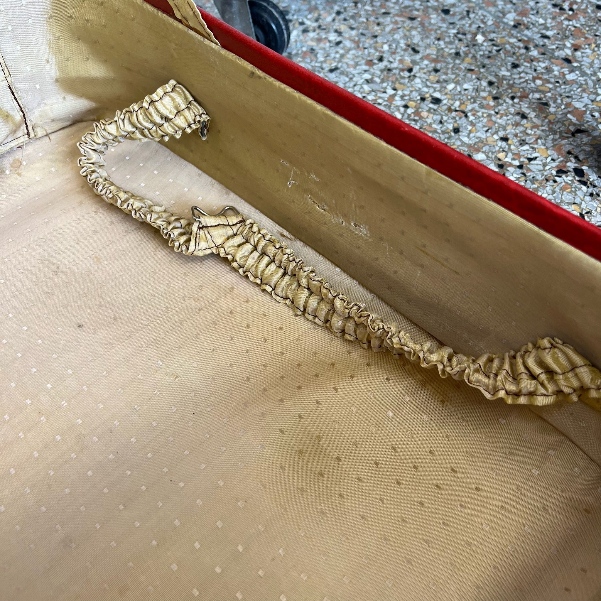 Magnifique valise vintage rouge de style mallette de cuir. Il manque les clés pour verrouiller les clapets. Tel que vu sur Naïla Louidort lors de la campagne Achetez c'est donner 2025 réalisée par Compagnie & Cie.