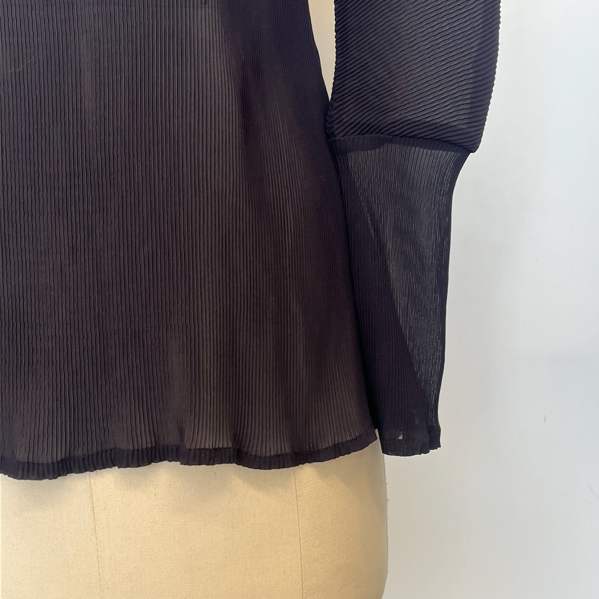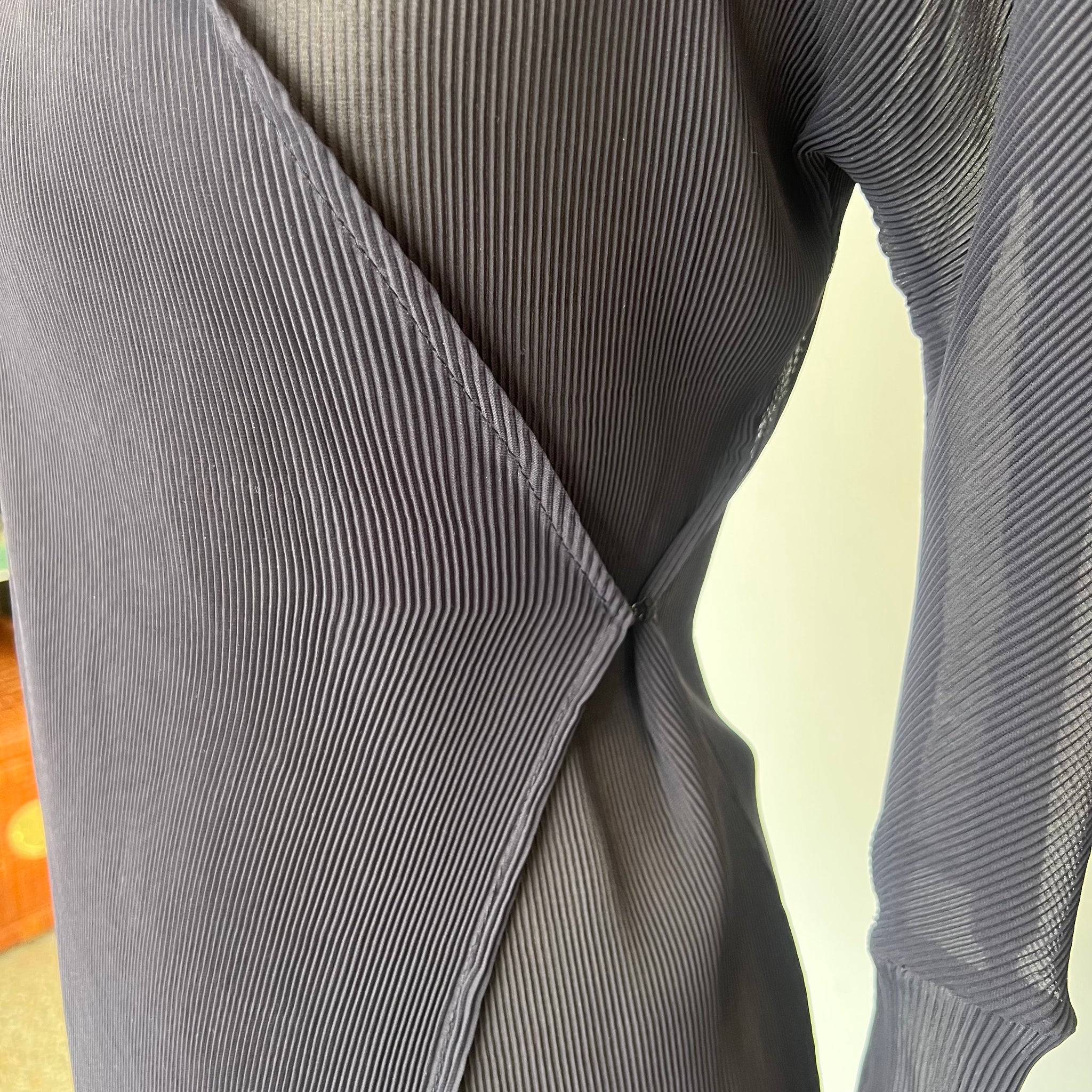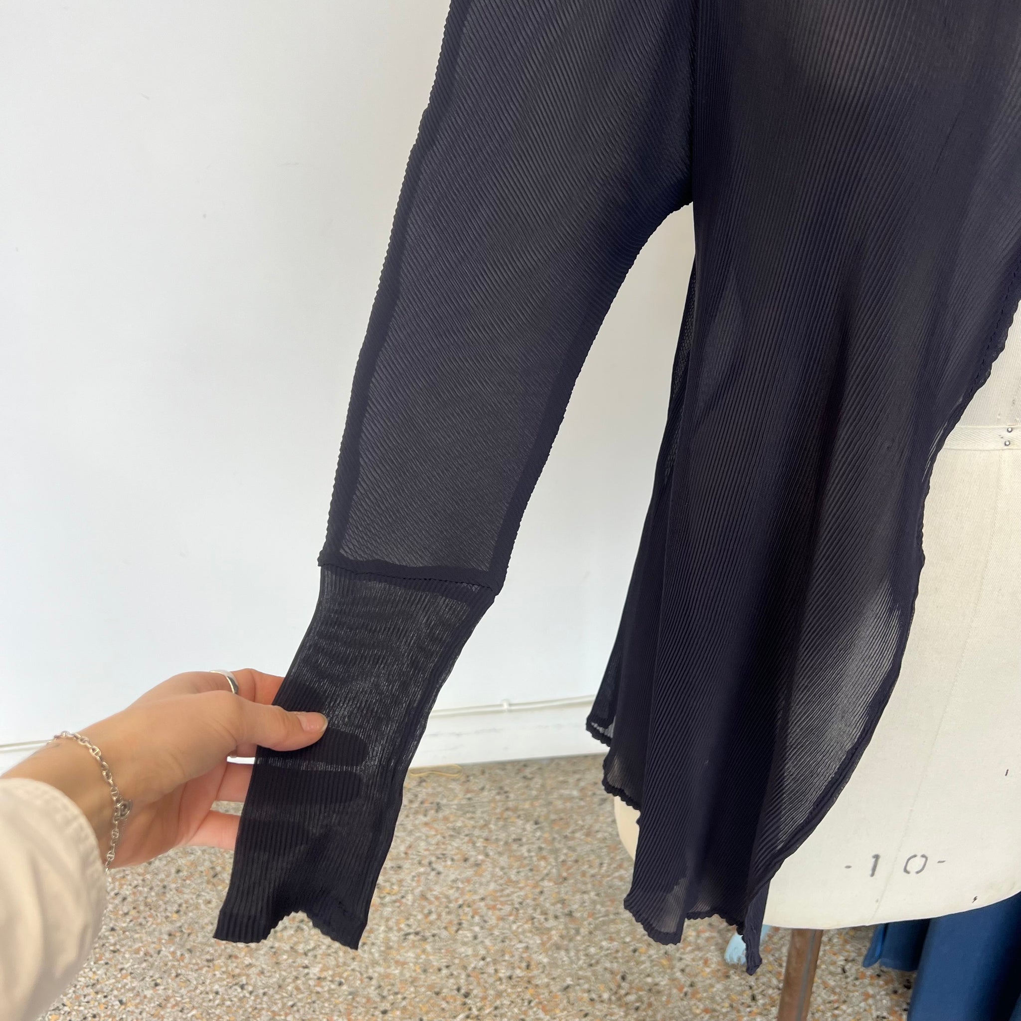 Par-dessus léger de la marque Barbeau. Fermeture discrète à l’avant, col plongeant et poignets ajustés. Se porte détaché ou en portefeuille. Tissu texturé translucide pour une allure élégante et sophistiquée.