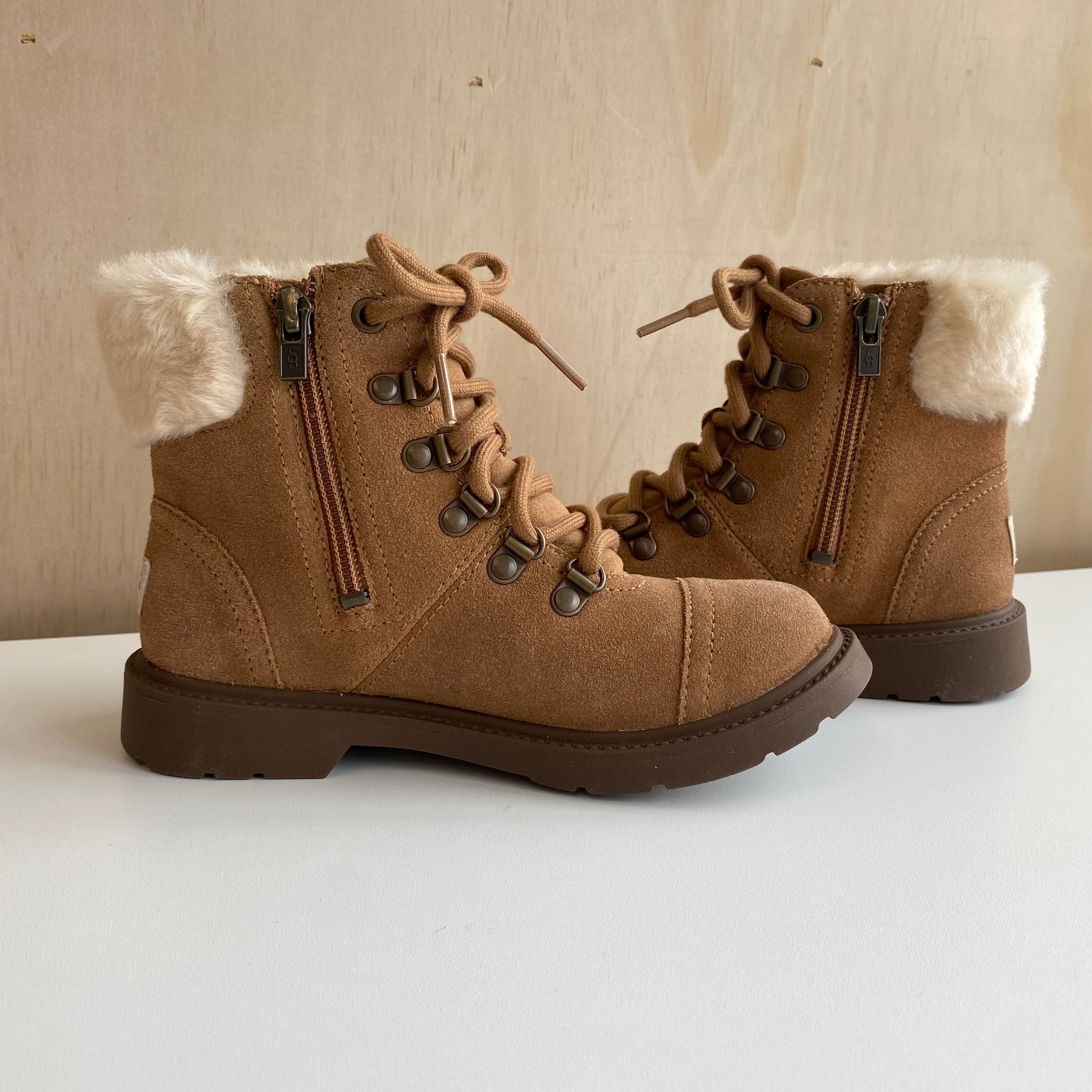 Bottes pour enfant de la marque UGG modèle Azell Hiker Weather. Fabriqué de suède imperméable et de coutures scellées, doublure antibactérienne, une semelle intérieure matelassée et une glissière qui facilite l’ajustement. Dotée d’un bracelet en fausse fourrure.
