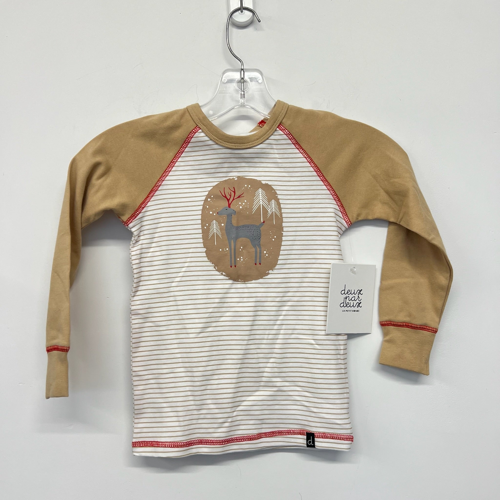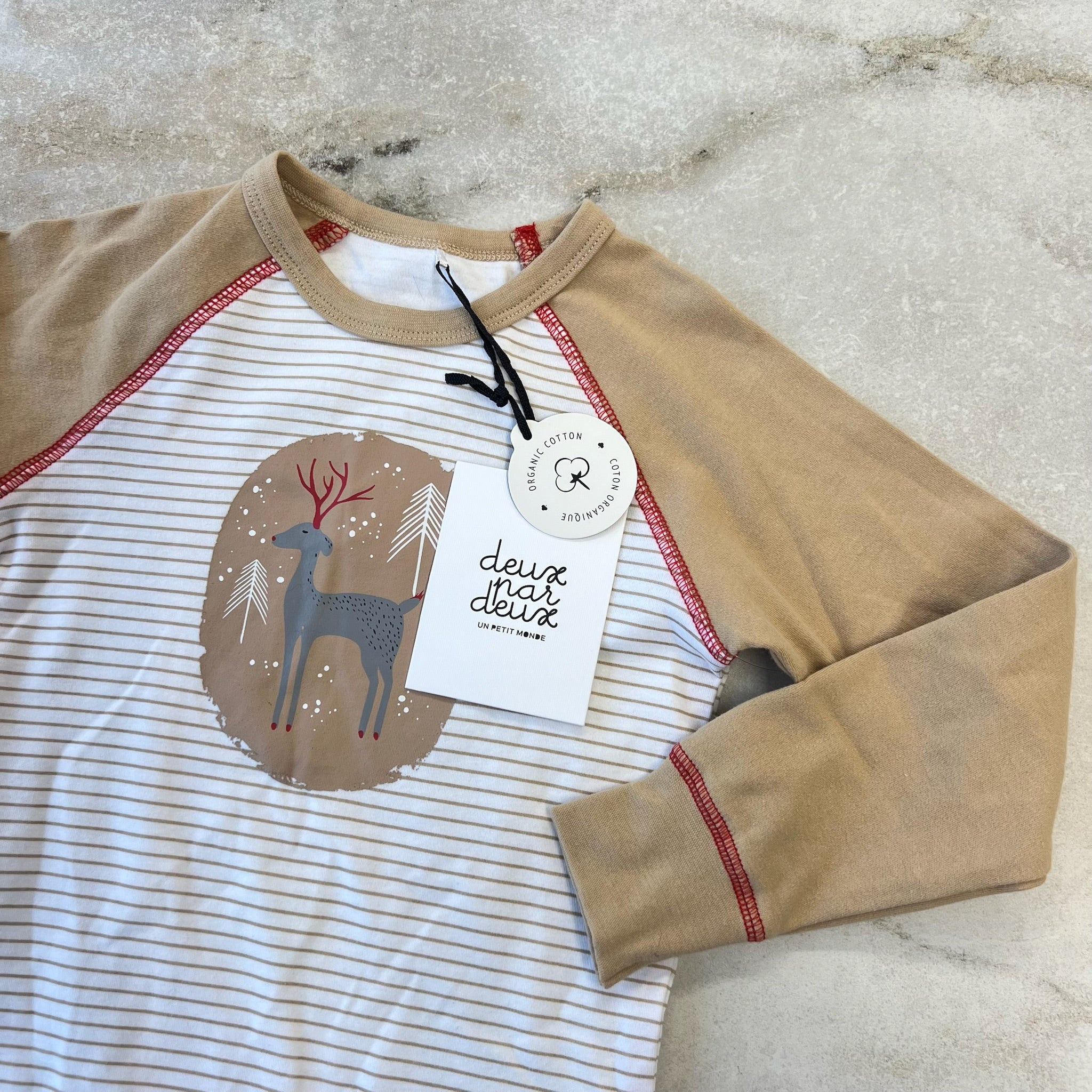 Haut de pyjama de la marque Deux par Deux. En coton biologique, à manches longues avec un col rond avec imprimé de reines et de forêt.