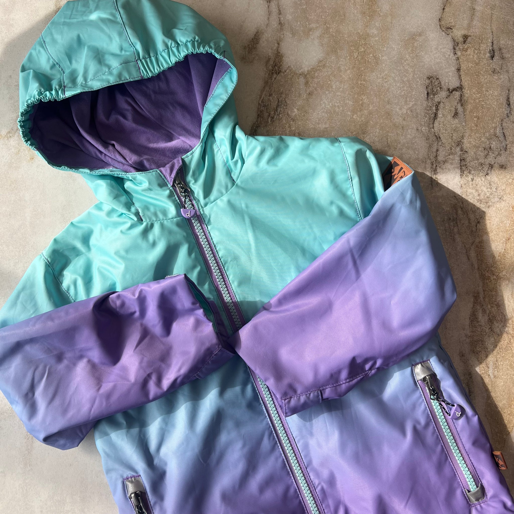 Manteau Au printemps avec veste intégrée de la marque Deux par Deux. Comprend une veste de printemps à capuchon avec poches zippées, des poignets avec bandes velcro, et une veste en molleton polaire unie qui peut être portée seule ou superposée sous la veste pour plus de chaleur.