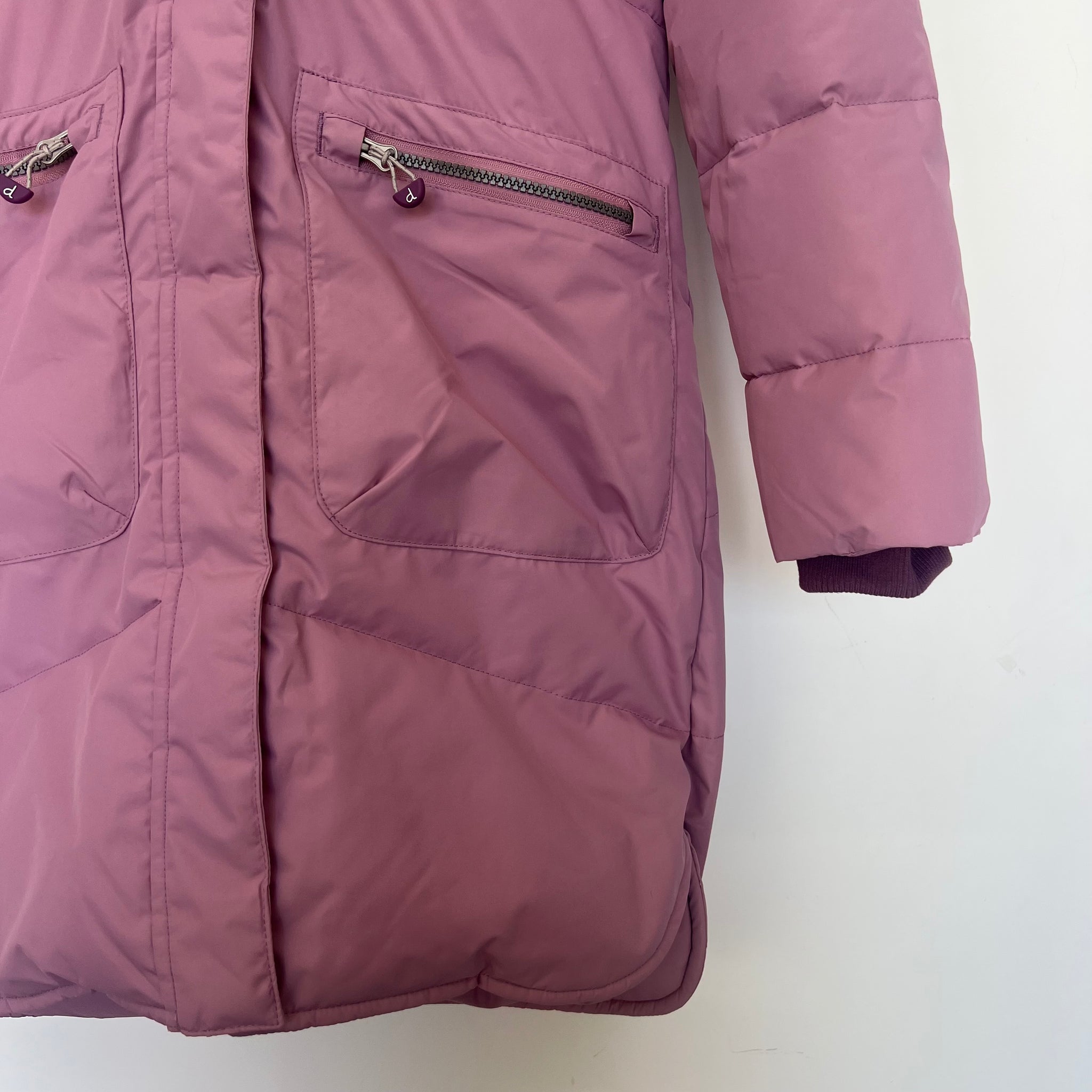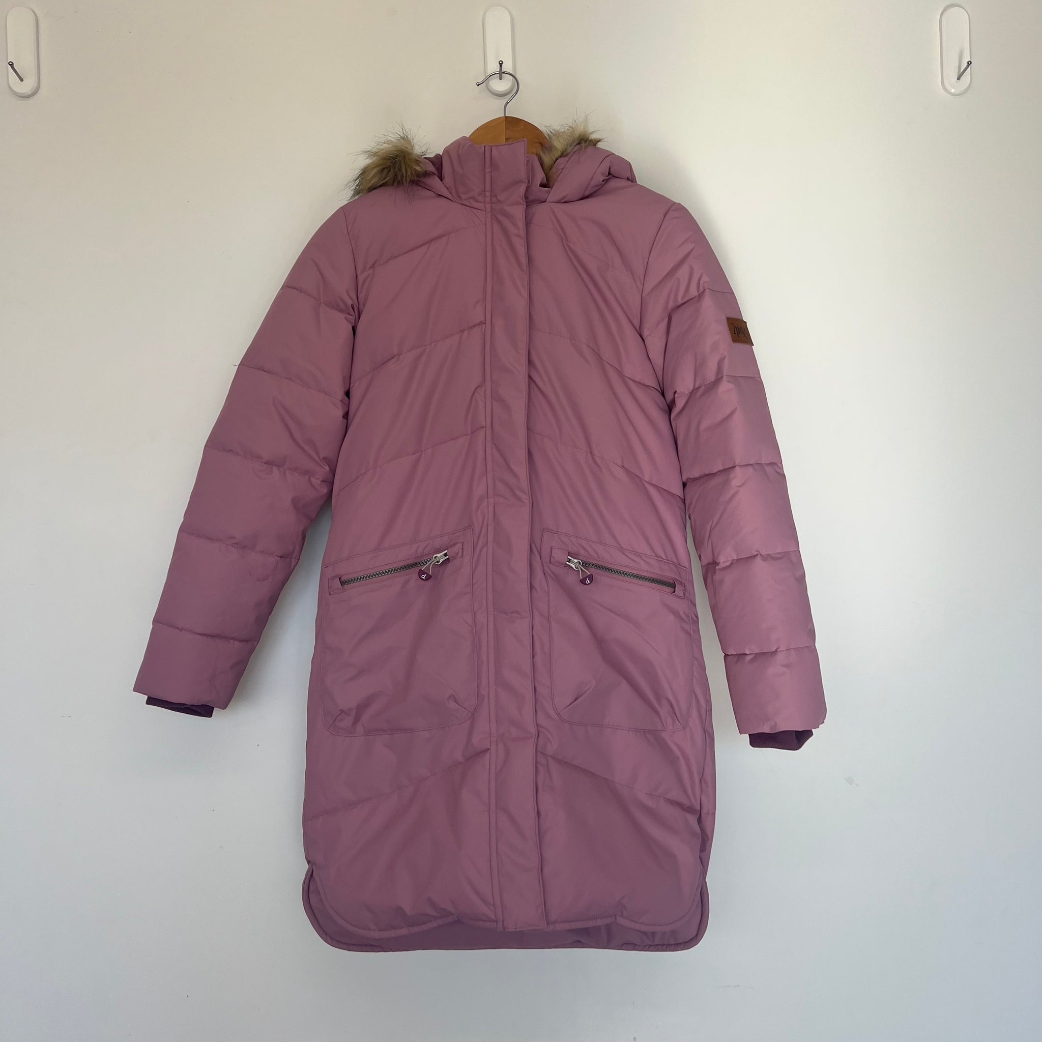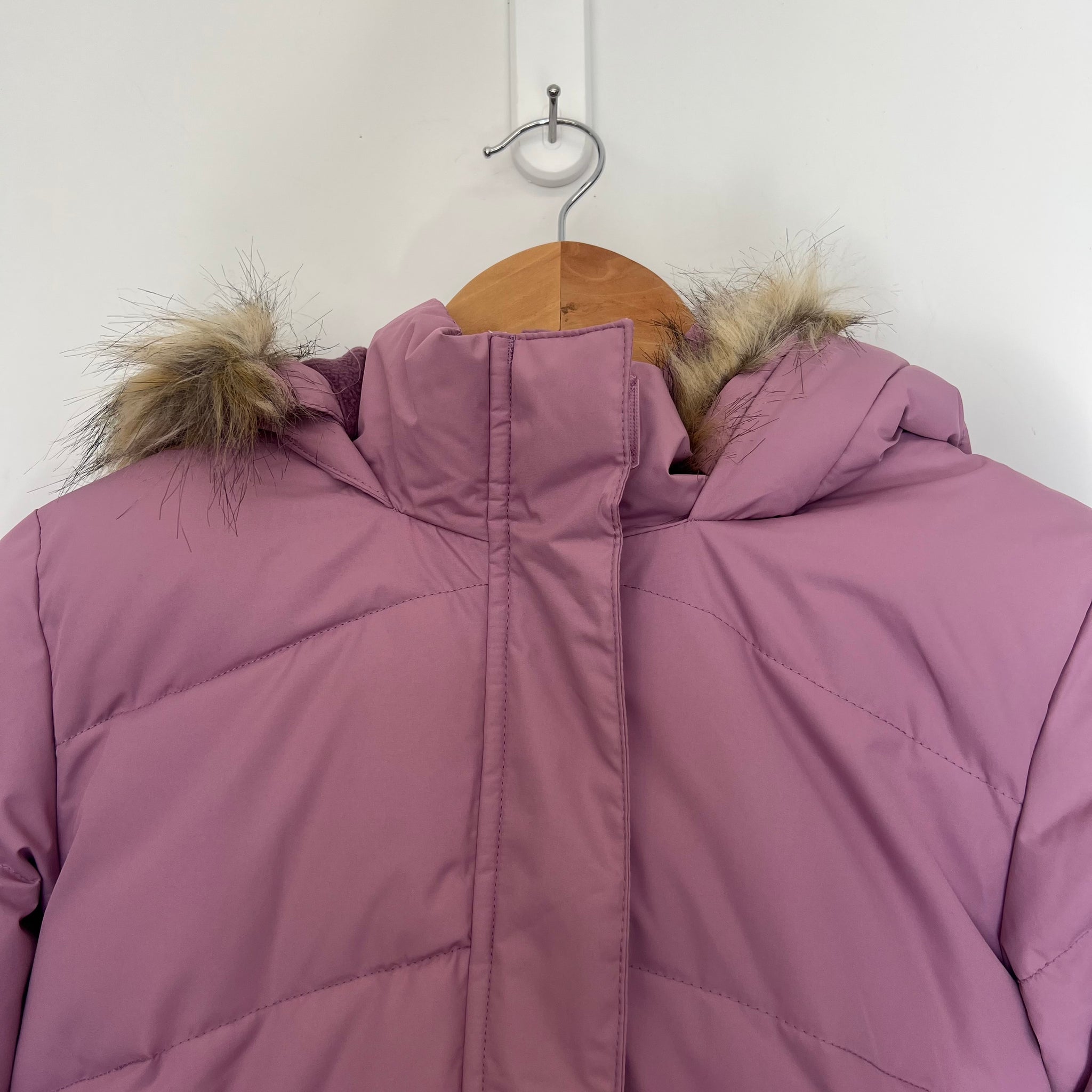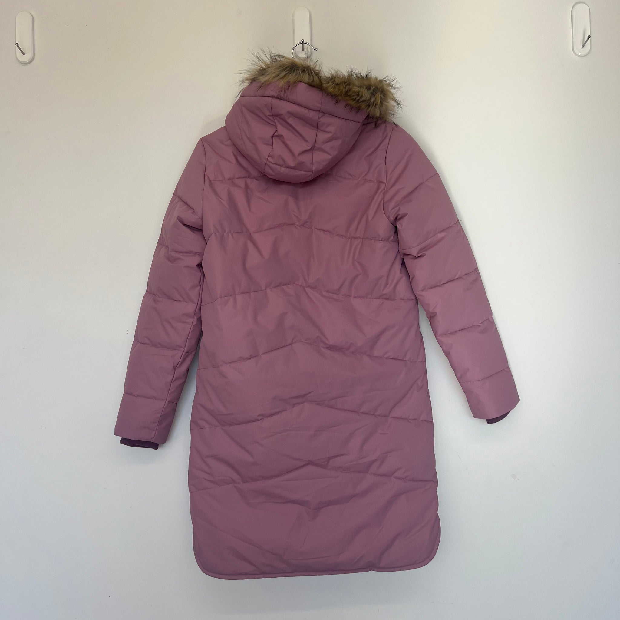 Manteau d’hiver long doublé en polaire avec capuchon avec fourrure synthétique amovible.