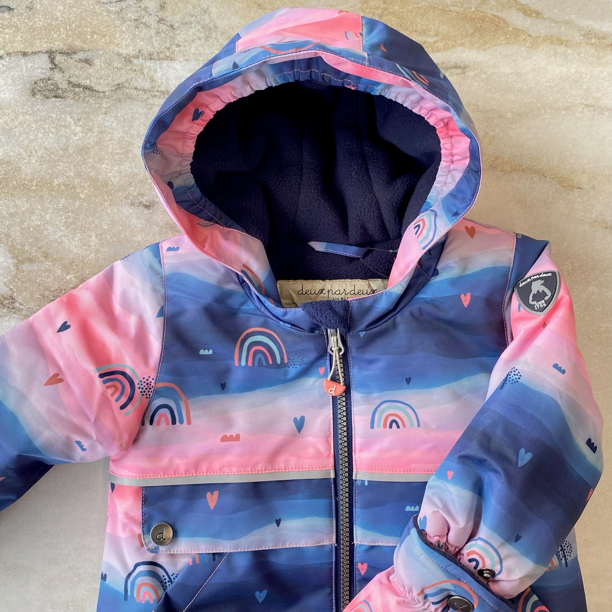 Manteau d'hiver bleu aux imprimés de montagnes et de loups de la marque Deux par Deux. Chaud et résistant, conçu pour affronter l’hiver jusqu’à -30 °C (-22 °F). Doublé en polar (corps, dos, col, capuchon), il offre une excellente isolation en fibres de polyester (capuchon 57 g, corps 170 g, manches 170 g). Le tissu est imperméable (5000 mm) et respirant (5000 g/m²/24h), idéal pour les jeux actifs et les sports d’hiver. Capuchon avec fausse fourrure détachable.