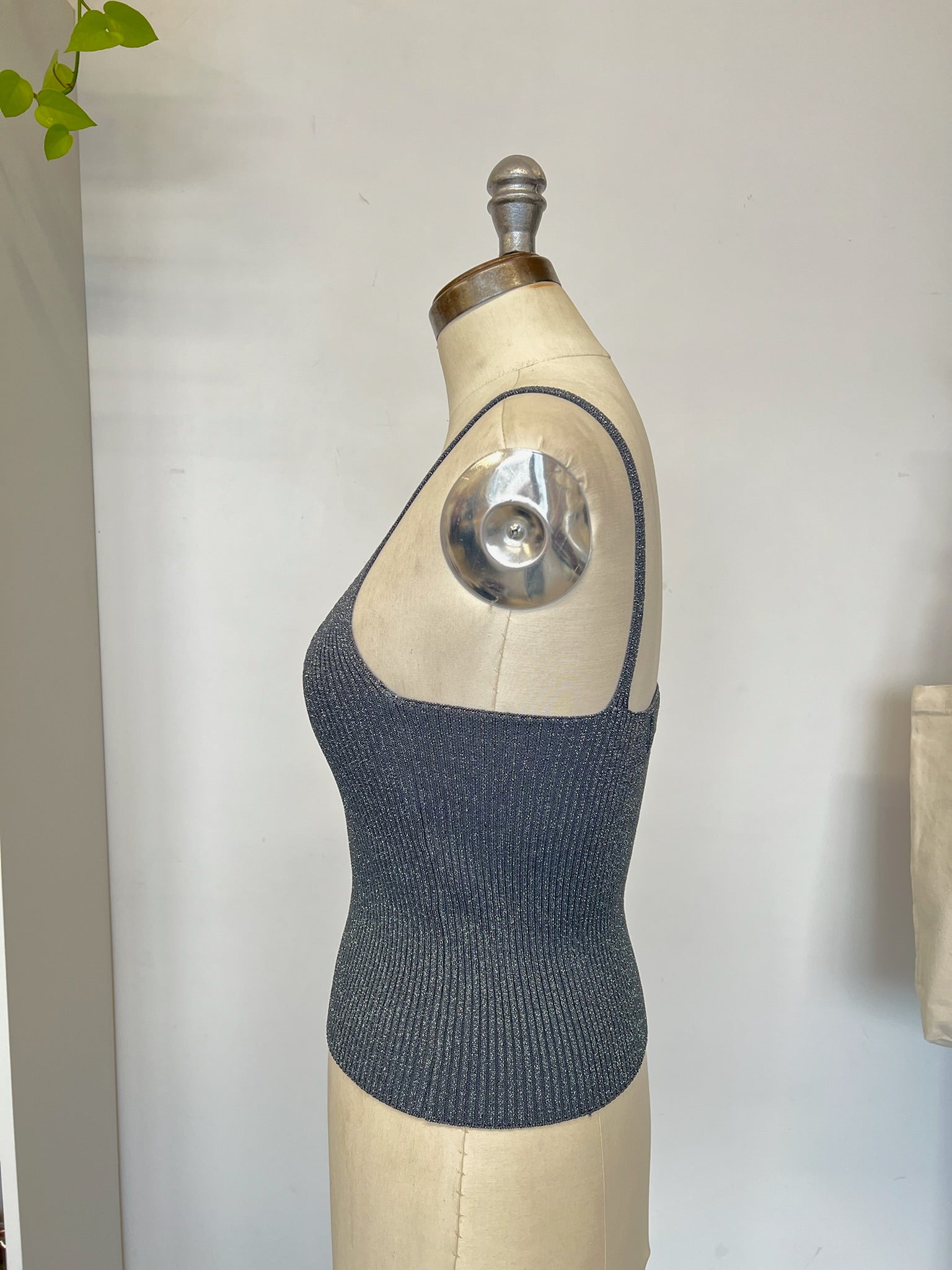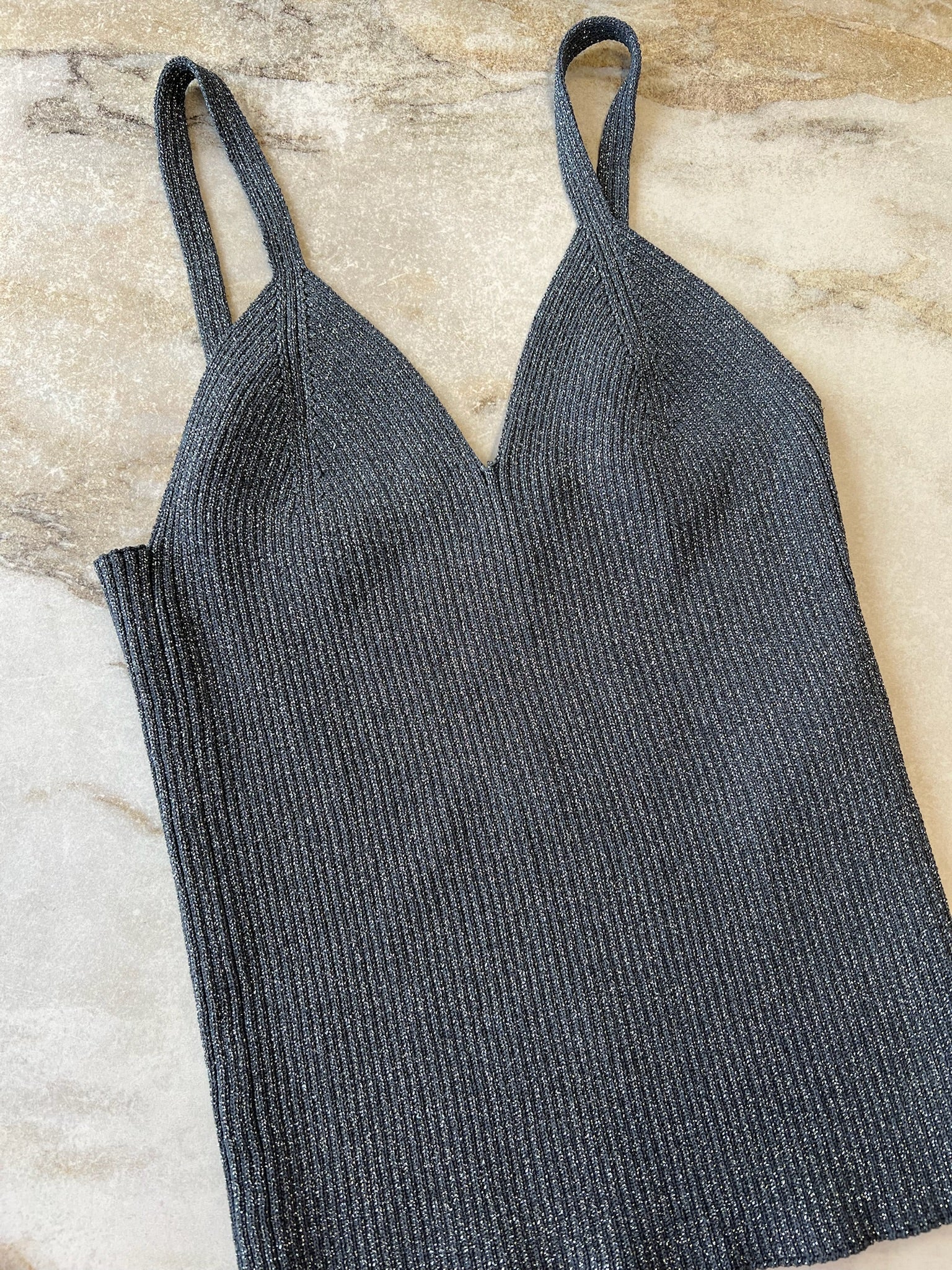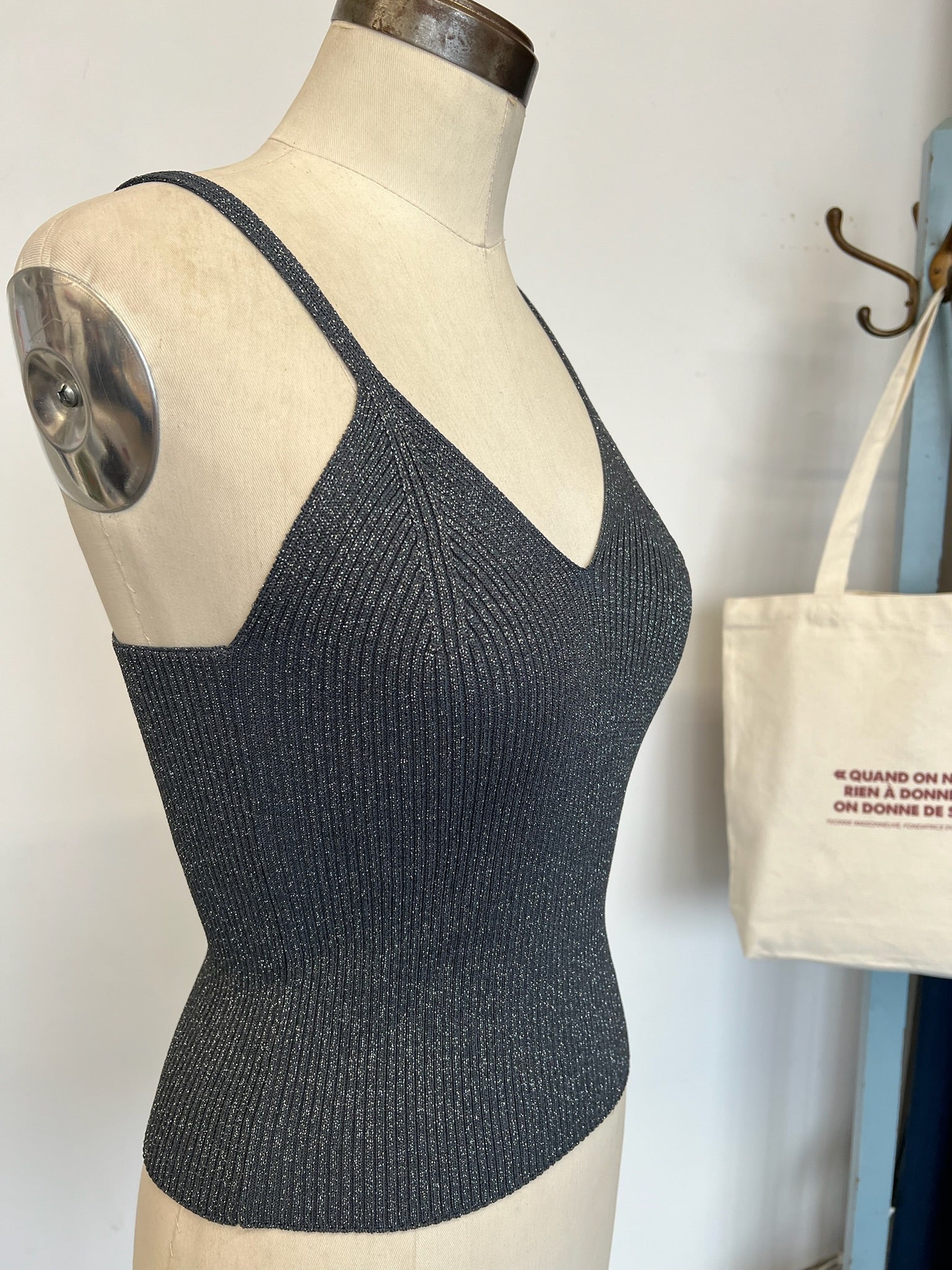 Camisole scintillante de la marque Samsøe Samsøe. Bretelles minces, col en V, tissu cotelé et très extensible.