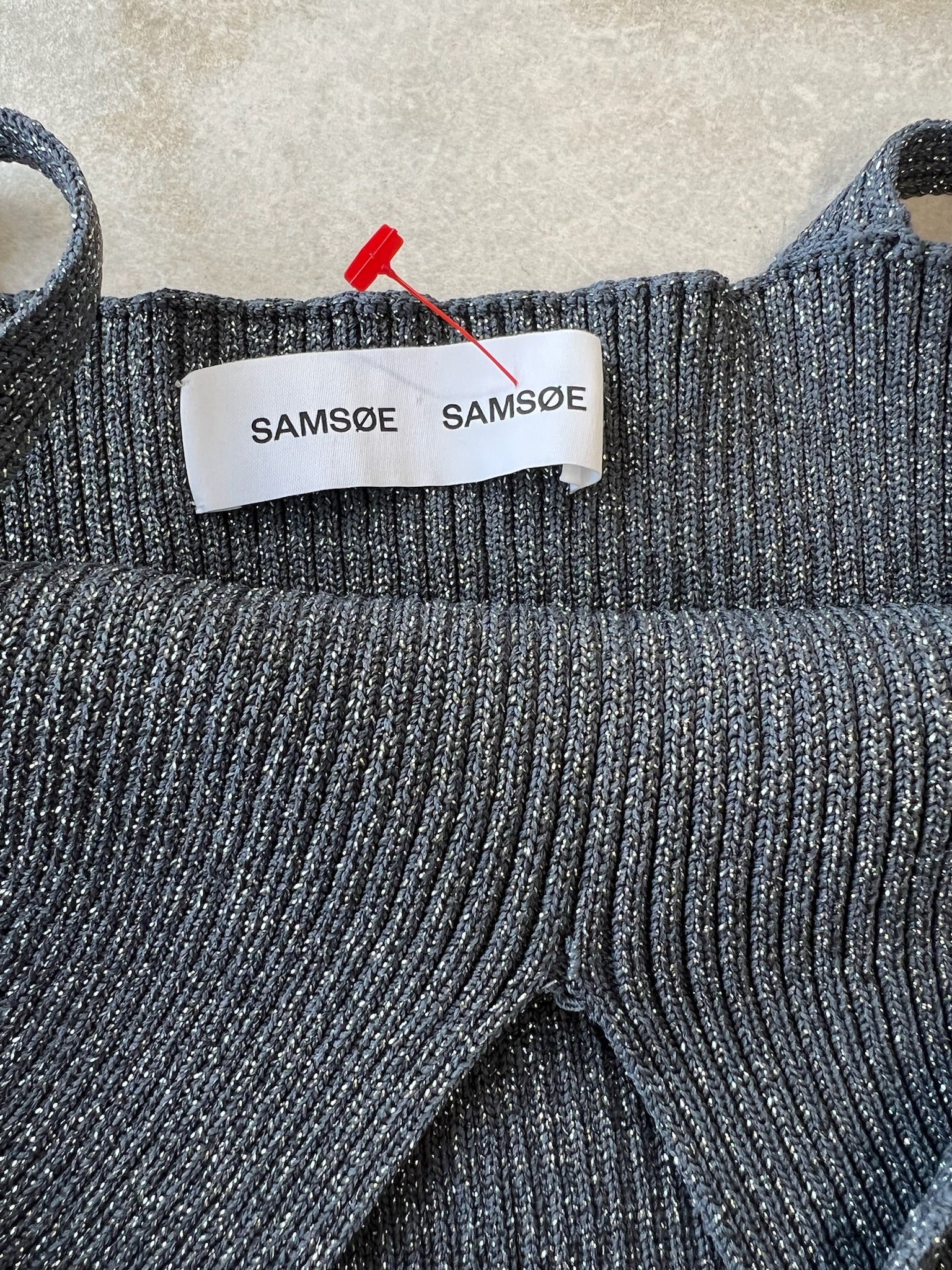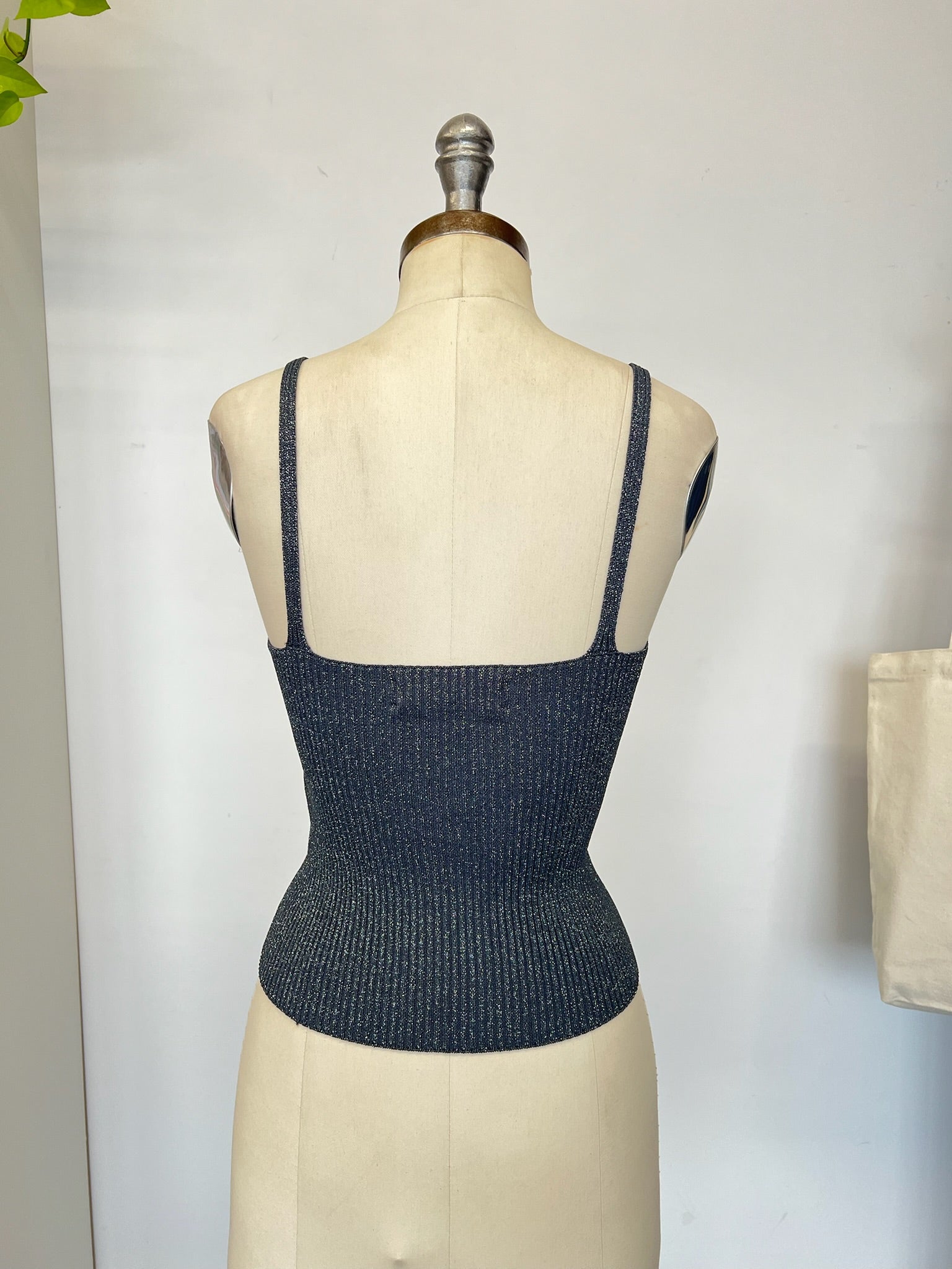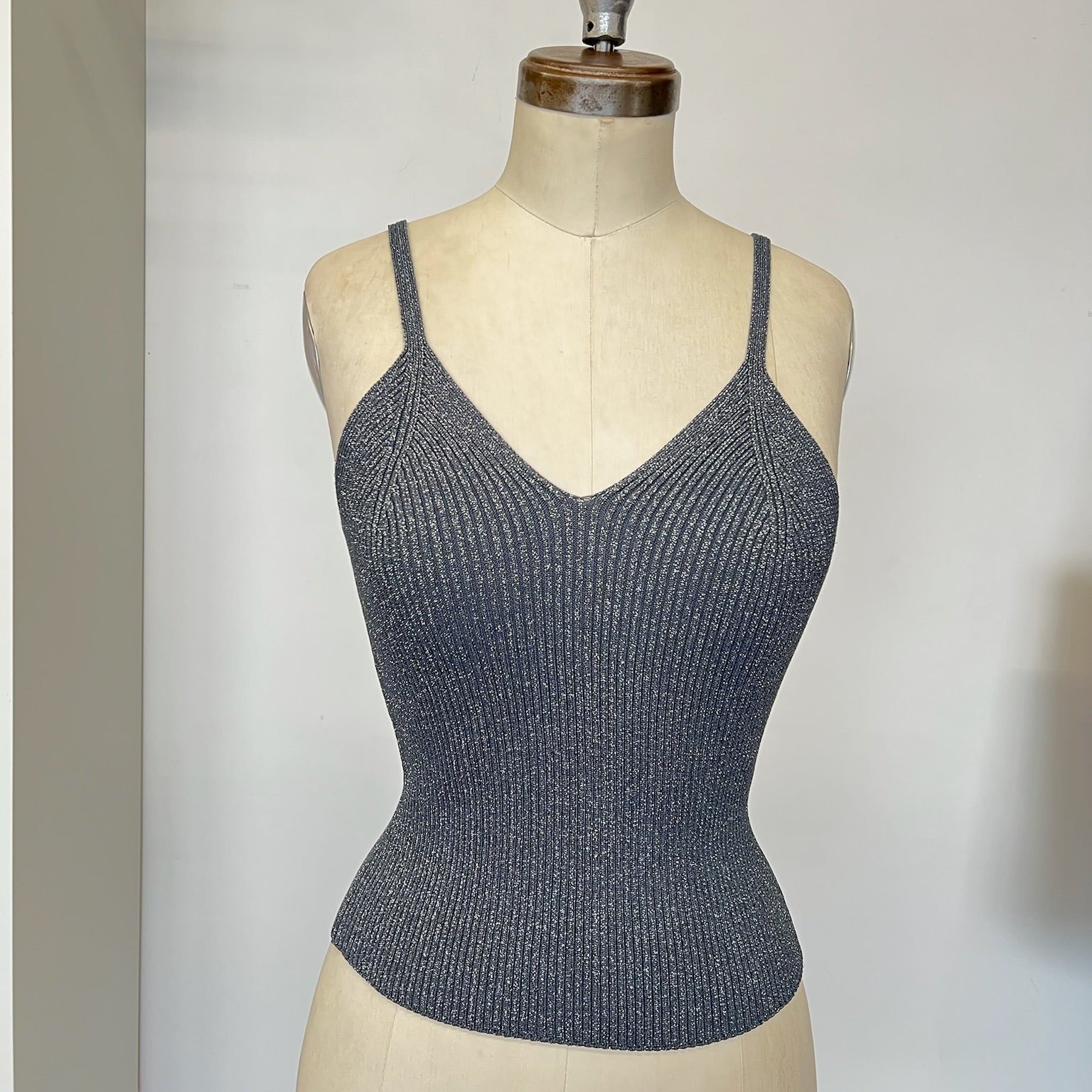 Camisole scintillante de la marque Samsøe Samsøe. Bretelles minces, col en V, tissu cotelé et très extensible.