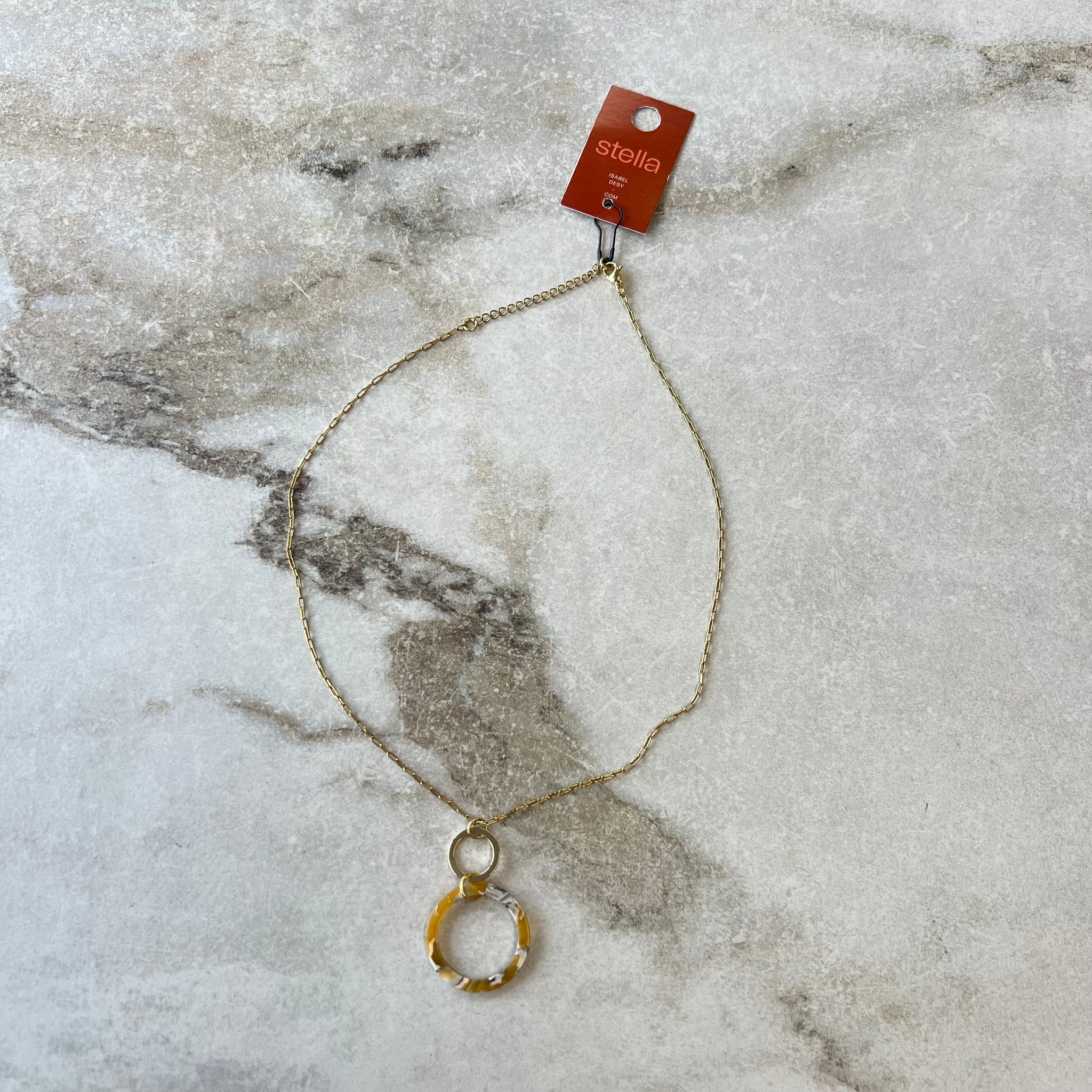 Collier fait à la main de la marque Stella par Isabel Désy #3599. Pendentif court sur chaîne longue inox or, grosse breloque acétate et anneau or inox or.
