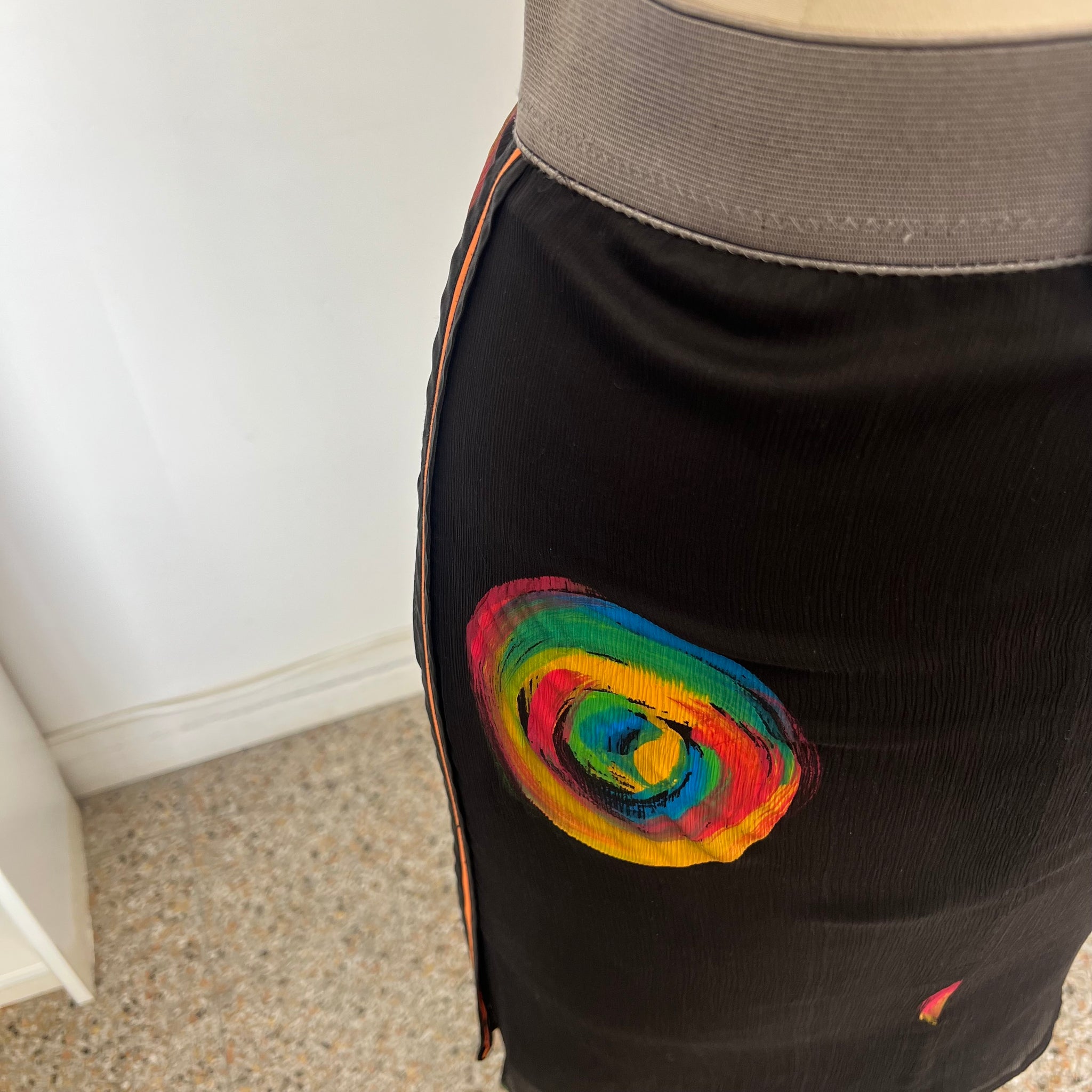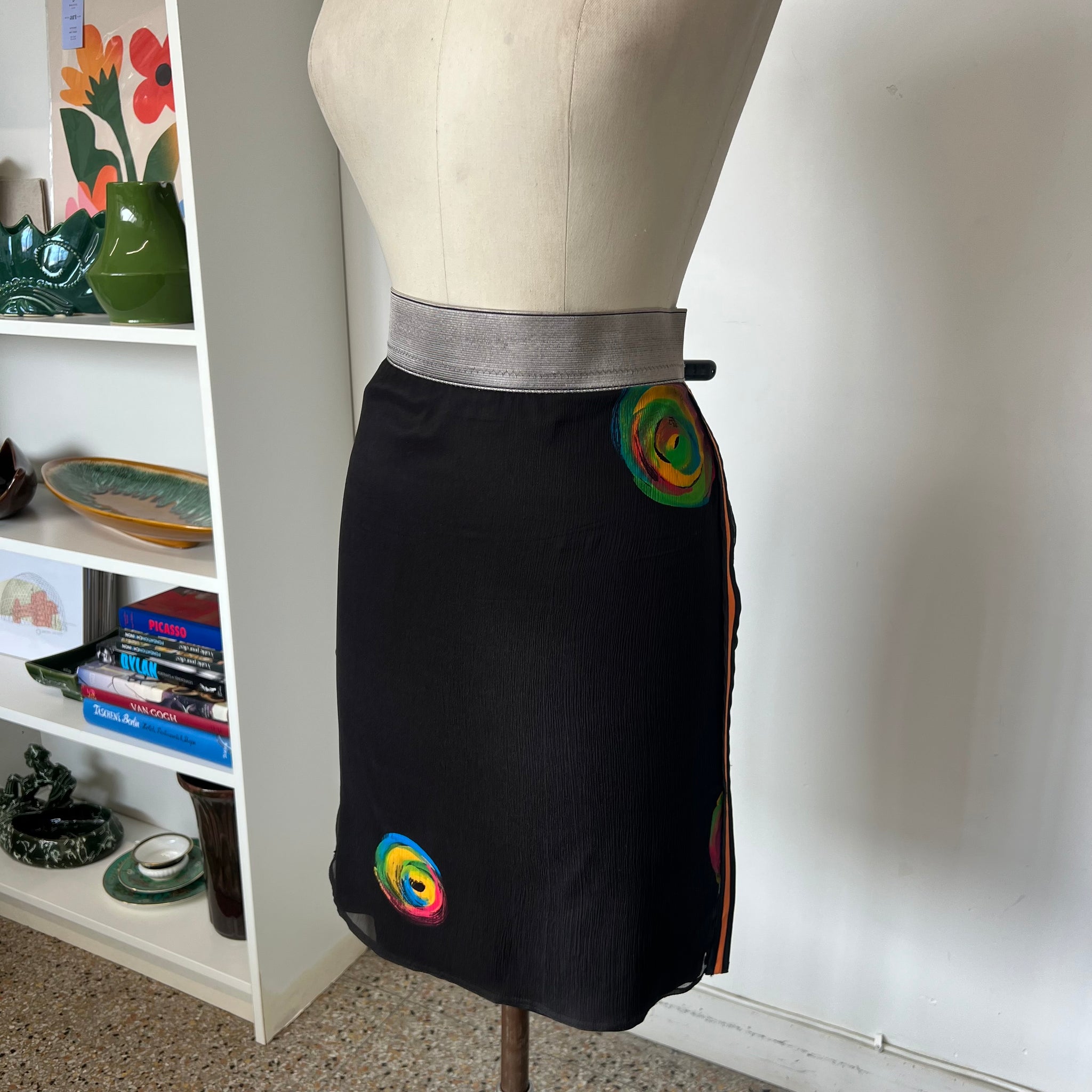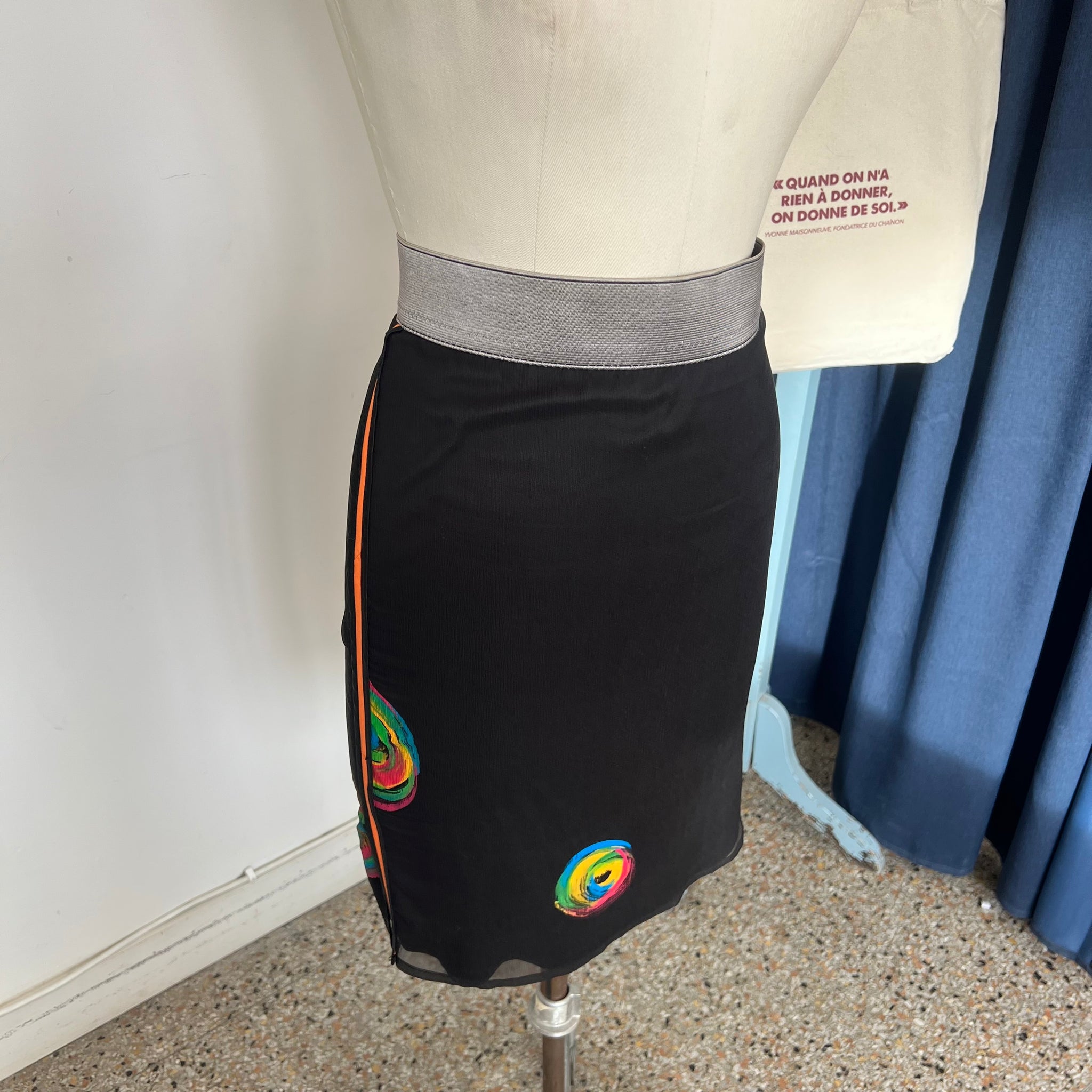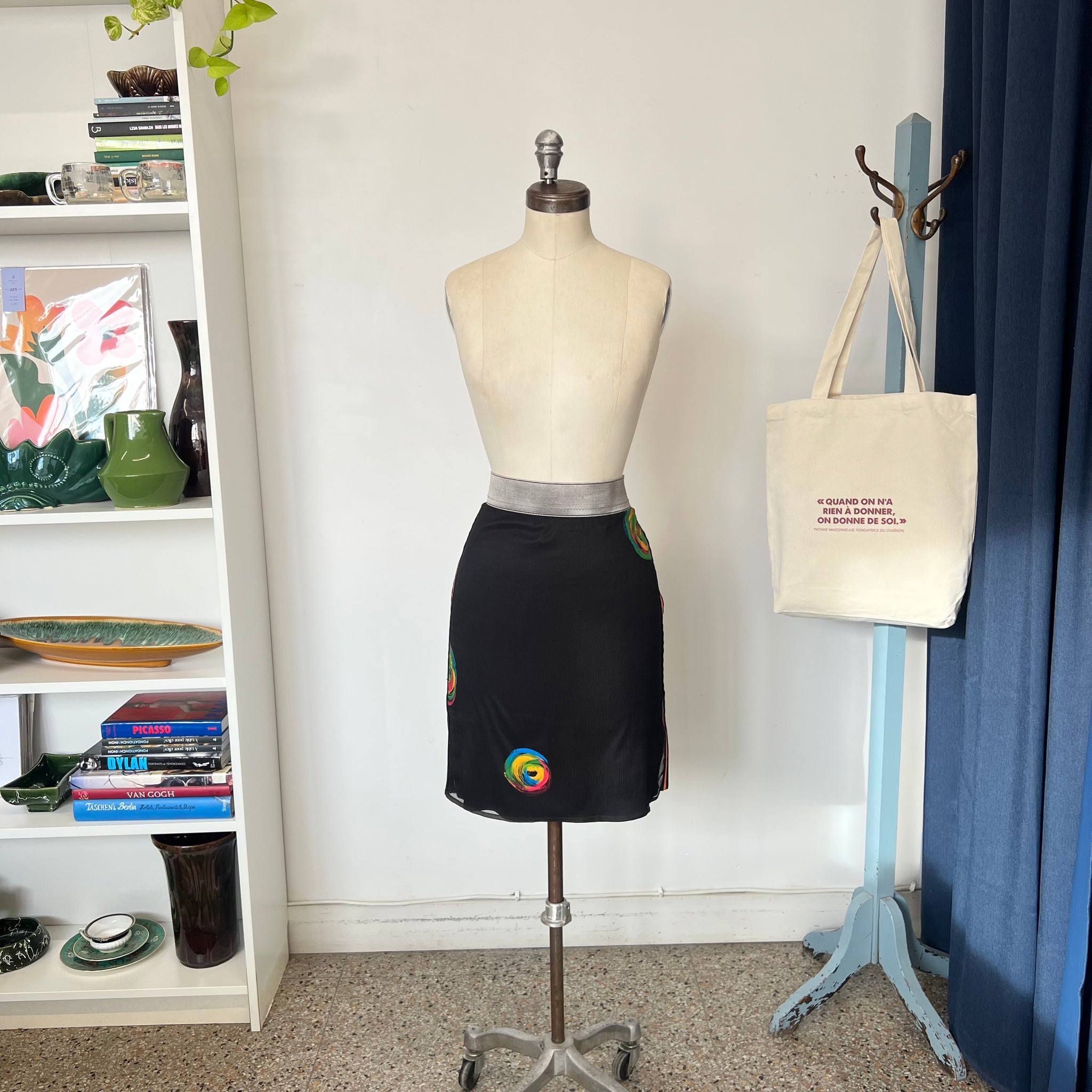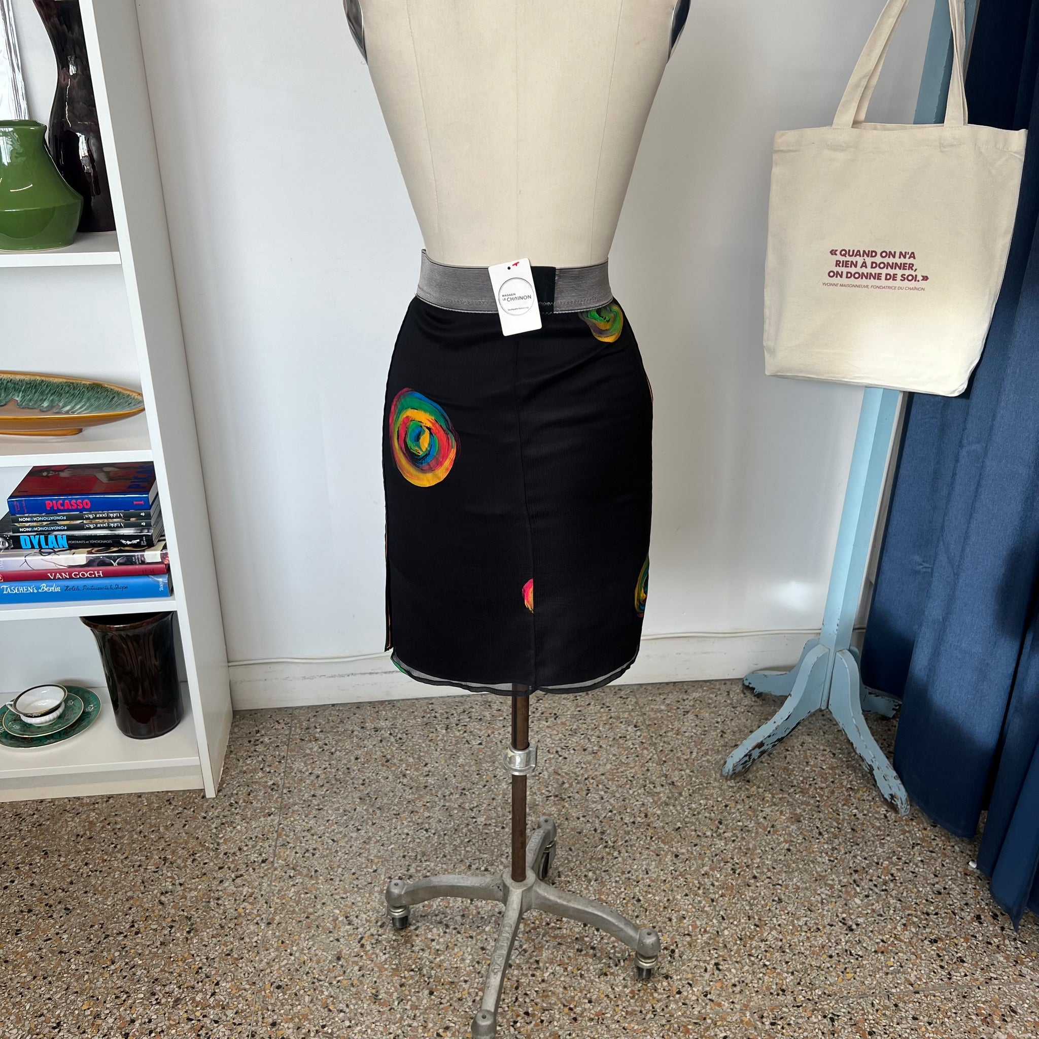 Jupe Marie Saint Pierre avec élastique à la taille. Imprimé de cercles et lignes oranges sur le coté. Tissu doublé.