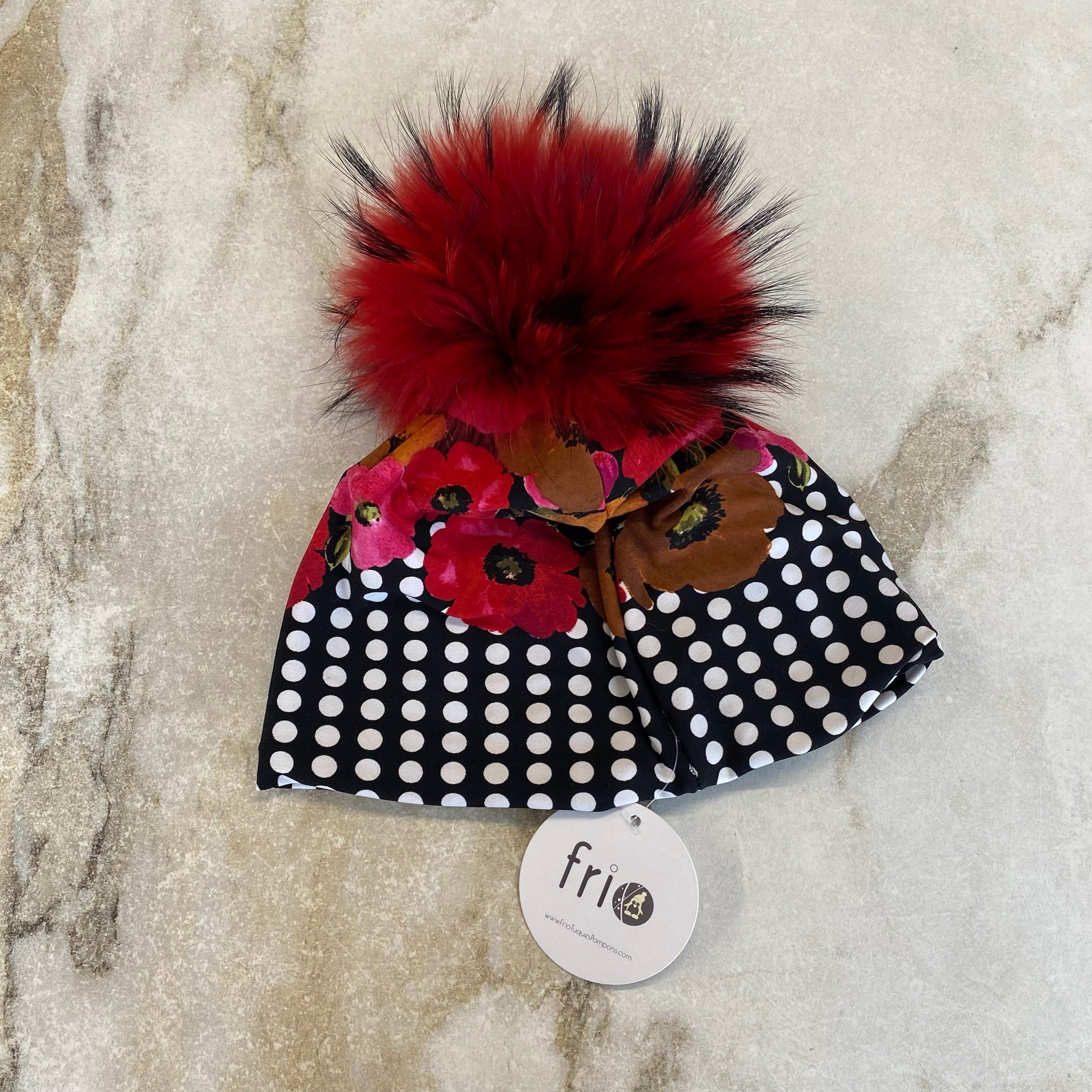 Tuque à pompons de la marque Frio modèle Sandra. Doublé en polaire, pompons amovible (bouton pression).