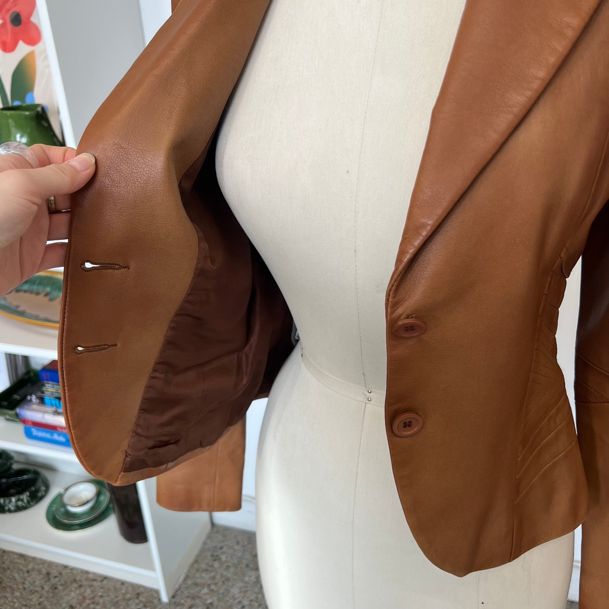 Veste en cuir de la marque id. Collection. S'attache avec deux boutons, boutons décoratifs aux manches.