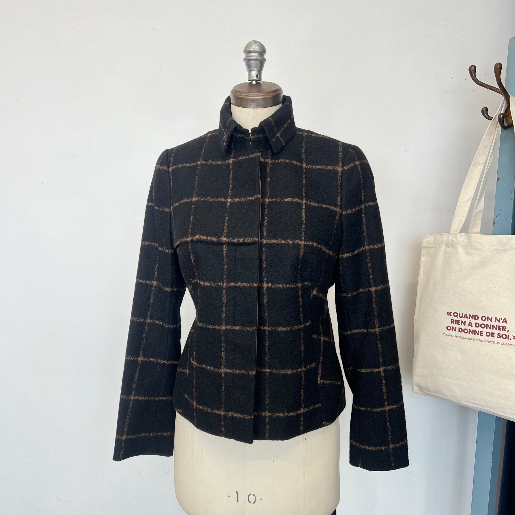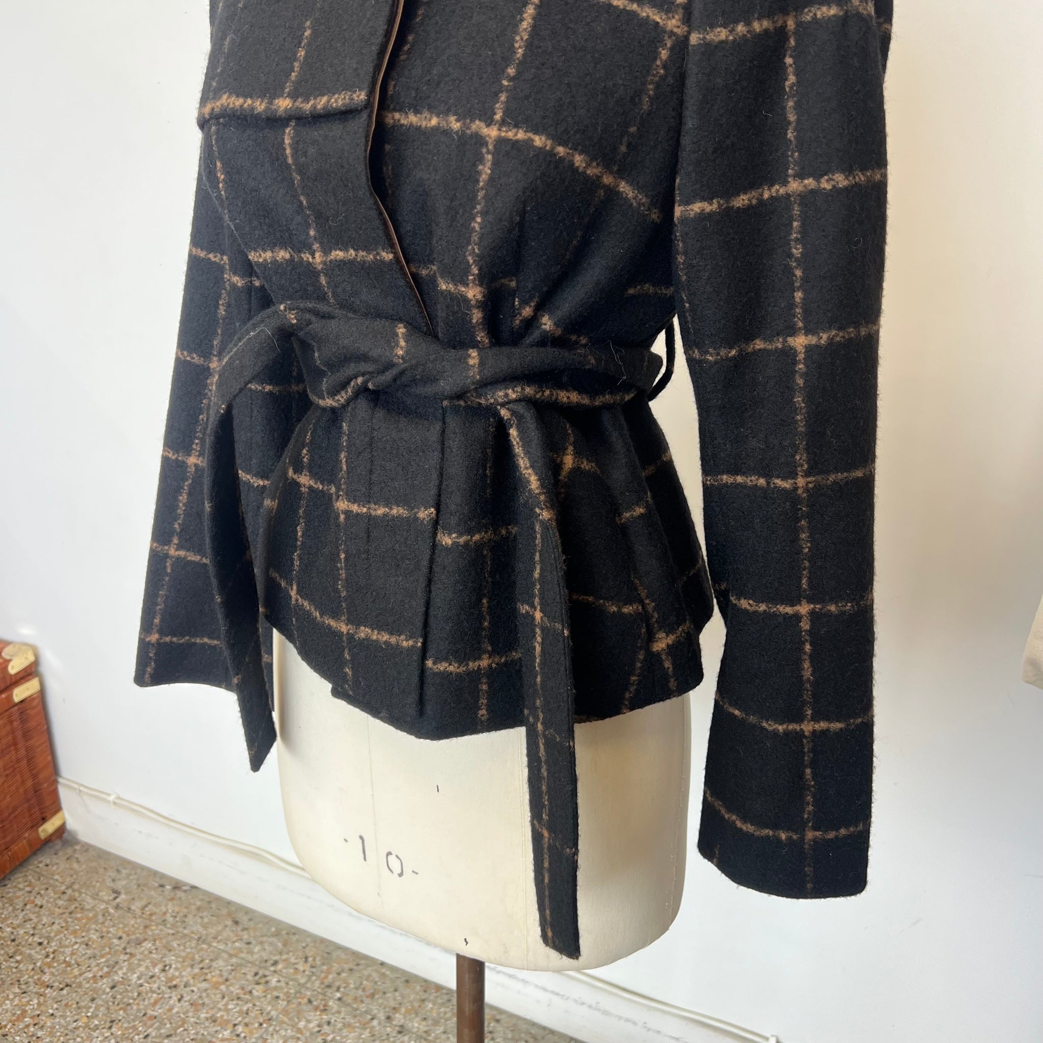 Veste courte de la marque Akris Punto, peut faire comme manteau. Avec boutonnièere et collet amovible. Deux poches latérales, une ceinture et épaulettes discrètes intégrées. D'une valeur de plus de 500$