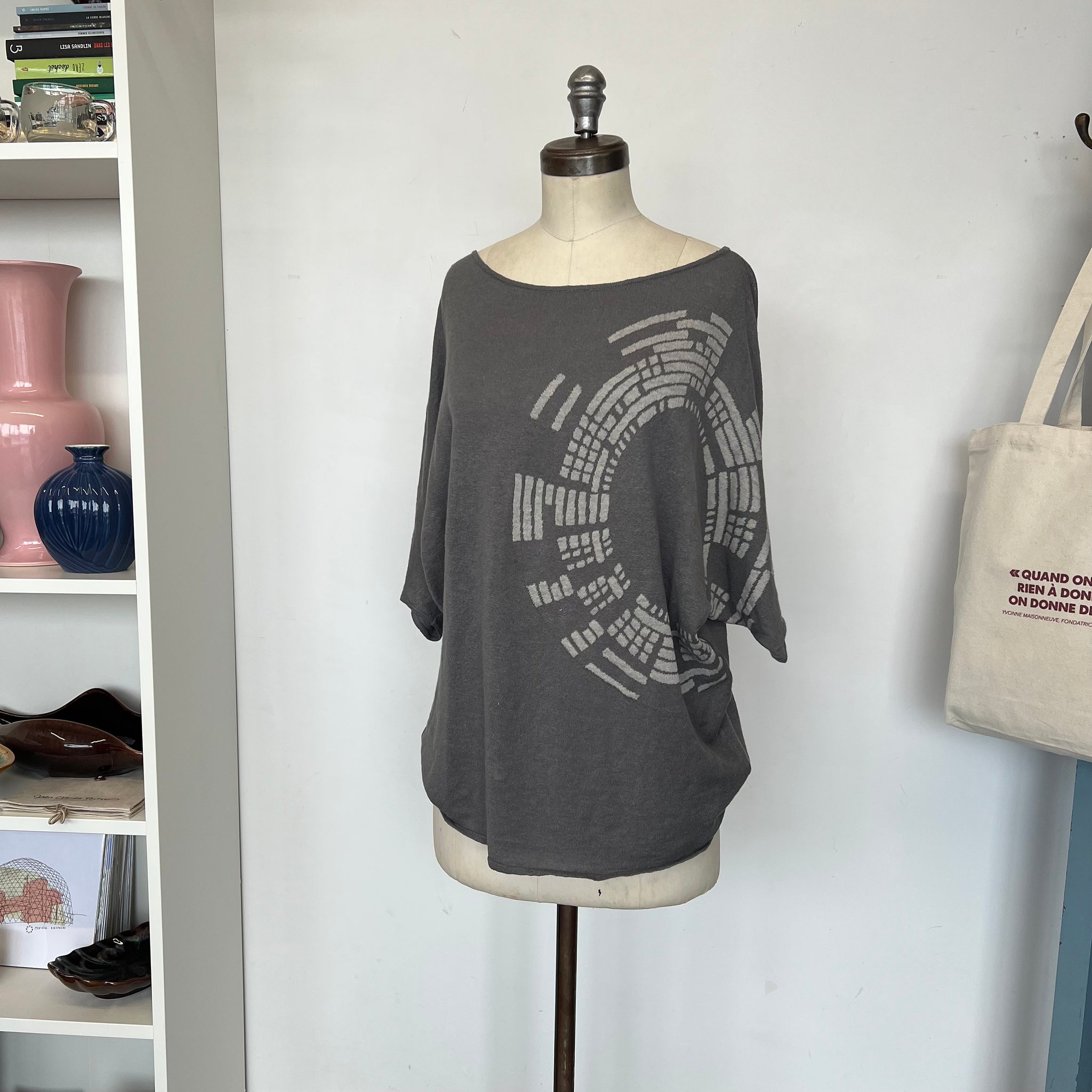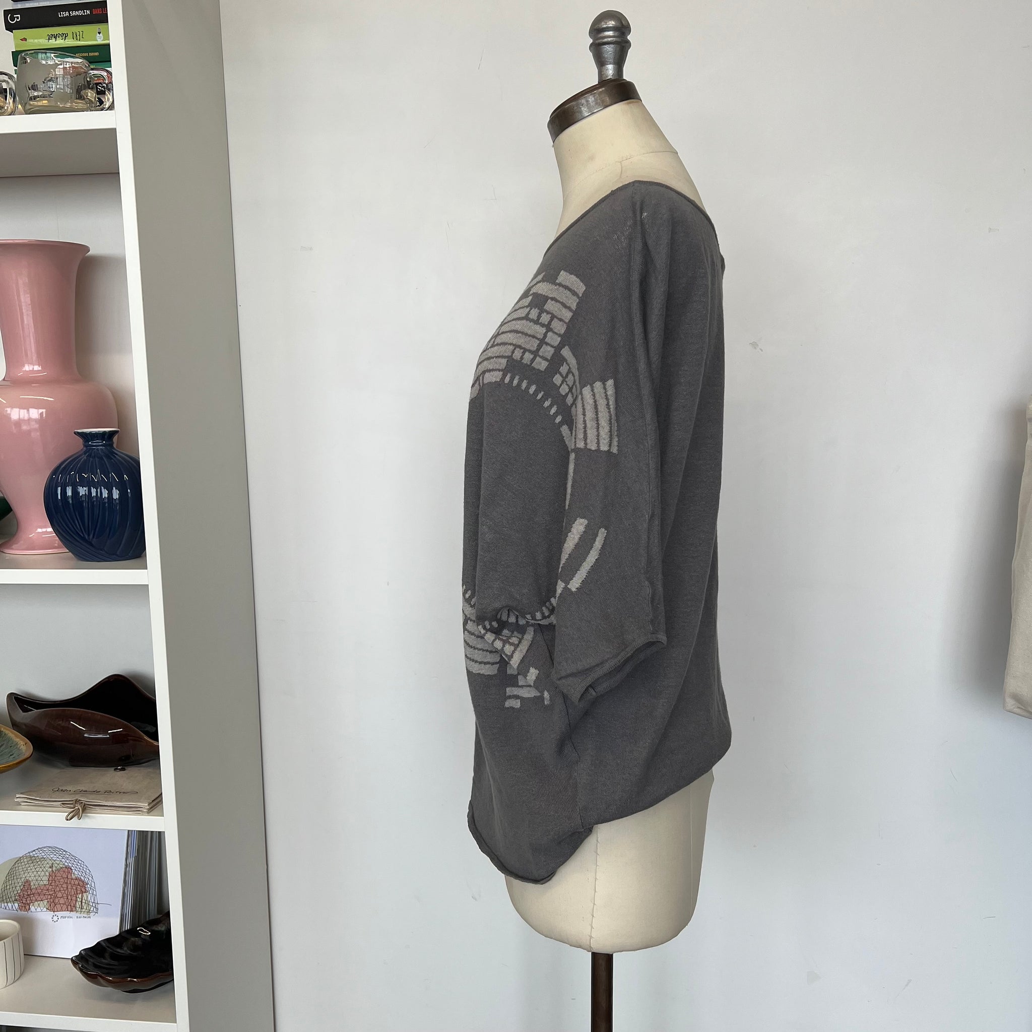 Chandail à manches courtes en genre de tricot mince de la marque Sarah Pacini. Avec motifs ronds et mailles transparentes. Encolure ronde. Manches 3/4 faites serrées aux extrémités.
