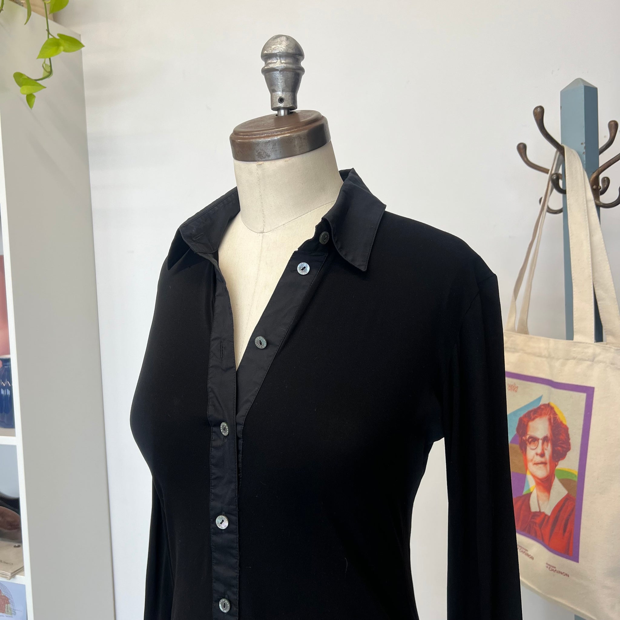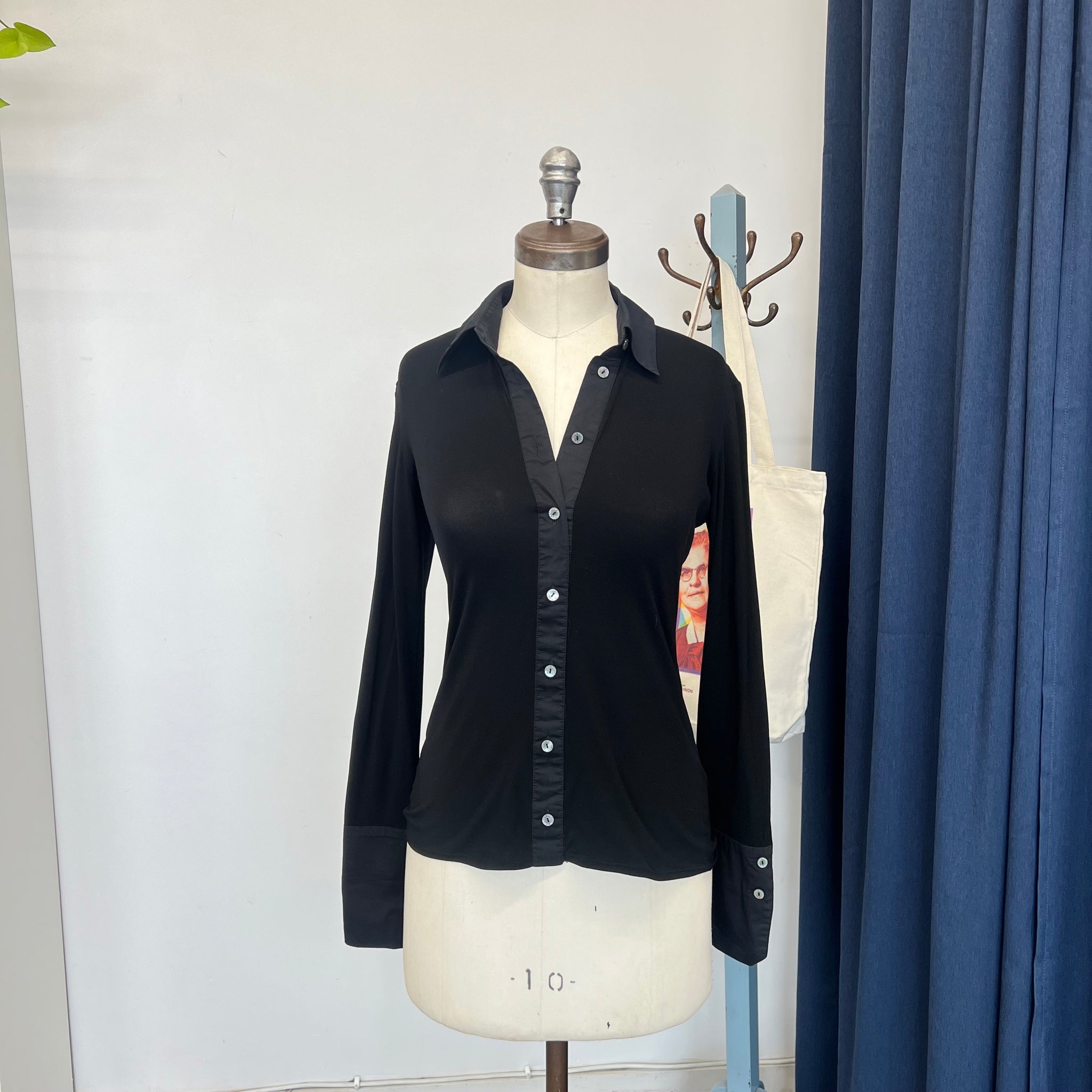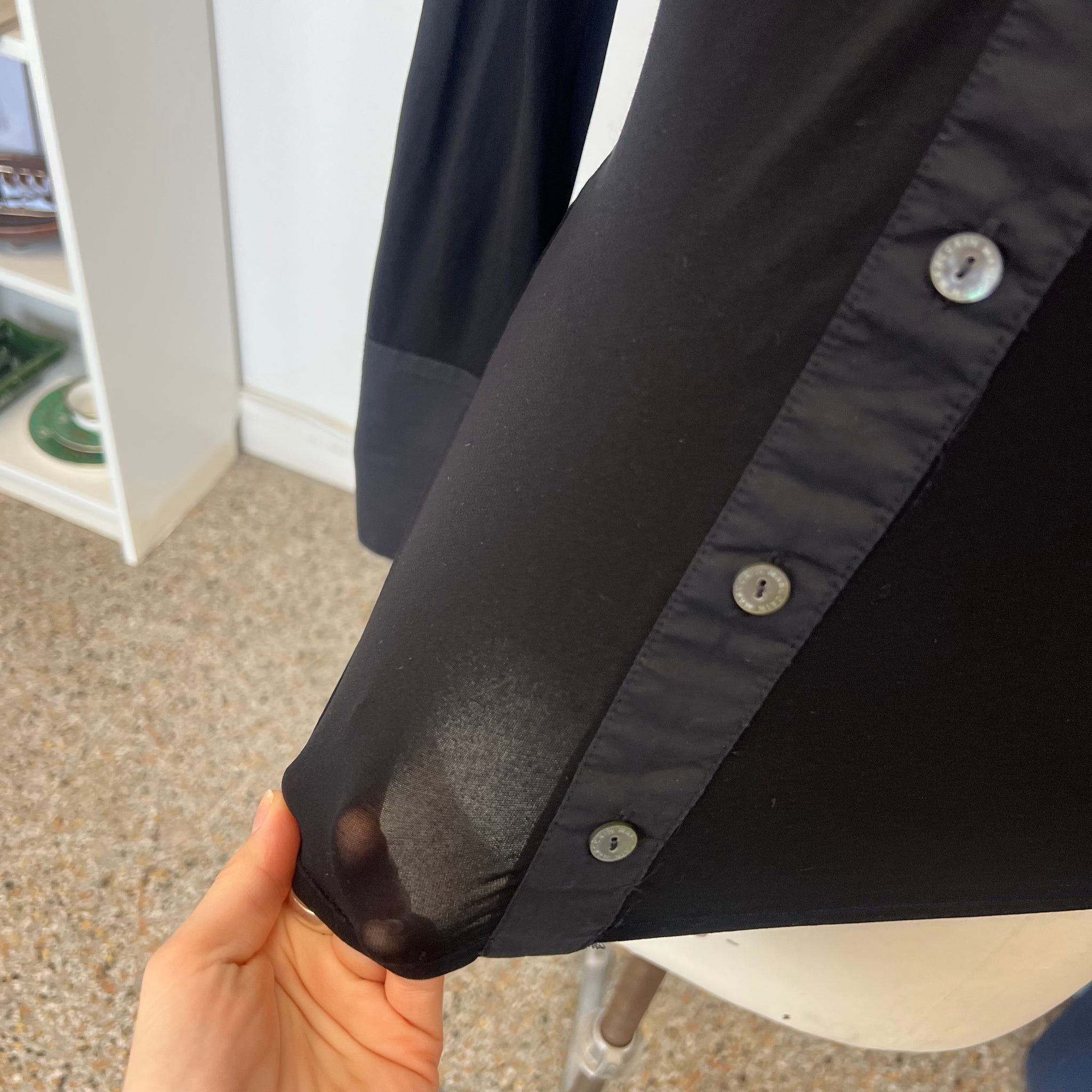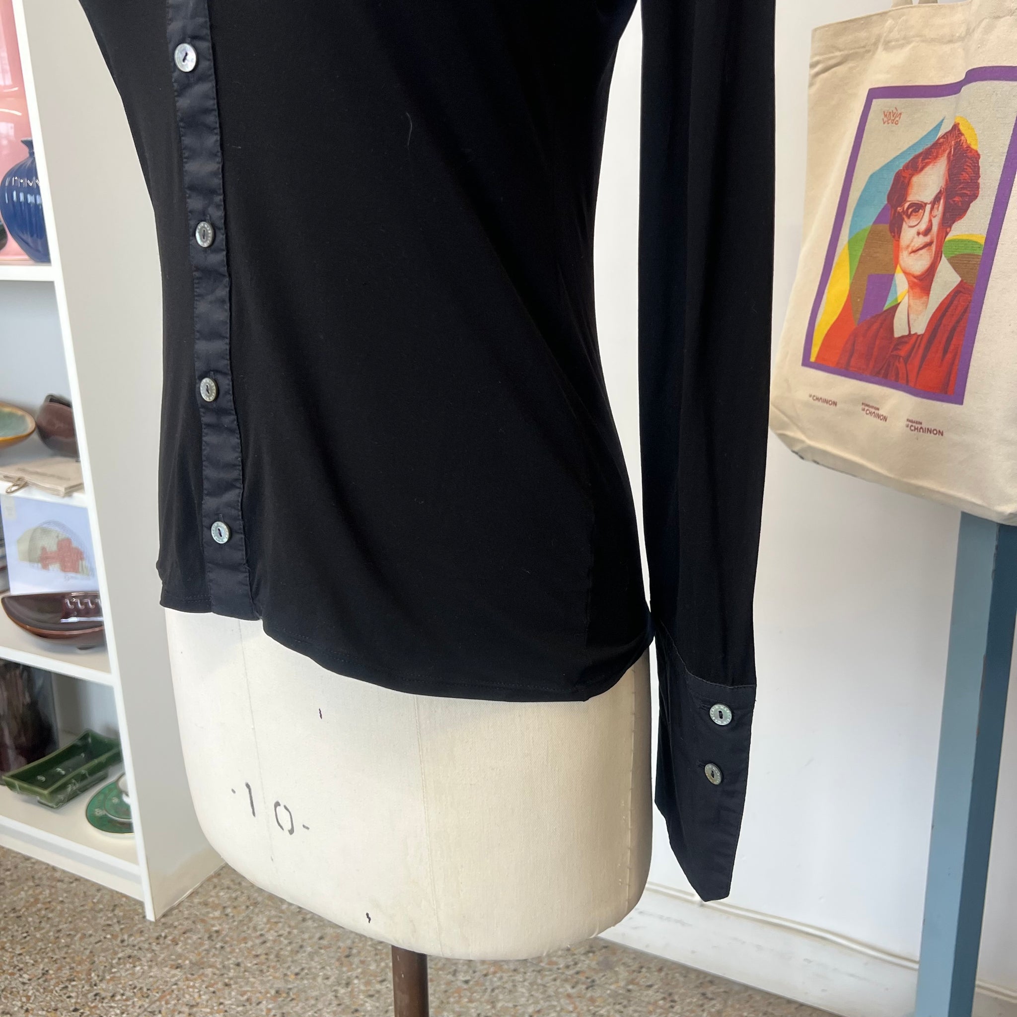 Blouse raffinée à col, patte de boutonnage et larges poignets, confectionnée dans un tissu extensible contrastant du plus bel effet. Des boutons logo scintillants, effet nacre, ornent le devant de cette blouse basique et douce, apportant une touche de subtilité. Sa coupe fluide et sa délicate transparence flattent la silhouette. D'une valeur de près de 300$.