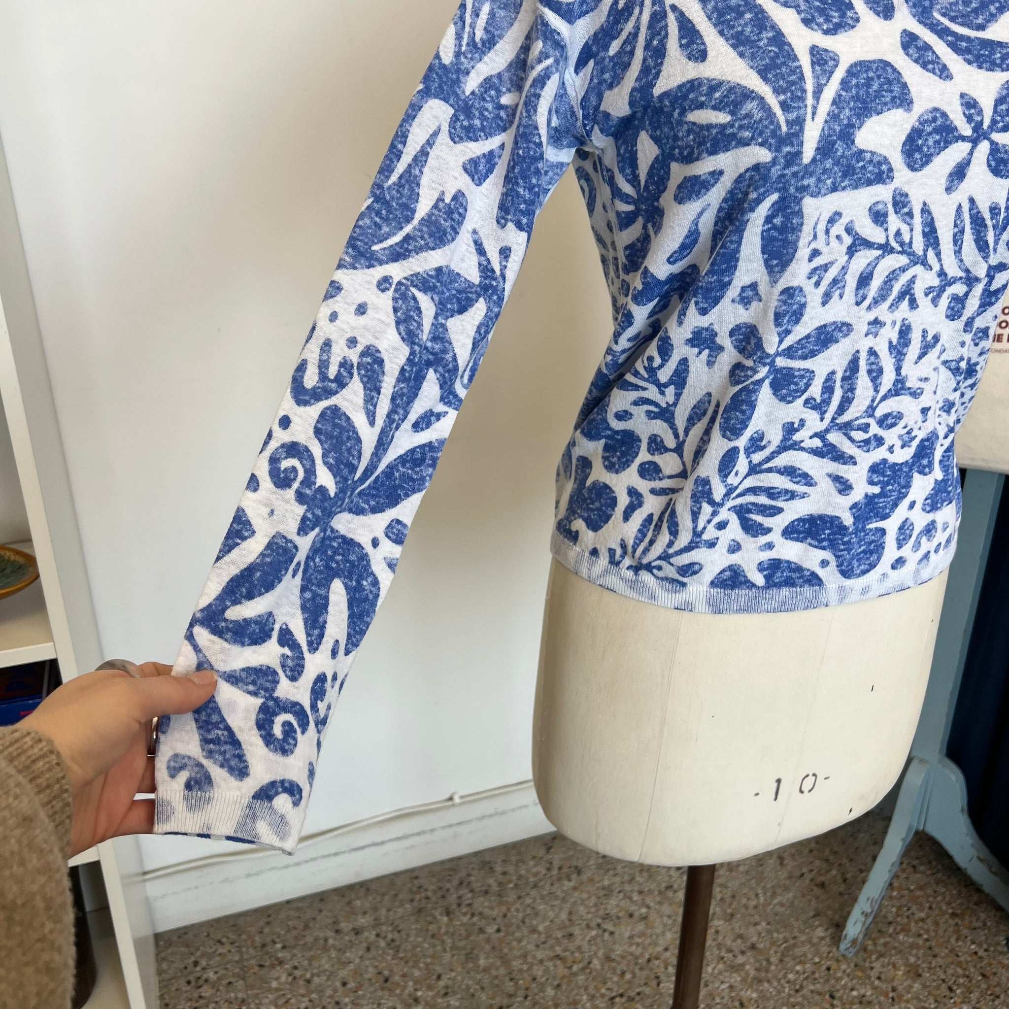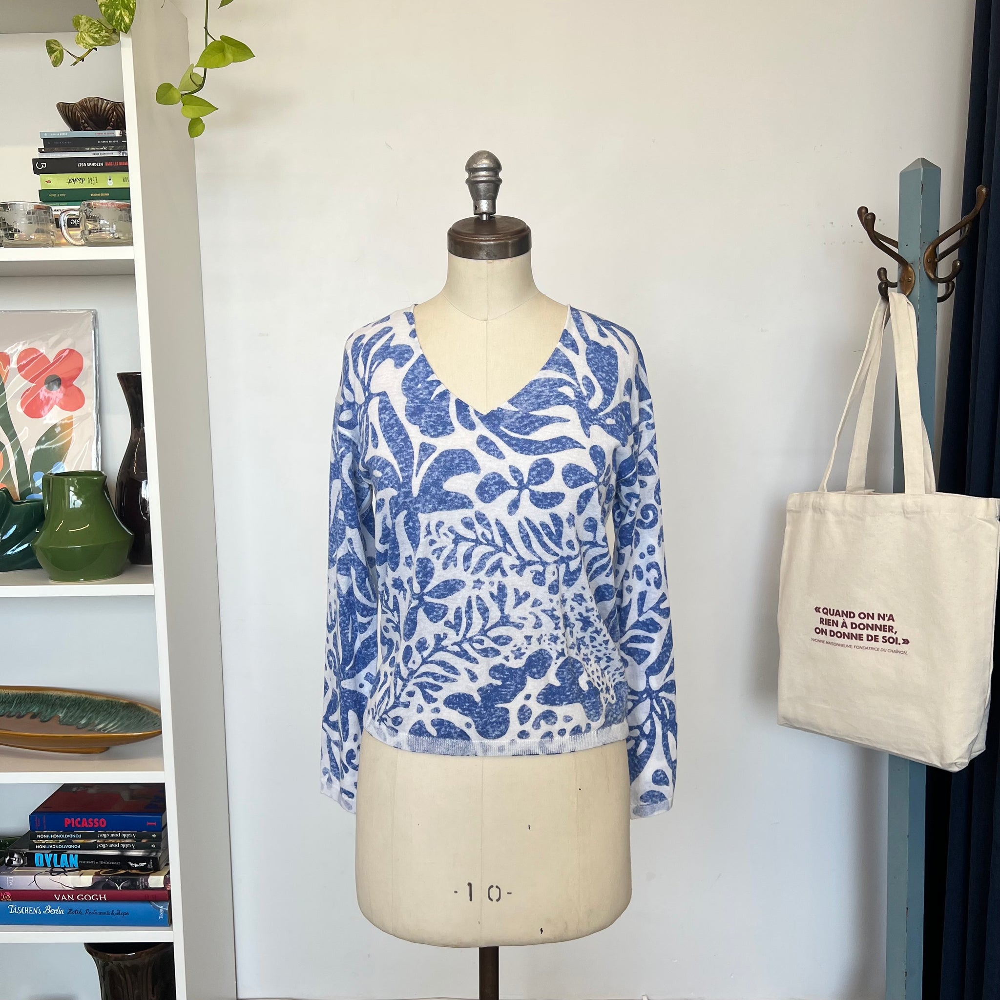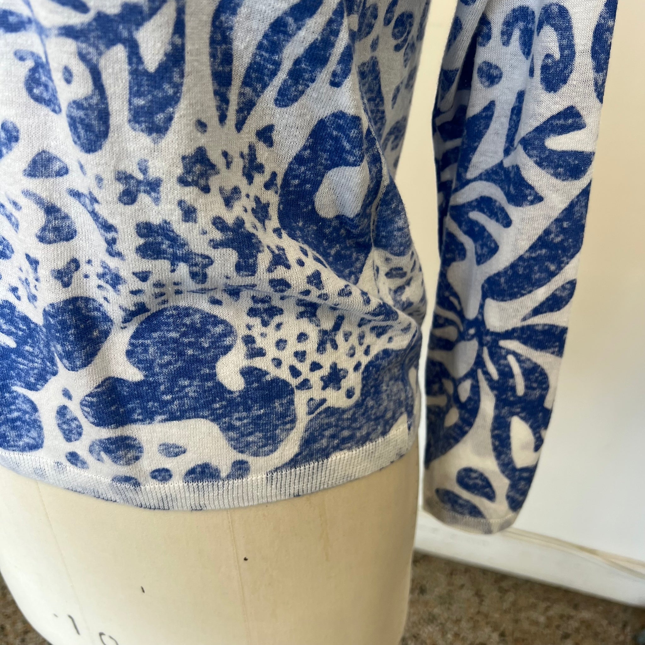 Ce pull Oui 78625 confortable présente une coupe décontractée et est confectionné dans un mélange de lin et de coton, pour une sensation de légèreté et de respirabilité. Orné d'un imprimé bleu et blanc audacieux, ce pull est doté de manches longues et d'un col en V flatteur. 'Dune valeur de 285$
