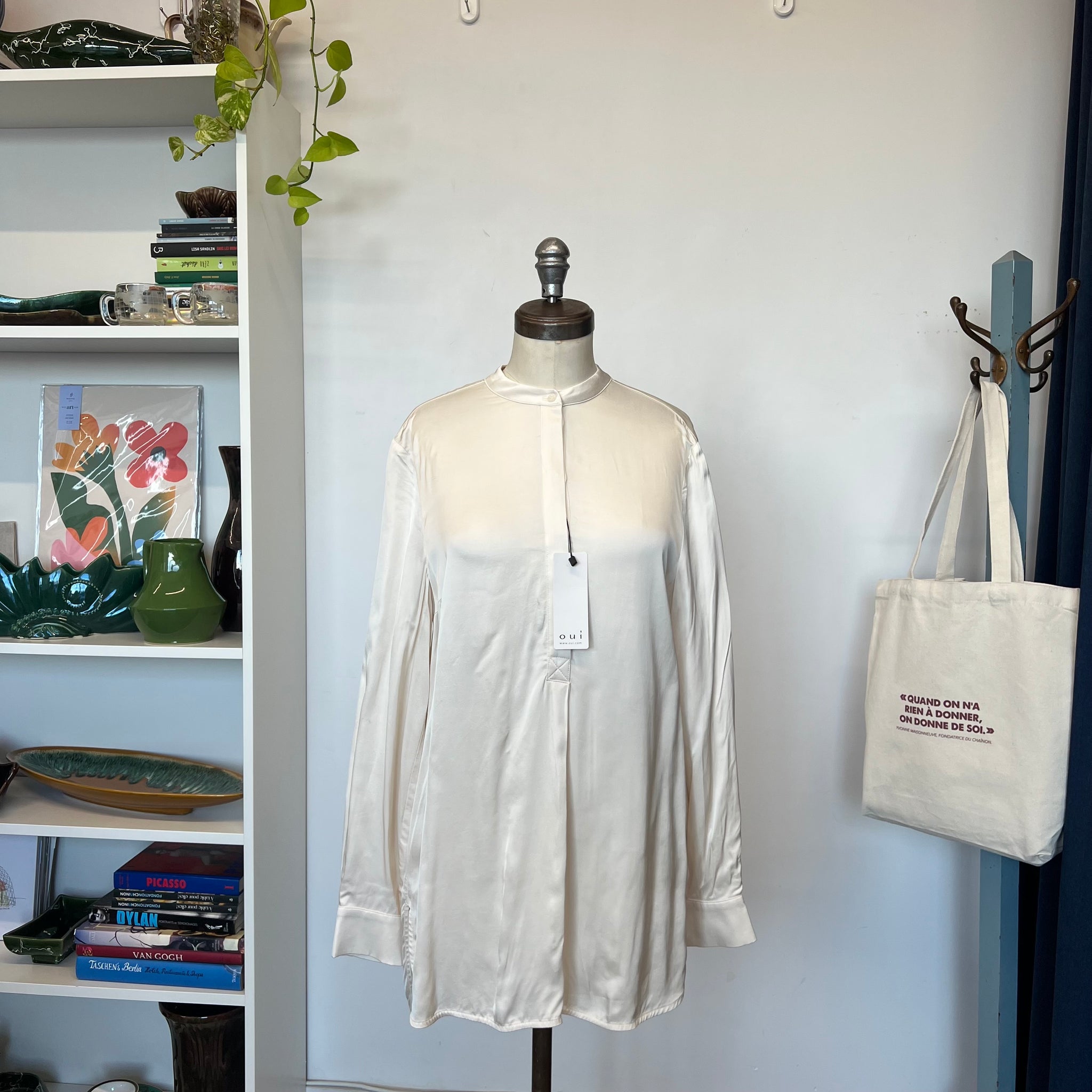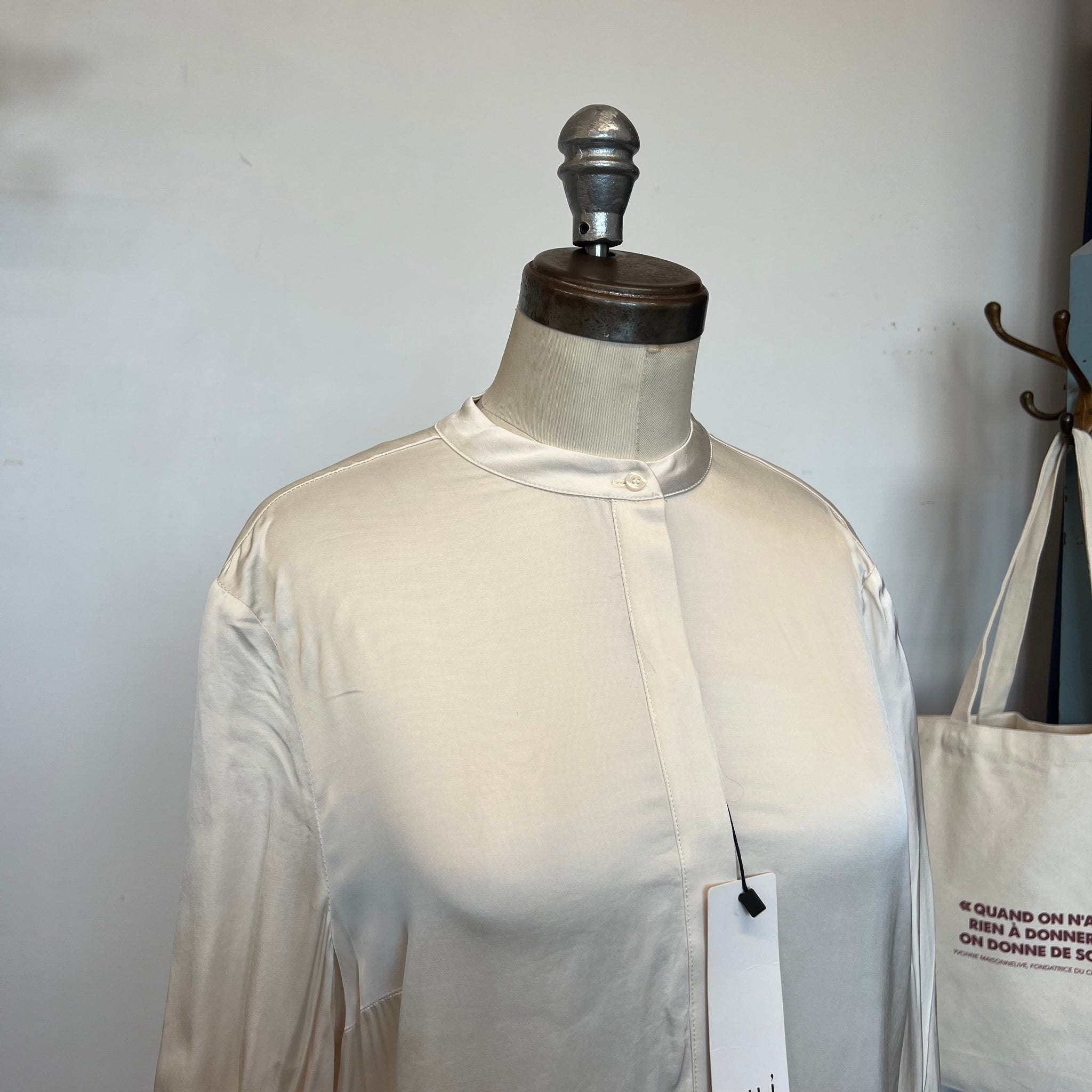 Une magnifique blouse en satin soyeux blanc cassé, avec une patte de boutonnage dissimulée et une coupe plus longue, idéale pour la superposition. D'une valeur de 265$.