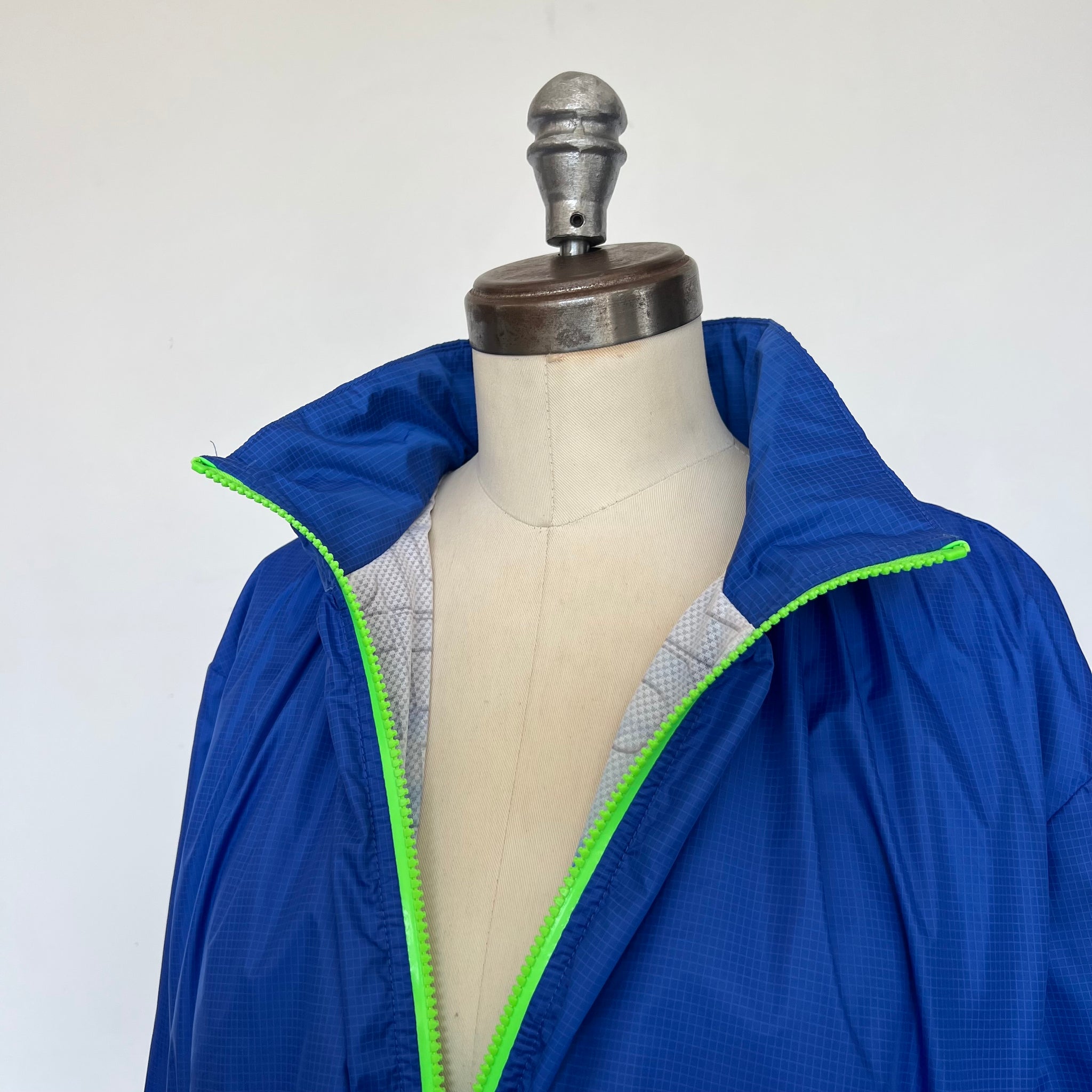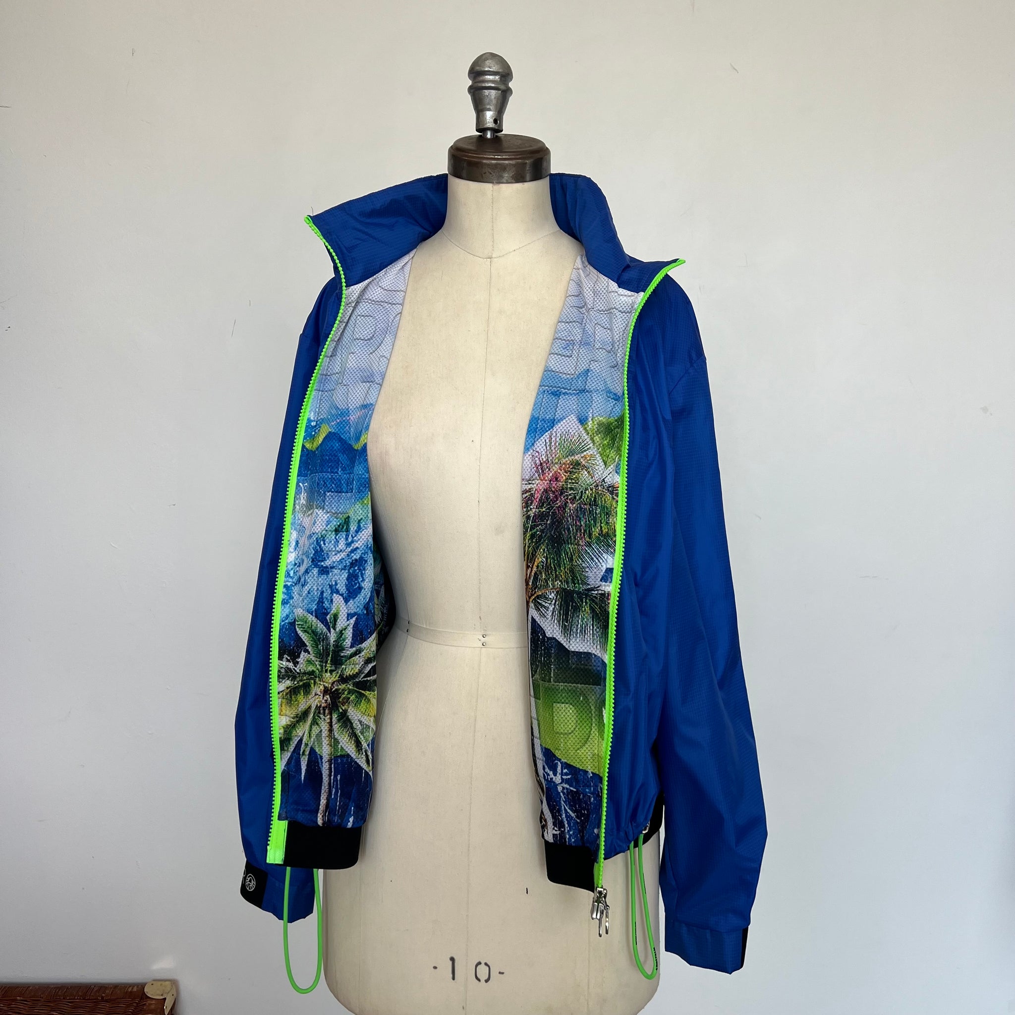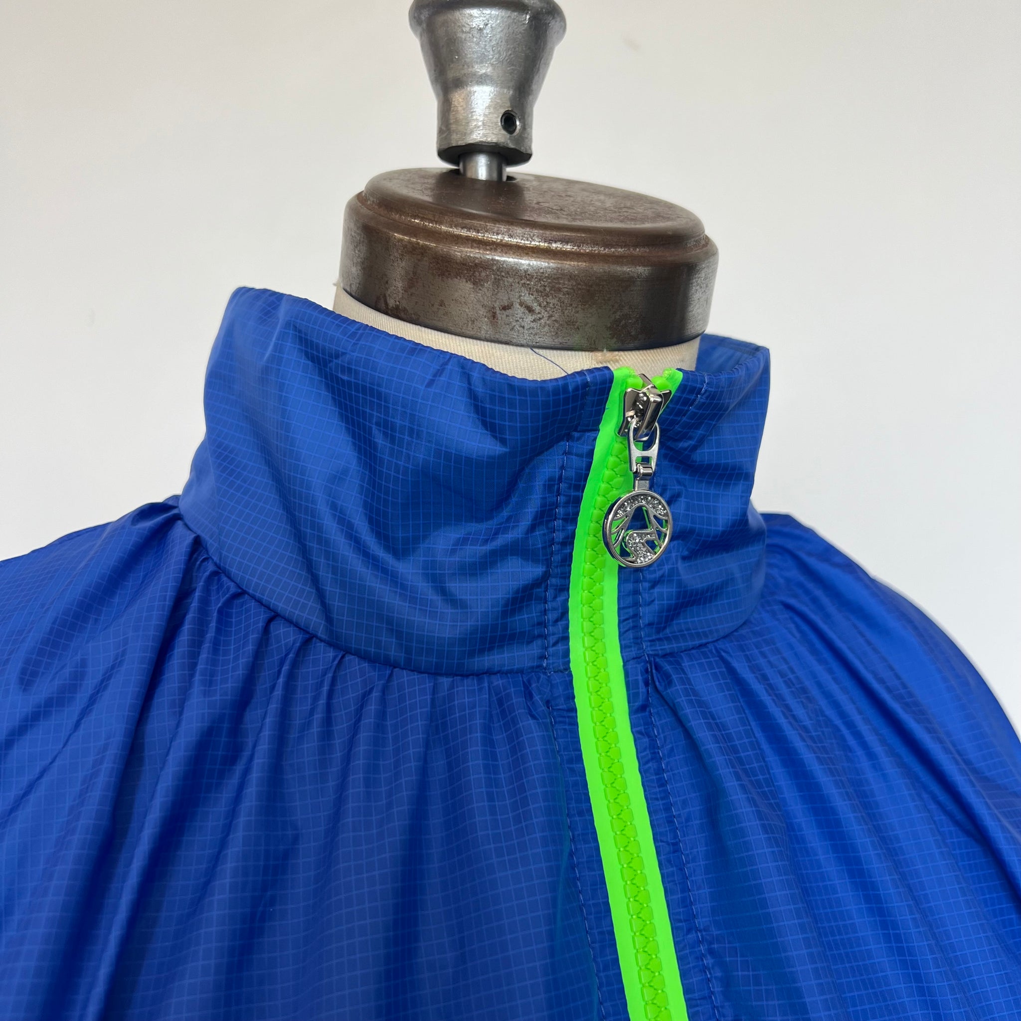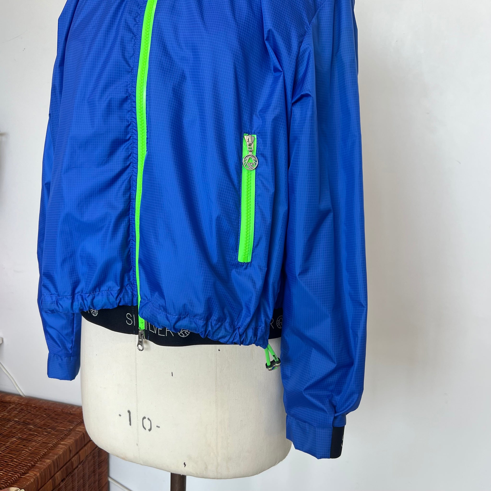 Manteau court imperméable de la marque Sportalm Ulli Ehrlich. Avec fermeture éclair vert néon double, ganses élastiques ajustables à la taille (avant et arrière) et mince doublure. Imprimé carreauté ton sur ton et imprimé festif à l'intérieur du manteau. D'une valeur de 875$.