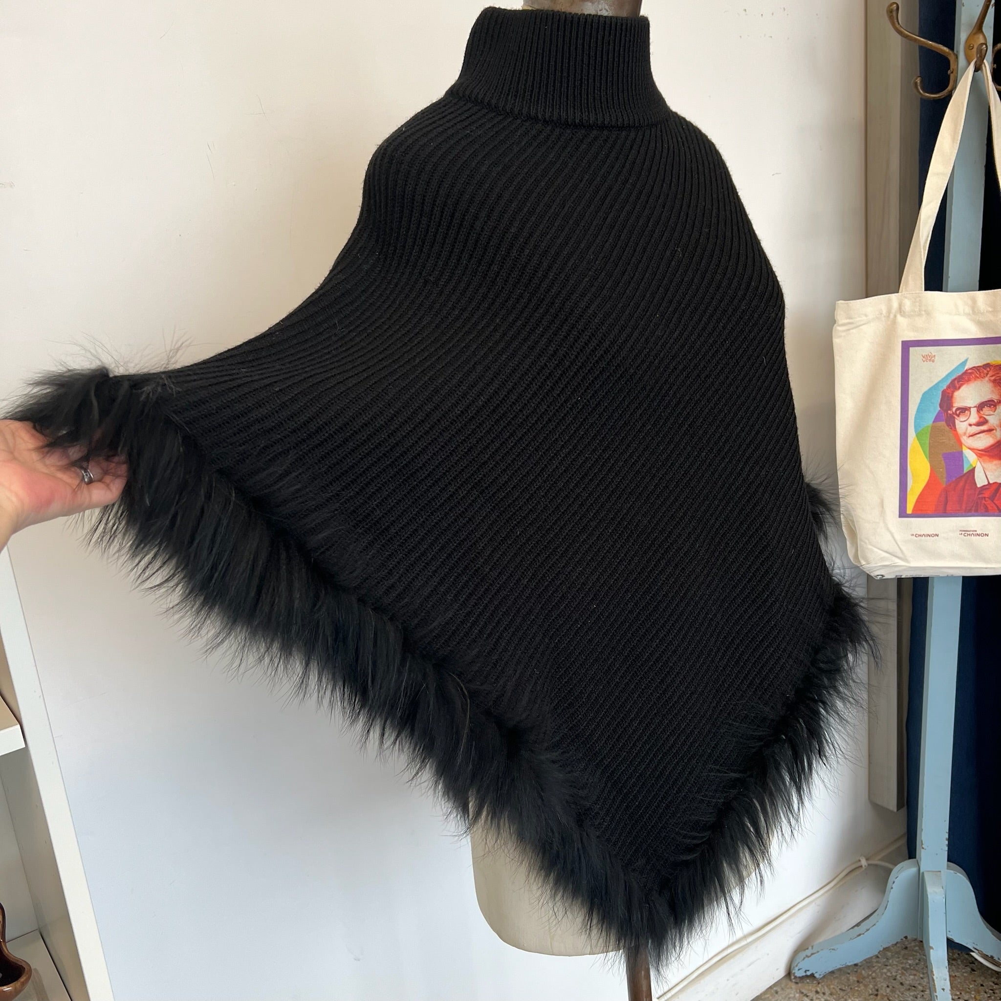 Poncho triangulaire en laine avec fourrure de la marque Liu Jo. Avec boutons pour attacher sous les bras.