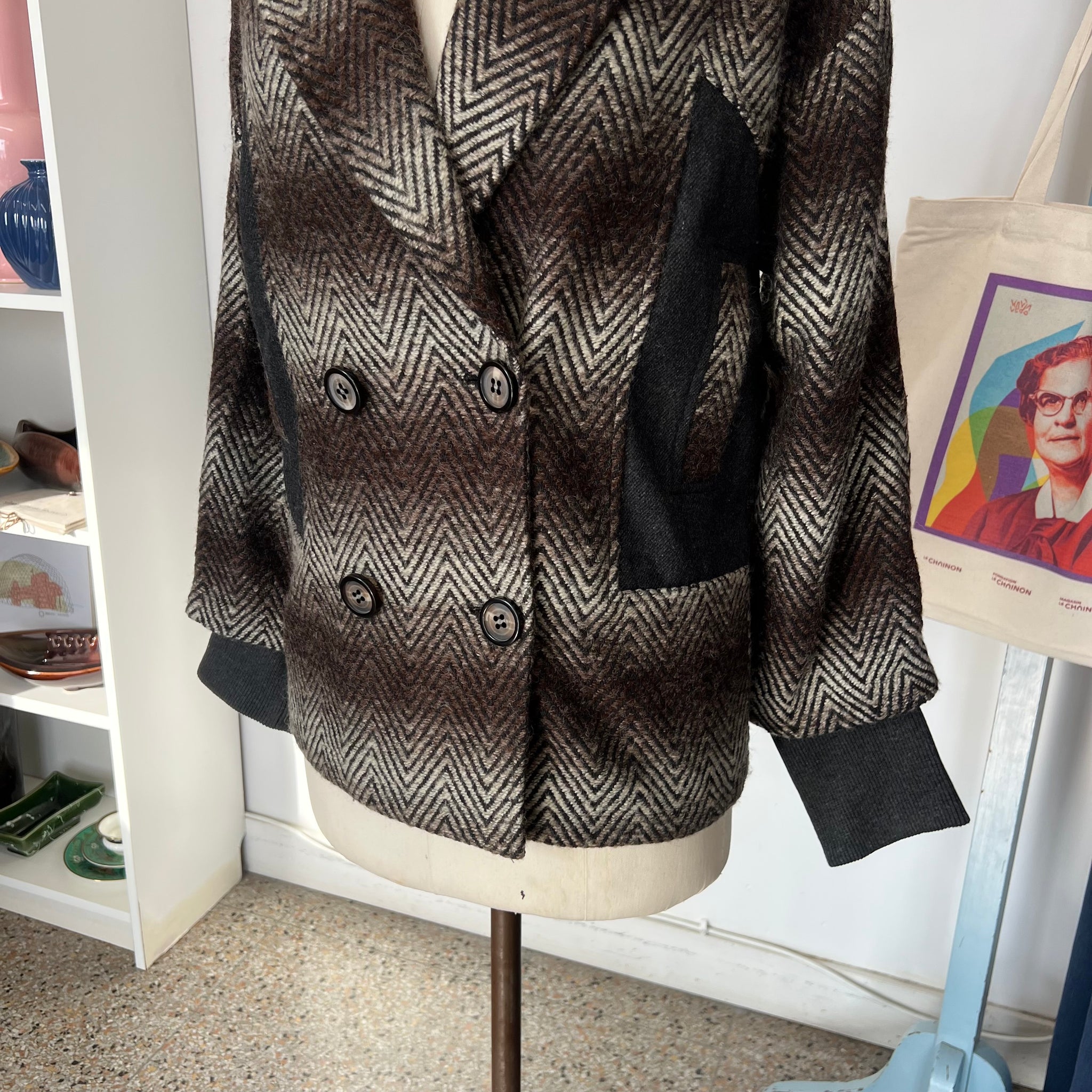 Veste ou manteau court mi-saison de la marque Covet this modèle herringbone. S'attache avec deux boutons à l'avant, avec deux poches latérales, doublure et longues manches aux poignets côtelés.