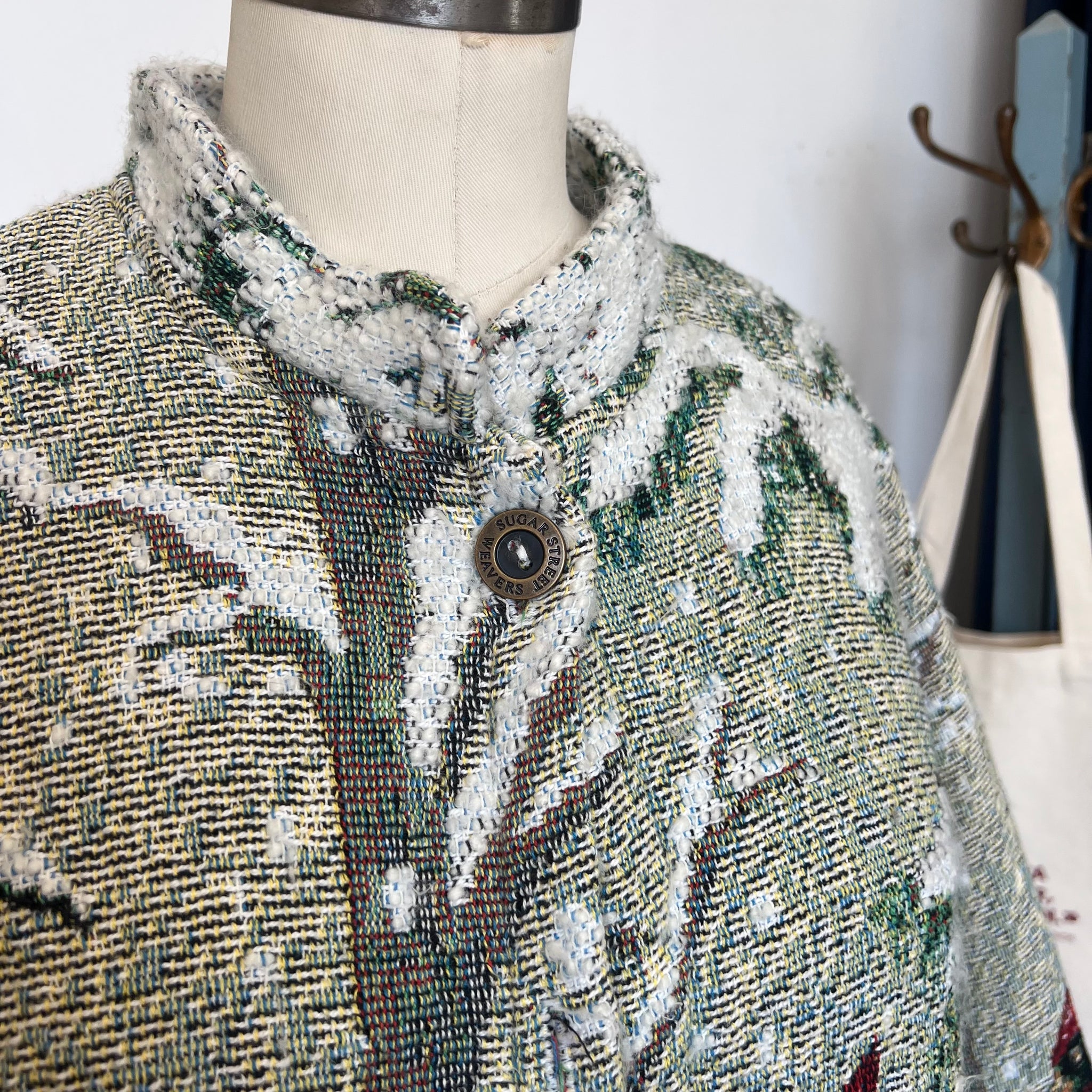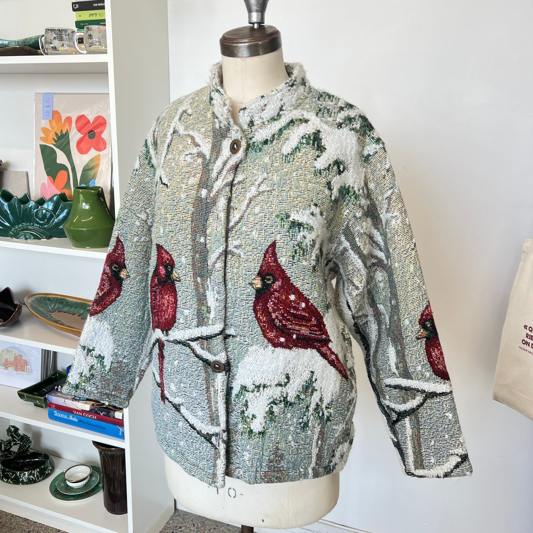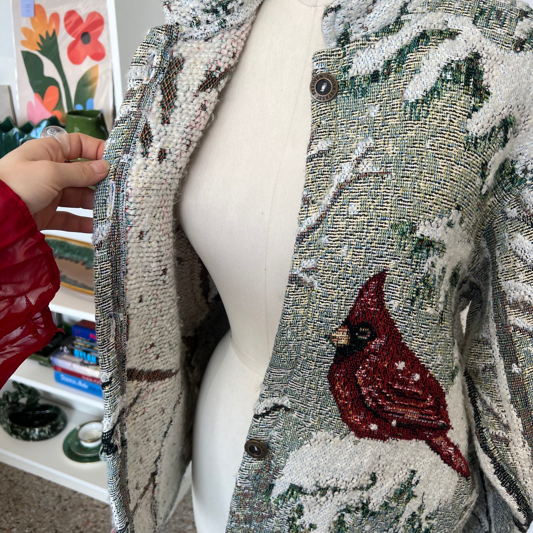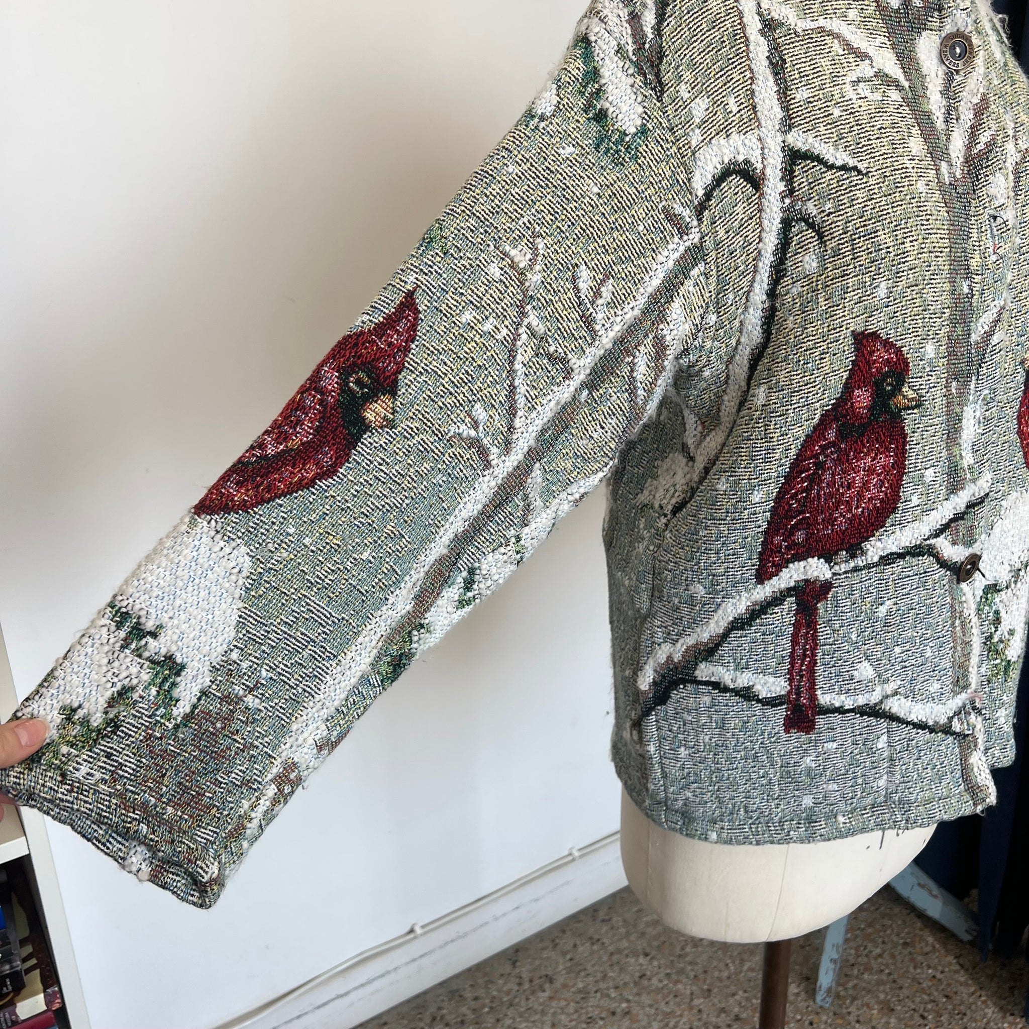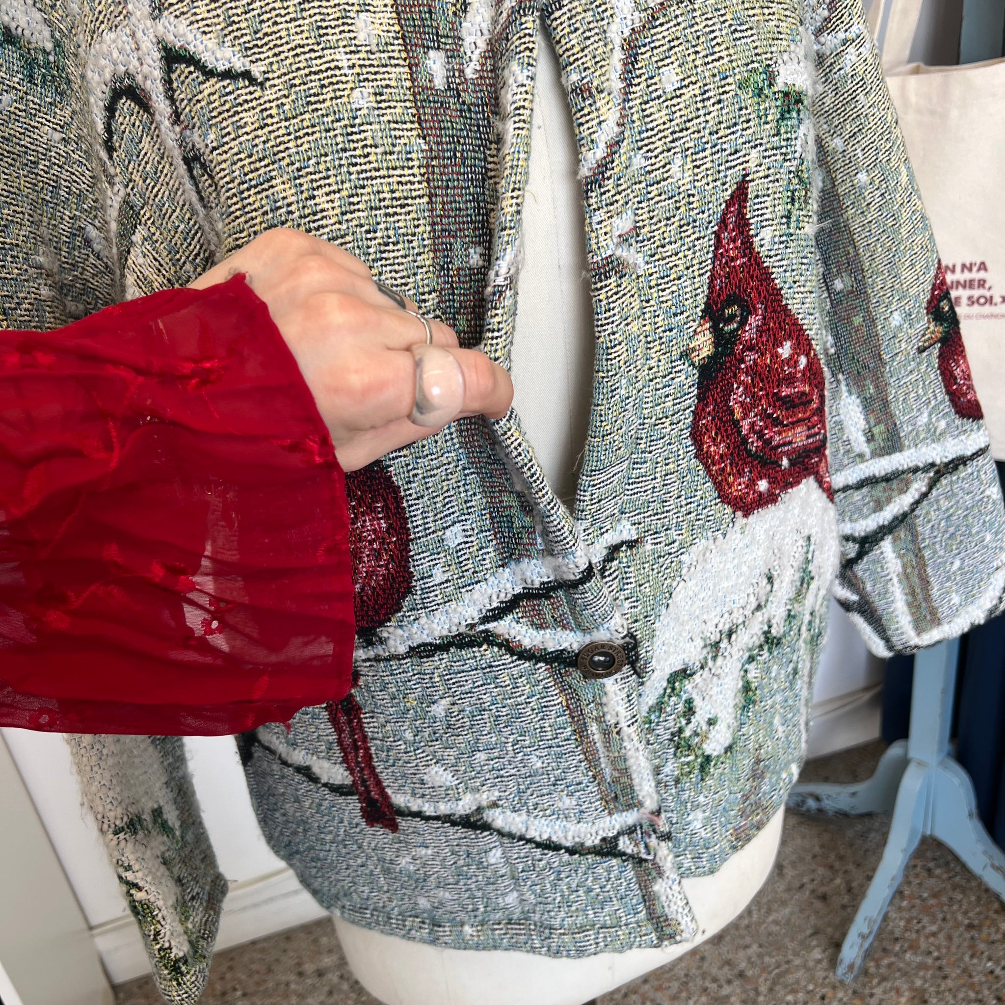 Veste vintage à boutons de la marque Sugar Street Weavers en tapisserie, motif d'oiseaux cardinaux.
