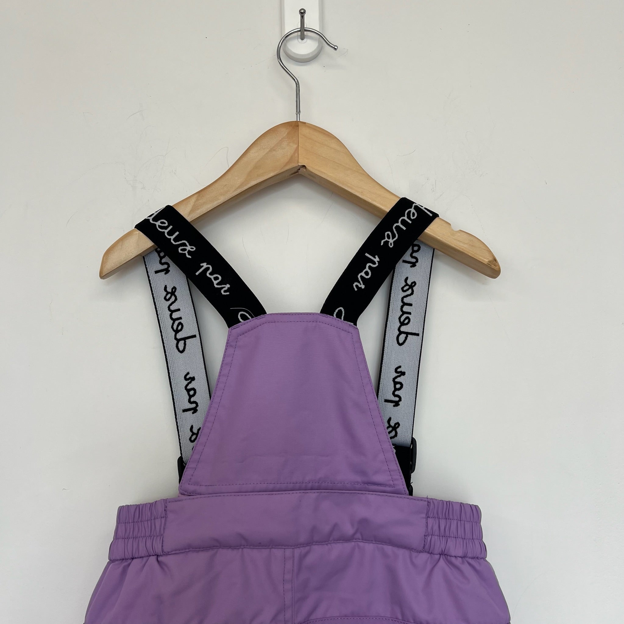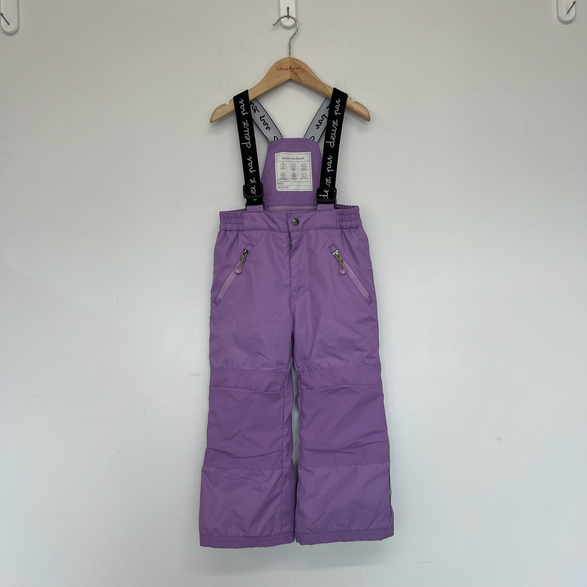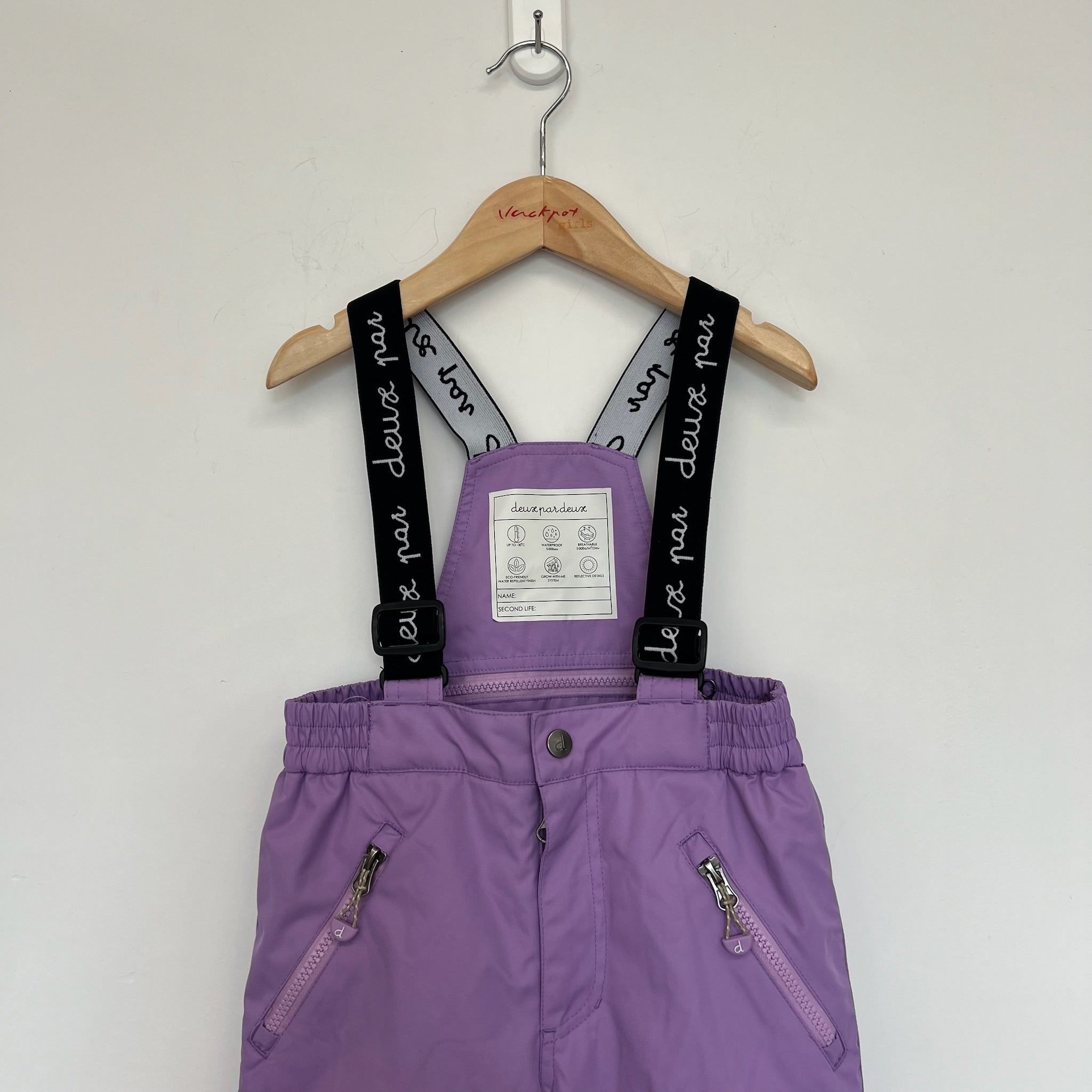 Pantalon de neige de couleur violet de la marque Deux par Deux. Chaud et résistant, conçu pour affronter l’hiver jusqu’à -30 °C (-22 °F). Isolation en fibres de polyester (170 g), tissu imperméable (5000 mm) et respirant (5000 g/m²/24h), idéal pour les activités hivernales. Résistance à l'usure : Jusqu’à 30 000 frottements. Traitement déperlant : BIONIC-FINISH® ECO, sans fluorocarbones (PFAS, PFOS, PFOA).
