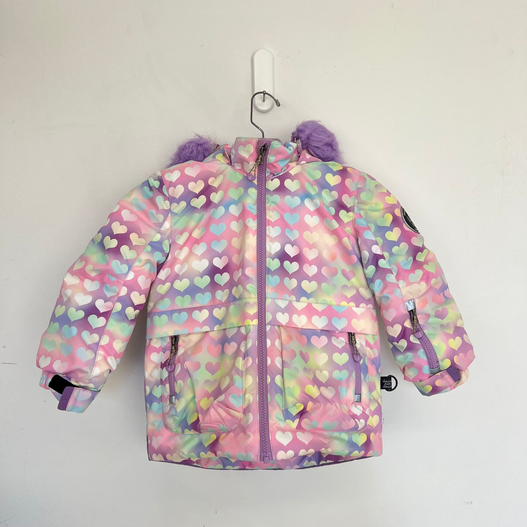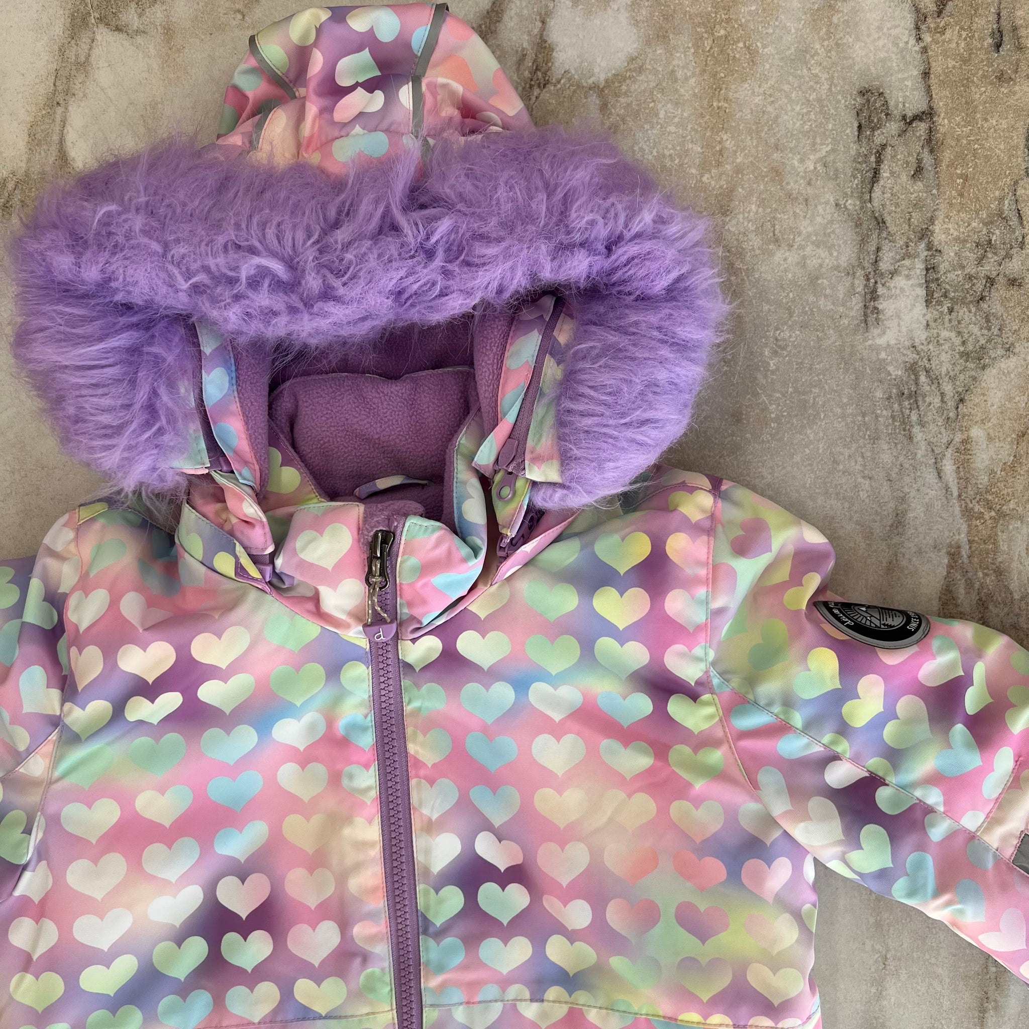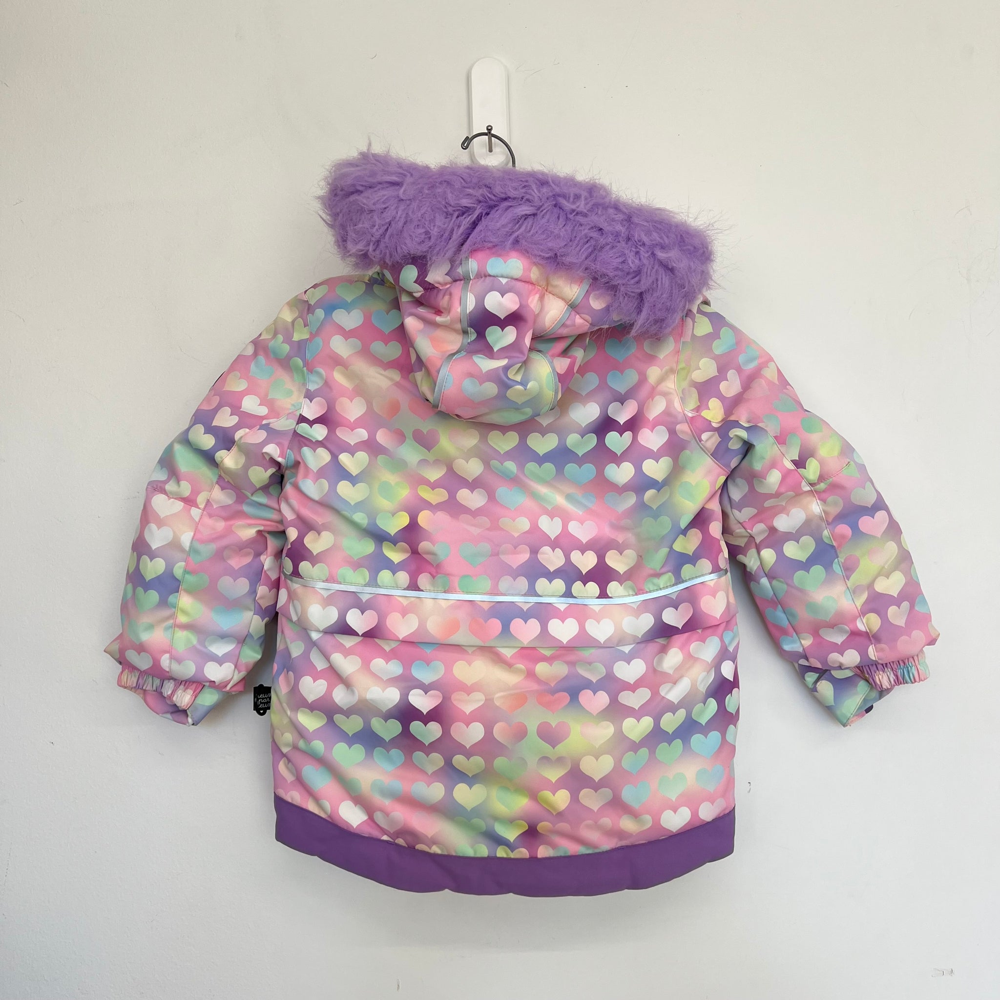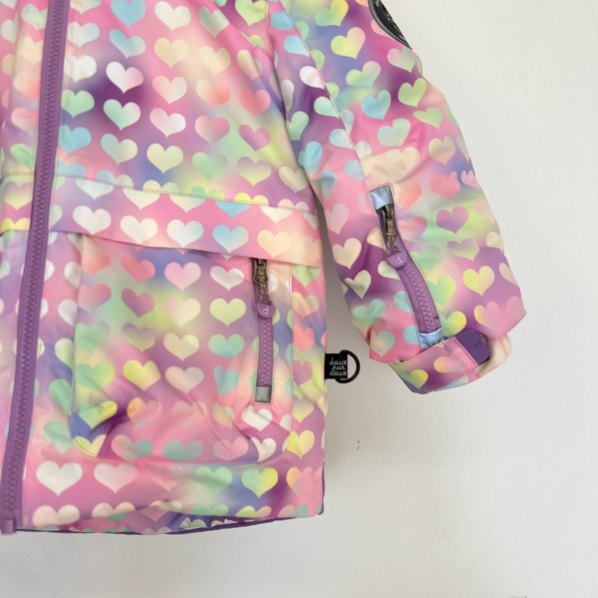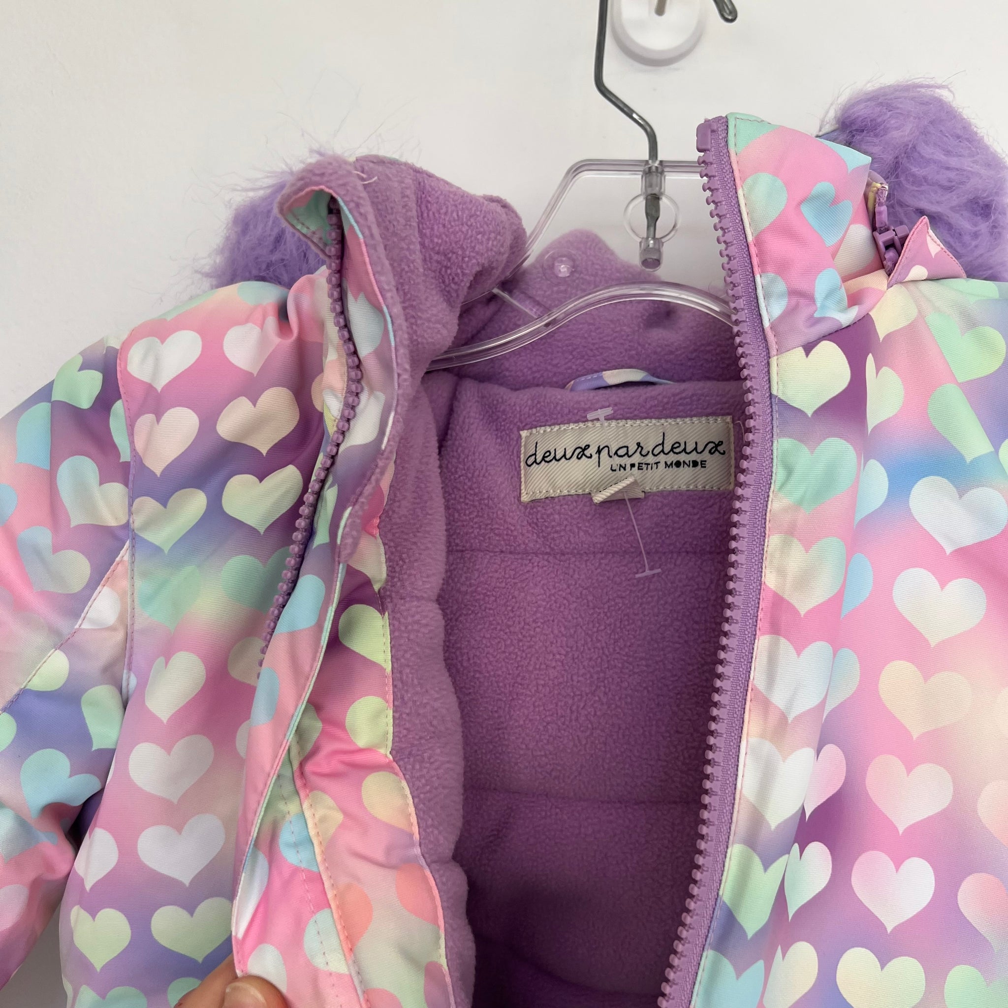 Manteau d'hiver aux imprimés cœurs de la marque Deux par Deux. Chaud et résistant, conçu pour affronter l’hiver jusqu’à -30 °C (-22 °F). Doublé en polar (corps, dos, col, capuchon), il offre une excellente isolation en fibres de polyester (capuchon 57 g, corps 170 g, manches 170 g). Le tissu est imperméable (5000 mm) et respirant (5000 g/m²/24h), idéal pour les jeux actifs et les sports d’hiver. Capuchon amovible et ajustable, avec fausse fourrure détachable