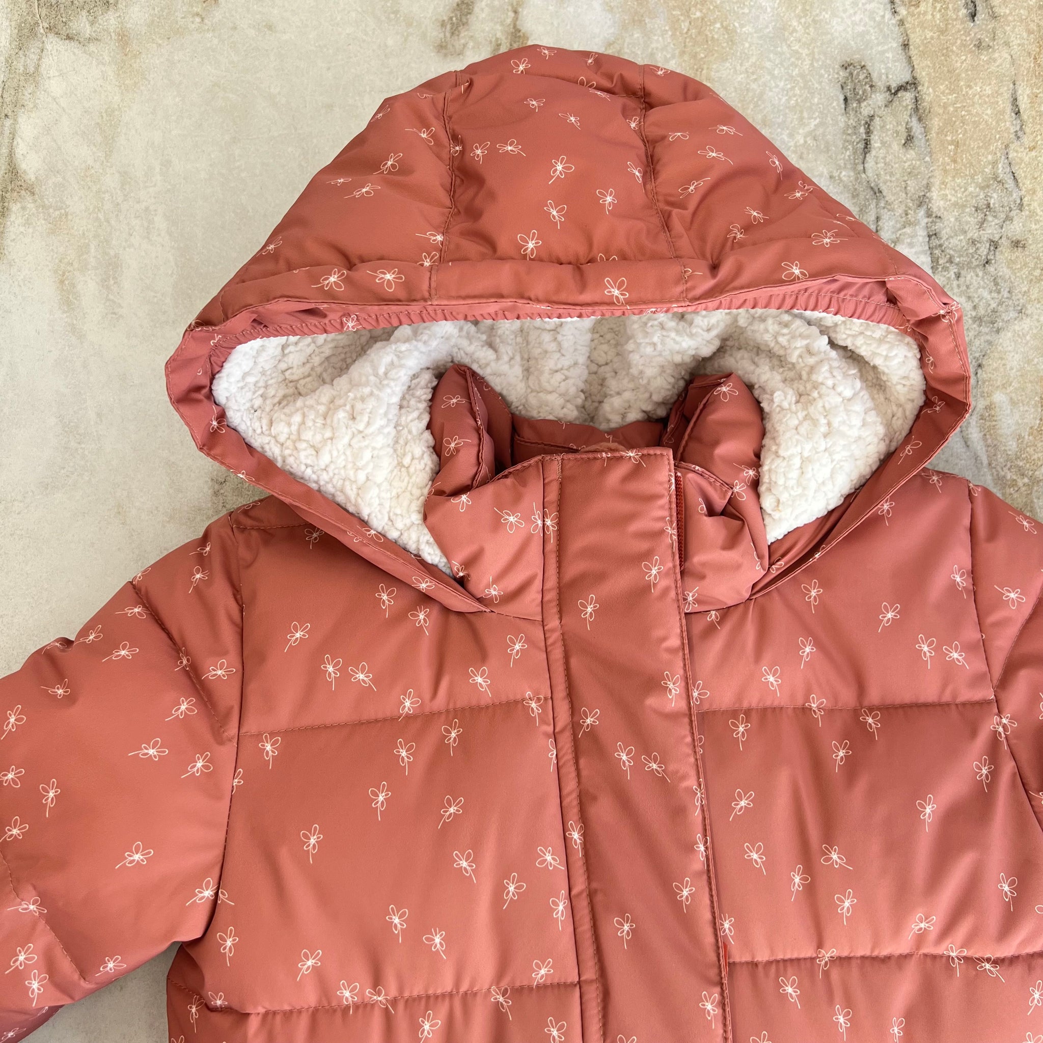 Manteau d'hiver long rose avec petites fleurs de la marque Deux par Deux. Chaud et résistant, conçu pour affronter l’hiver jusqu’à -30 °C (-22 °F). Doublé en polar (corps, dos, col, capuchon), il offre une excellente isolation en fibres de polyester (capuchon 57 g, corps 170 g, manches 170 g). Le tissu est imperméable (3000 mm) et respirant (3000 g/m²/24h), idéal pour les jeux actifs et les sports d’hiver. Capuchon doublé de fausse fourrure douillette.