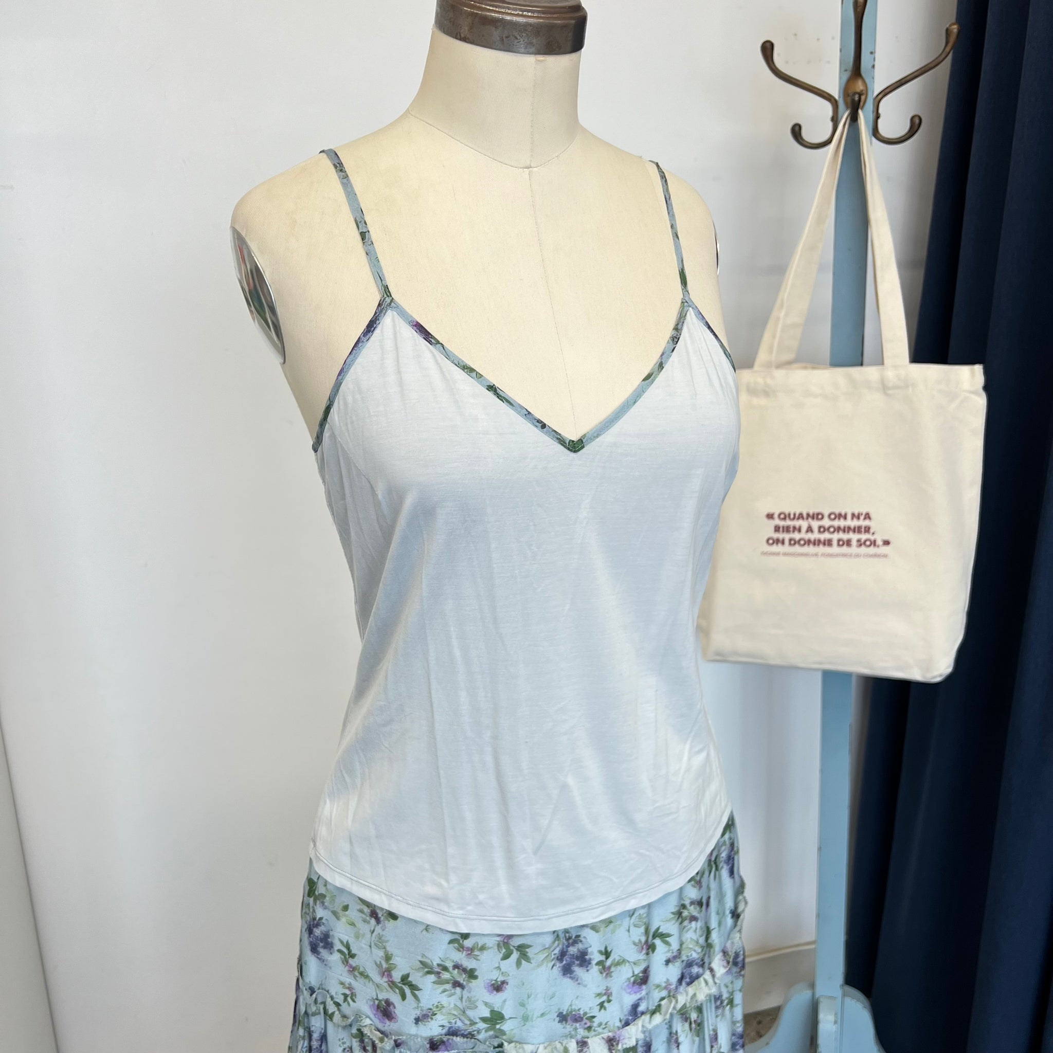 Ce chemisier romantique incarne l'essence même de Cami NYC. Avec ses détails féminins – col à volants et épaules plissées – il est orné d'un superbe imprimé floral bleu. Confectionné en mousseline de soie. Ce chemisier fantaisiste trouvera facilement sa place dans votre garde-robe estivale. Avec camisole amovible qui s'attache avec des bouton-pression pour en dessous. Jupe assortie également disponible. D'une valeur de plus de 200$.