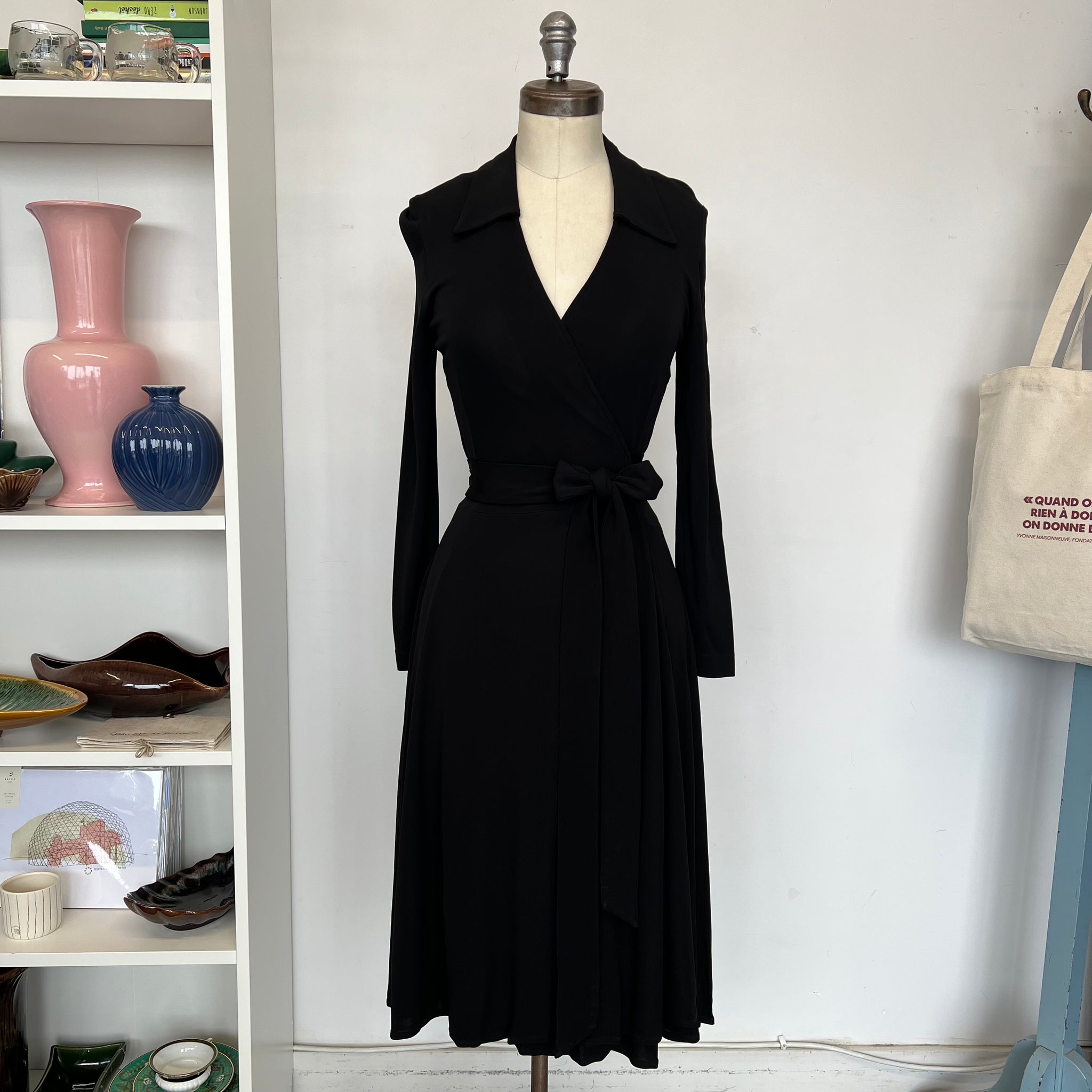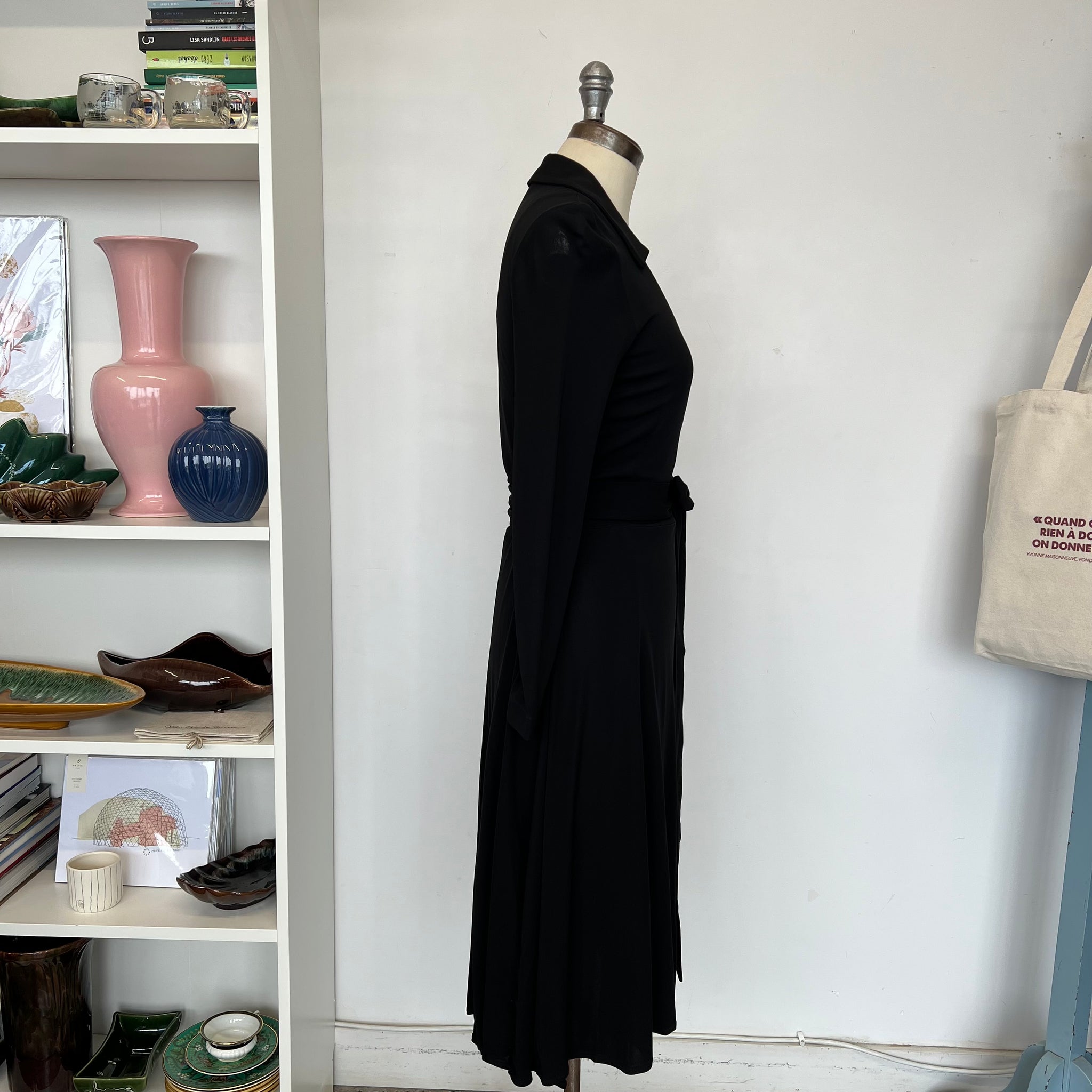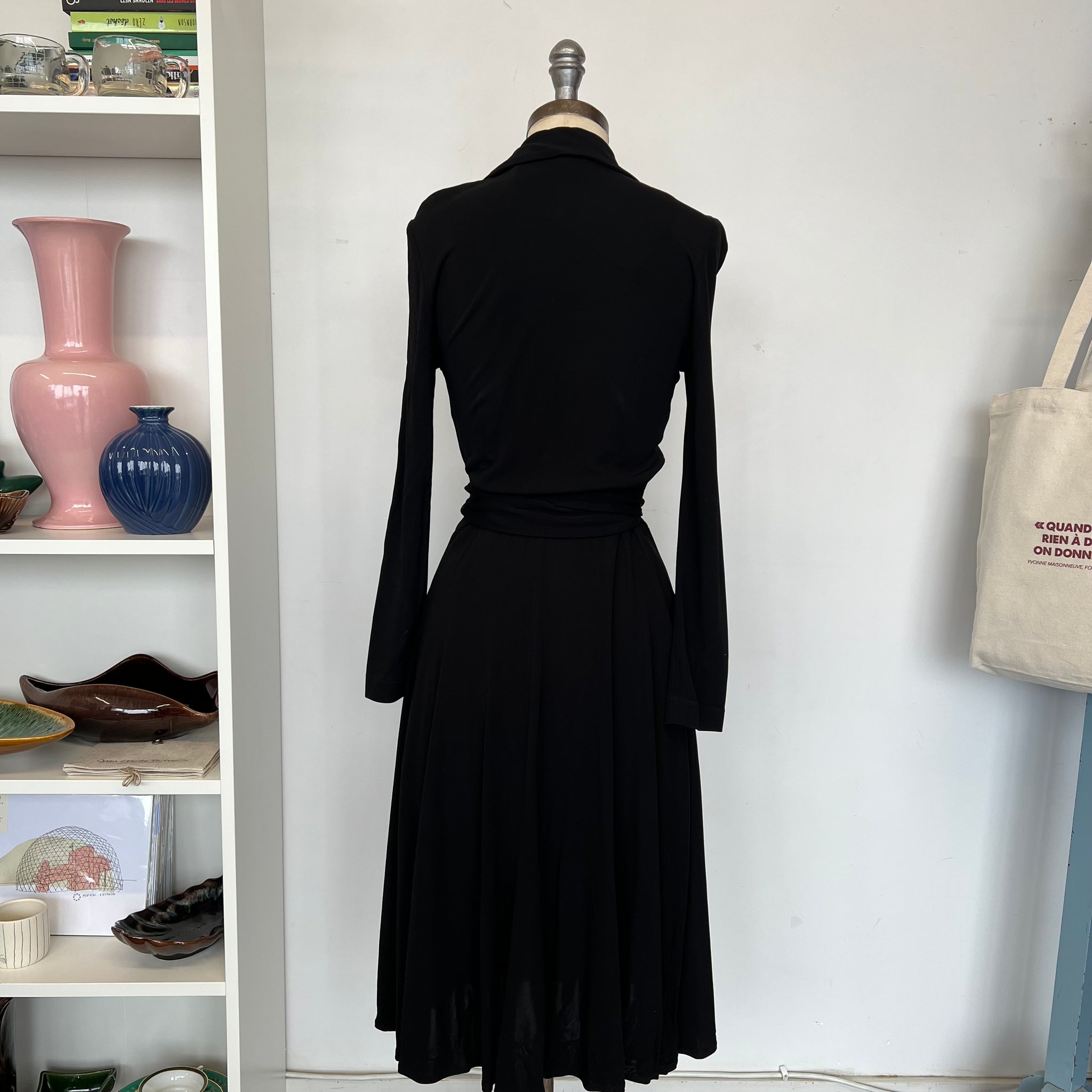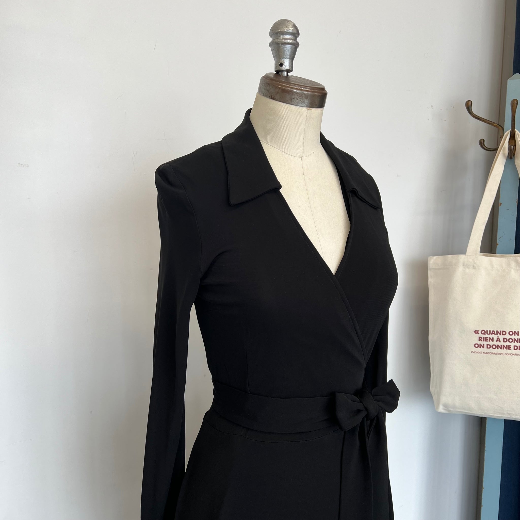 Robe cache-cœur de la marque Éditions de robes. Avec collet classique et ganses à la taille. Manches longues. tissu mince et extensible, semi-transparent.