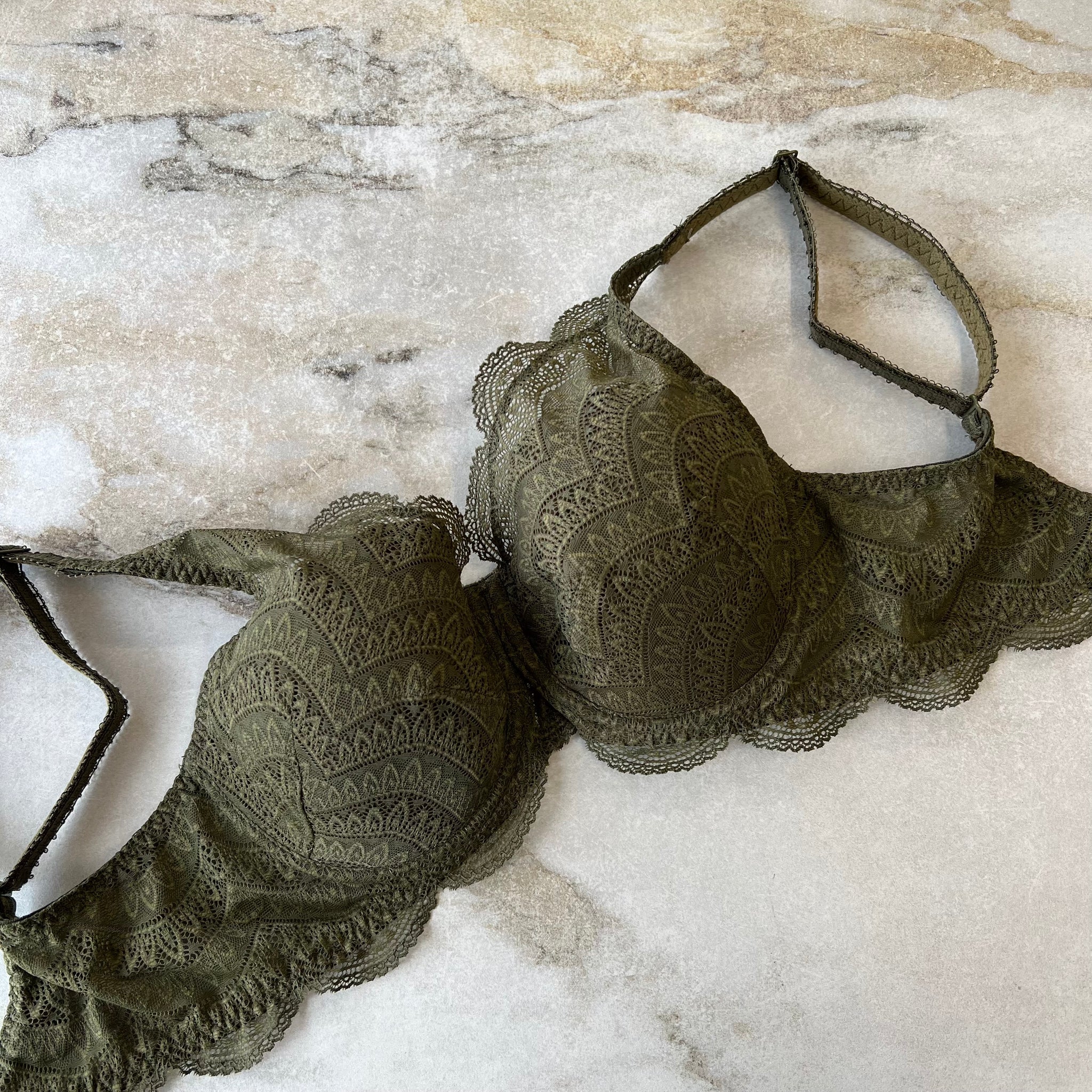 Soutien-gorge de la marque Simone Pérèle. Avec dentelle kaki, doublure et avec armatures. Sans rembourrage. Superposition de dentelle festonnée douce et de qualité supérieure, ornée de festons le long de l'encolure, sous la poitrine et au dos. Les bretelles en dentelle entièrement réglables sont conçues pour un maintien antidérapant. Deux façons de porter les bretelles : classique ou croisées. Fermeture à agrafes double au dos.