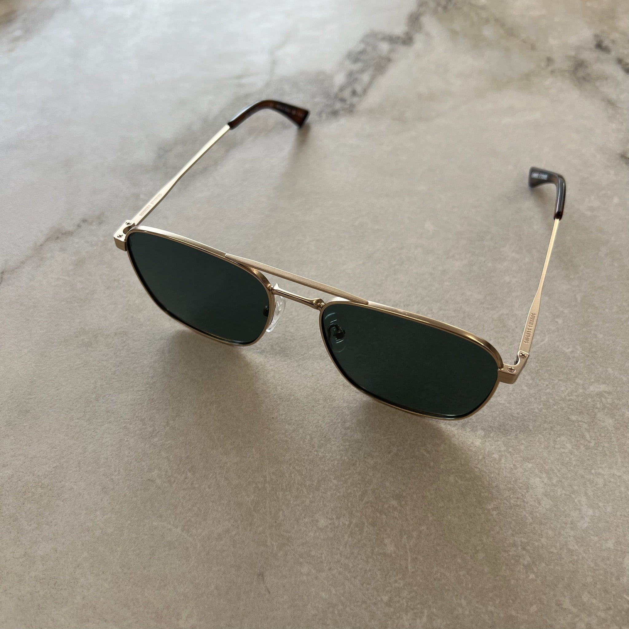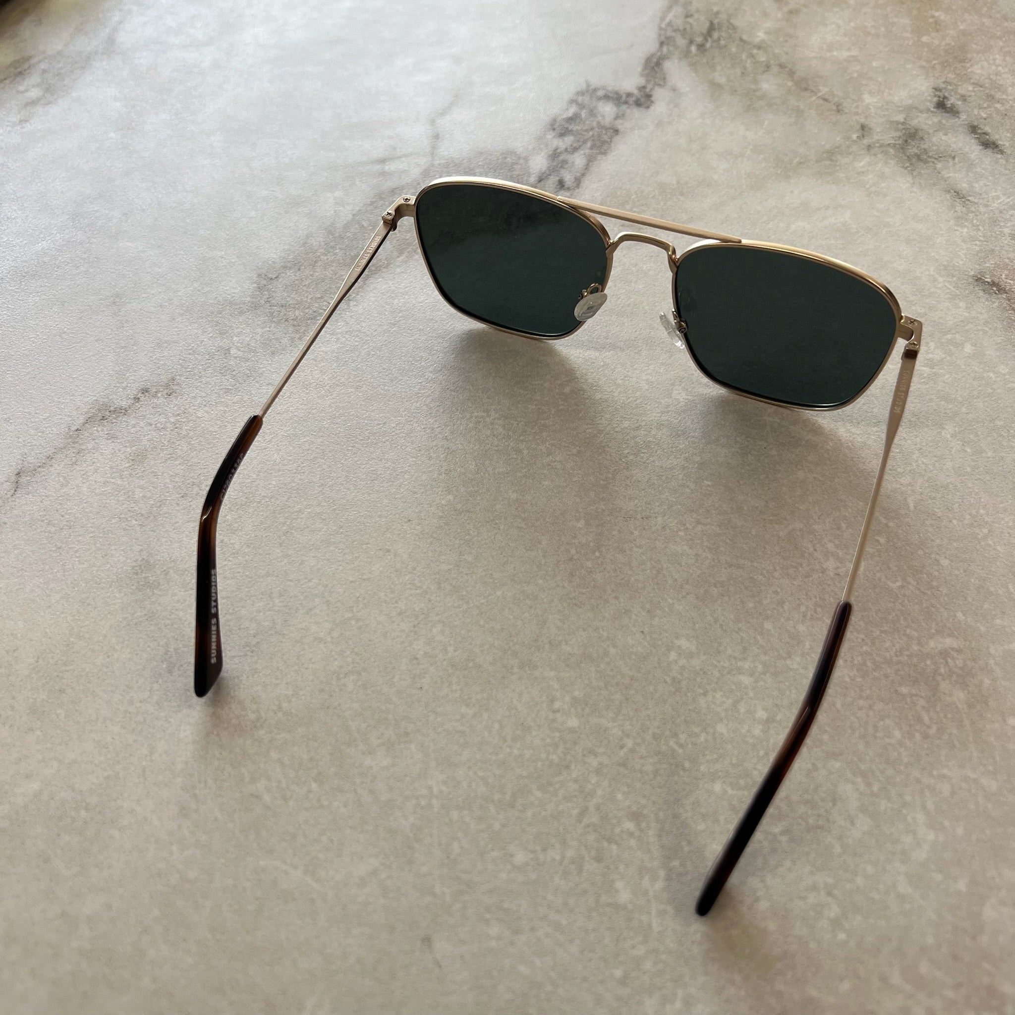 Lunettes de soleil signées Sunnies Studio modèle Pond. Monture métallique, branches avec finition translucide écaille de poisson et plaquettes transparentes. Verres avec une teinte bleutée. Aucune prescription