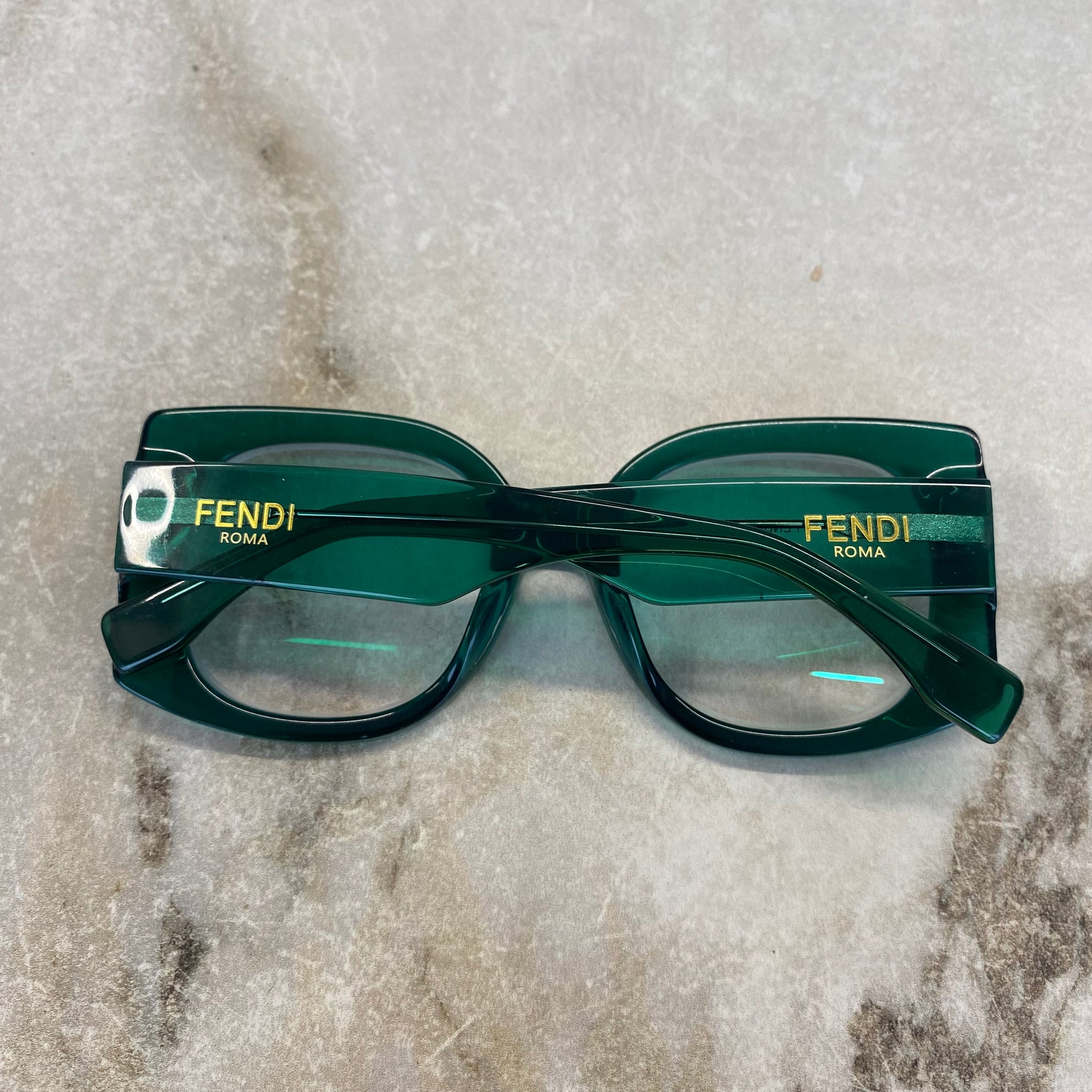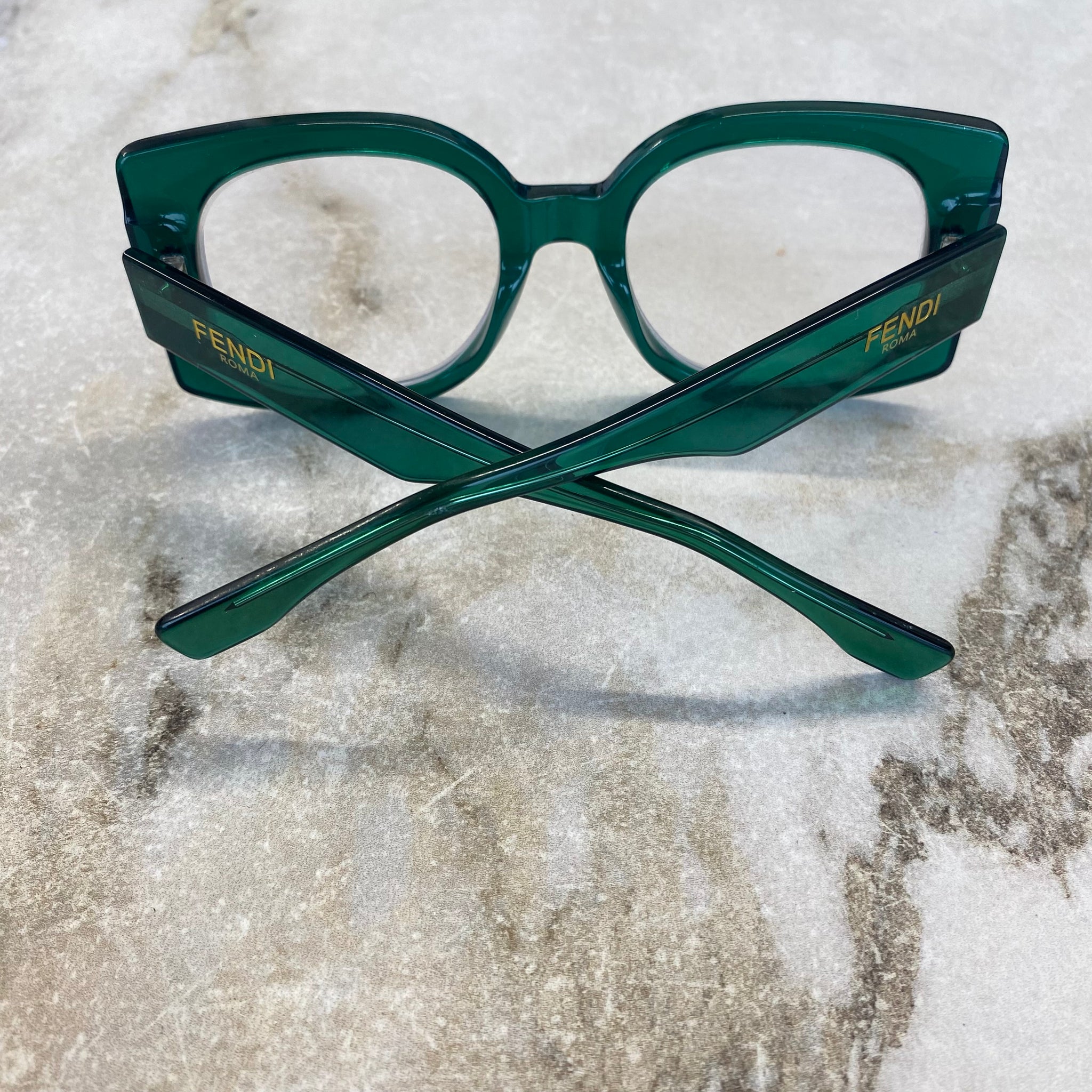 Lunettes de vue de la marque Fendi. Monture verte translucide avec détails dorés.